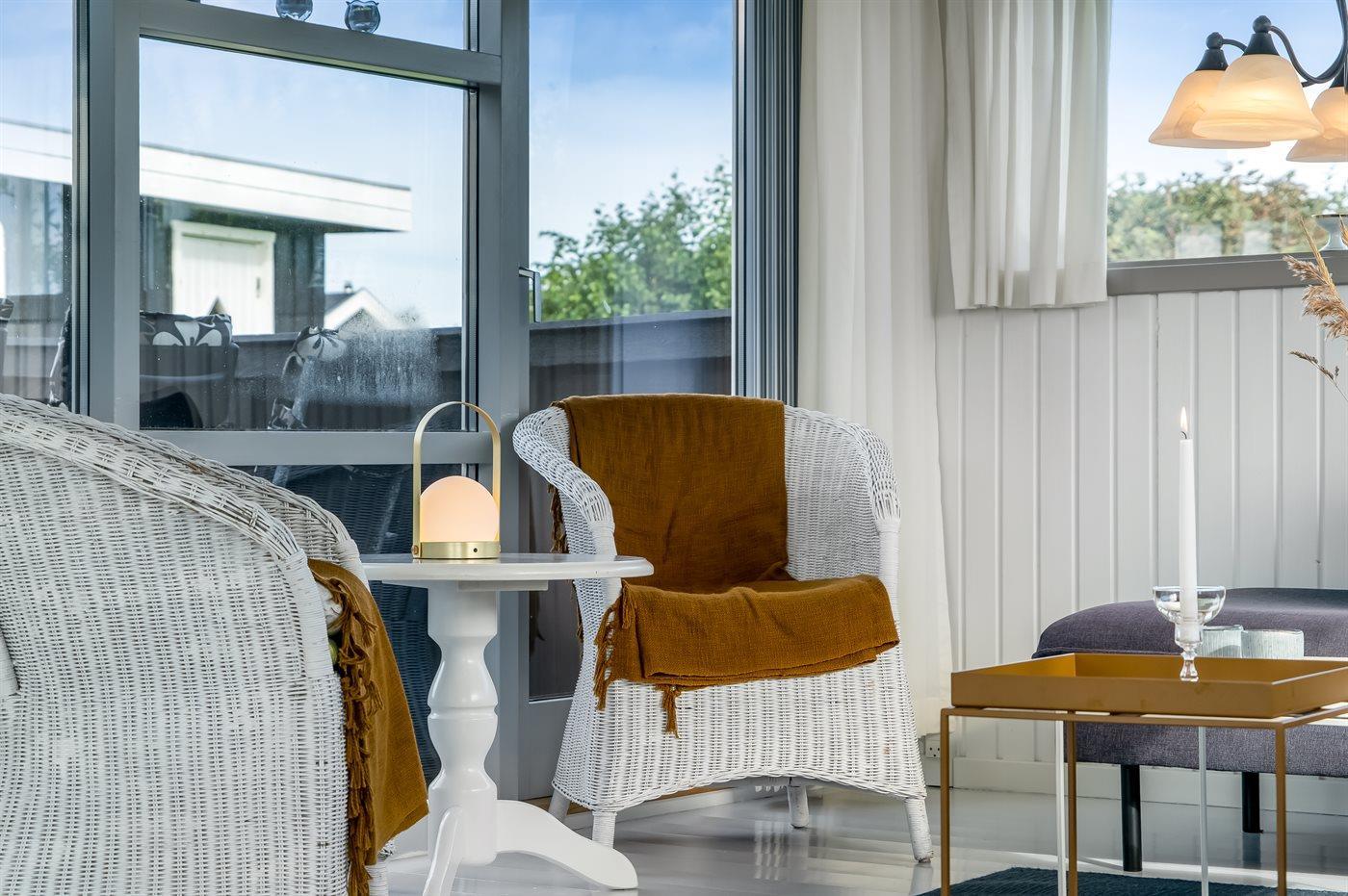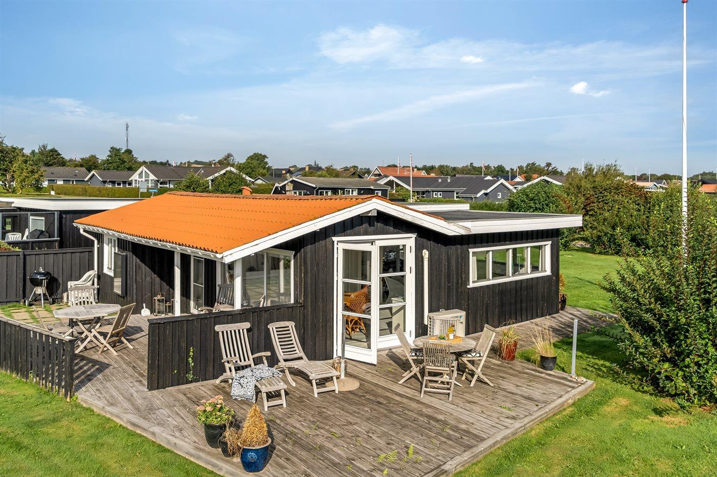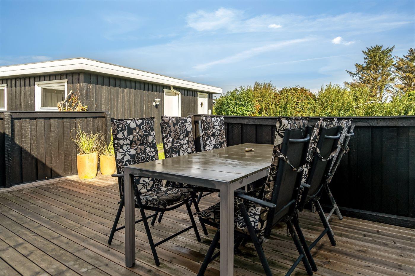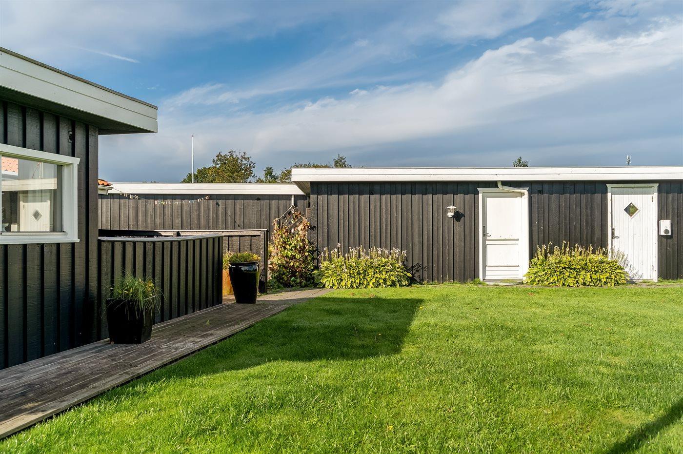 Ferieboligen er beliggende på en 730 m² stor havegrund. Der er 90 m til havet. Nærmeste forretning er beliggende i en afstand af 2100 m. Til ferieboligen hører åbent terrasseareal. Desuden er der overdækket terrasse. Grill til rådighed. Der er installeret stik til opladning af elbil. Type 2 stik. Med 11 kW ladeeffekt. Parkering ved ferieboligen.