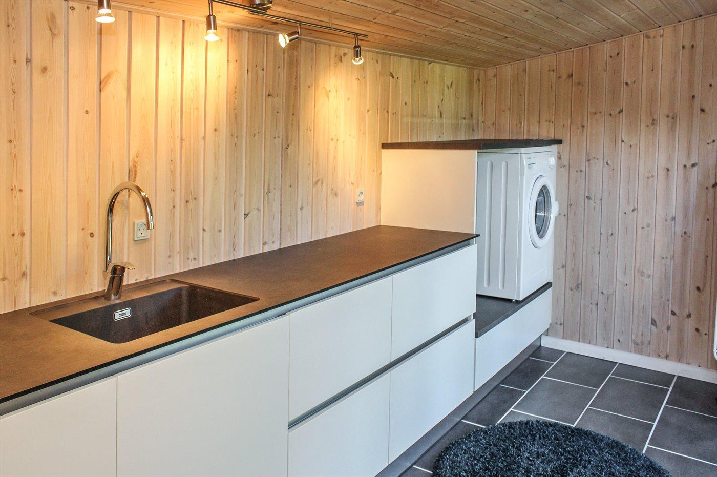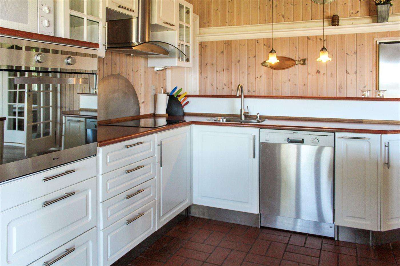 Køkkenet er udstyret med 1 køleskab. Der er 4 keramiske kogeplader, varmluftovn, mikrobølgeovn samt opvaskemaskine.