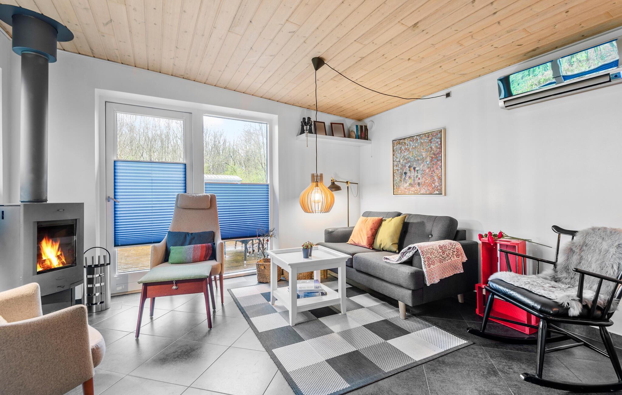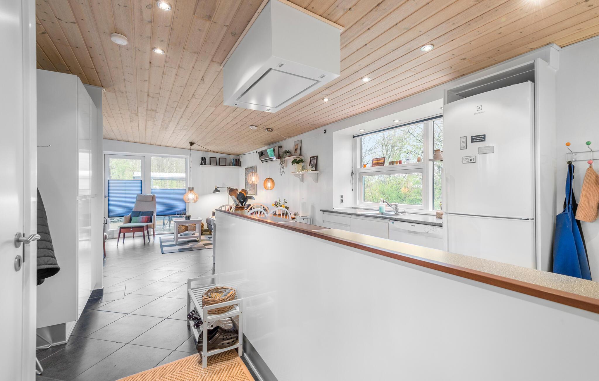 Tilbered nogle lækre retter i det funktionelle køkken og nyd dem ved spisebordet af træ, inden I lader aftenen gå på hæld i sofaen med hver jeres bog eller et spil kort til lyden af ildens blide knitren.