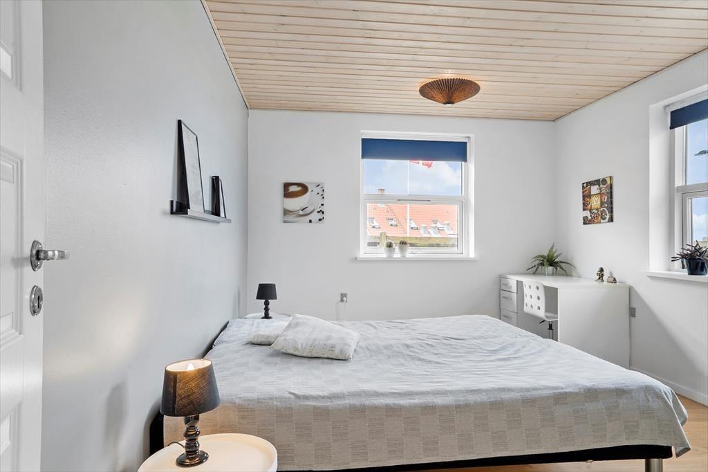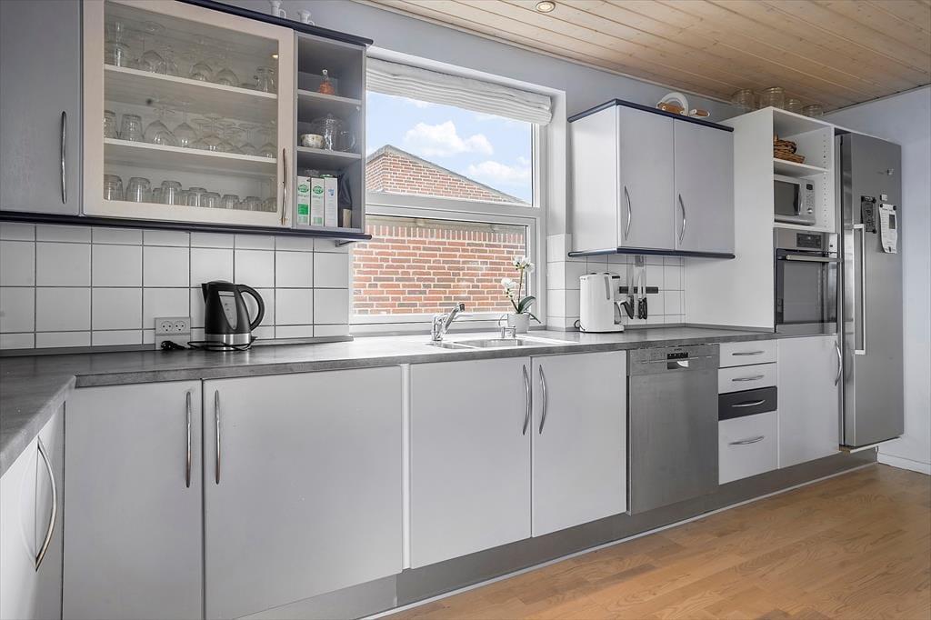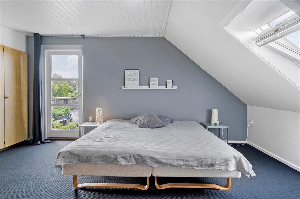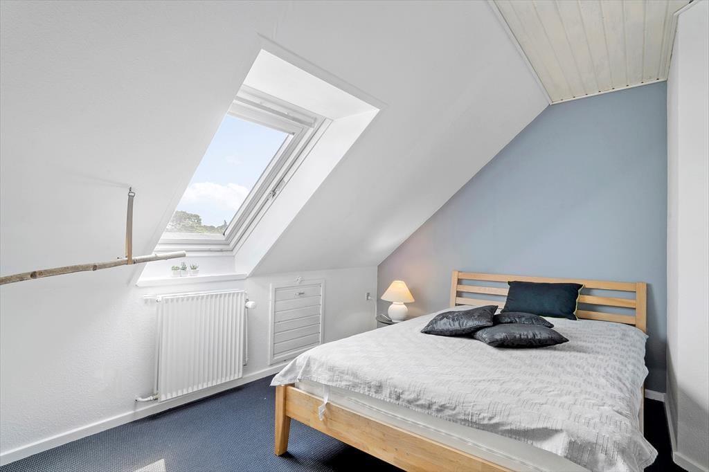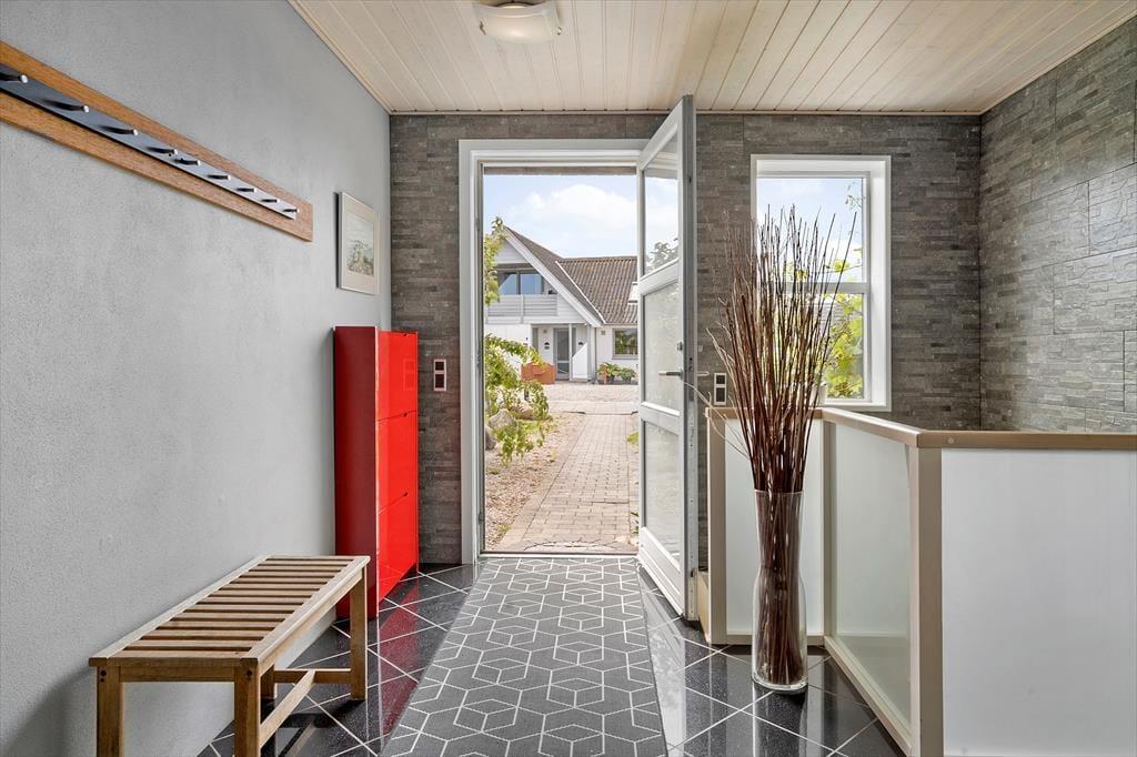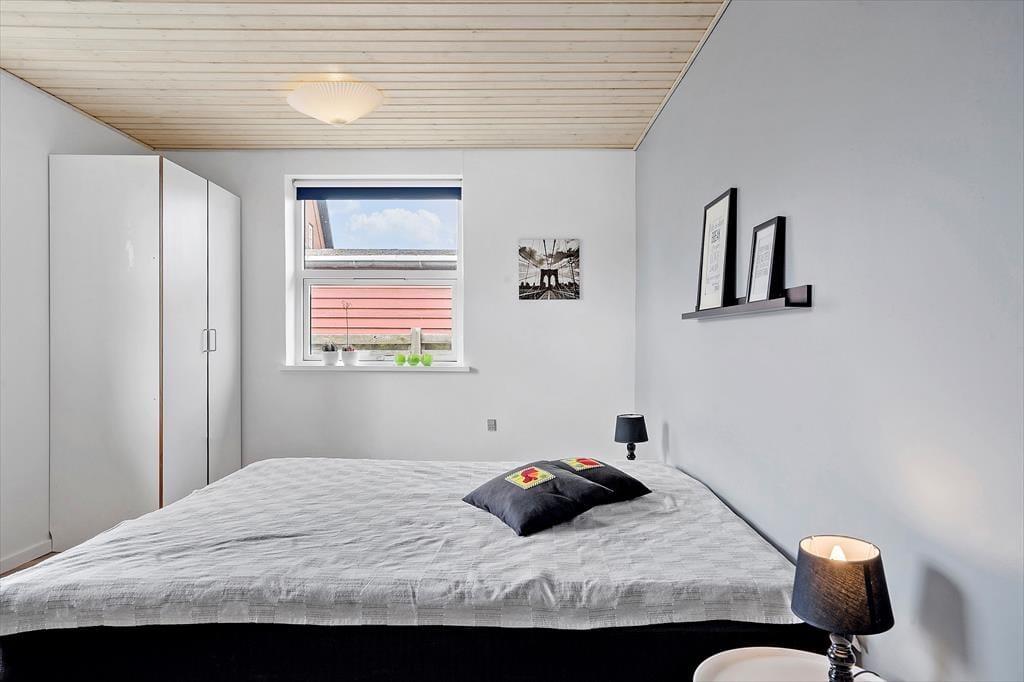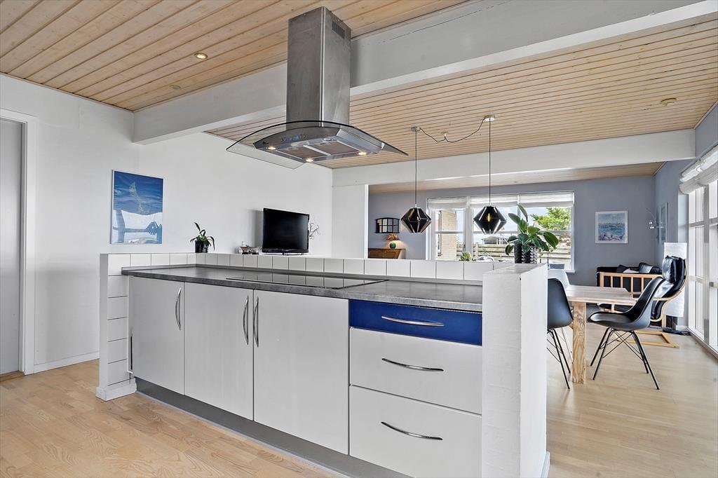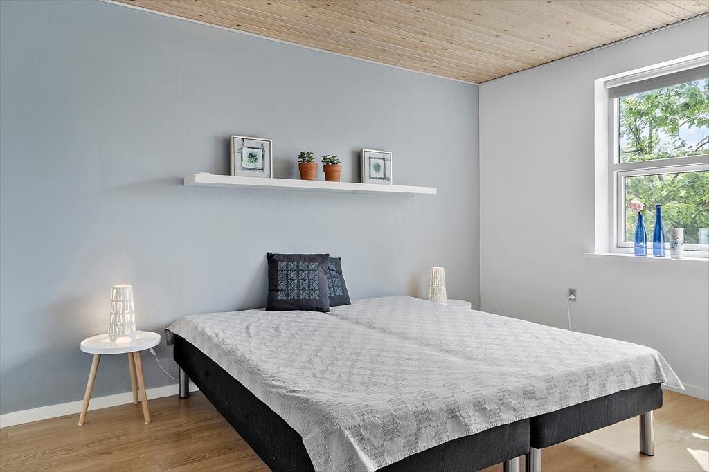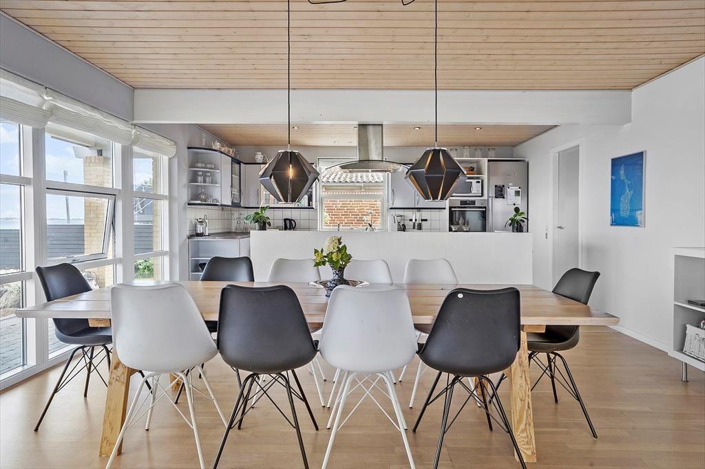 Hop af færgen og to minutter efter står I ved hoveddøren til sommerhuset, og ferien kan begynde. Sommerhuset her er i 2 etager og rummer 5 værelser med hver sin dobbeltseng og herudover 2 badeværelser. Veludstyret køkken med alt hvad der skal bruges til at lave mad til mange personer. Køkkenet er i åben forbindelse med spiseplads og sofahjørne. Fra spisebordet er der flot havudsigt og I kan holde øje med færgefarten til og fra Samsø.