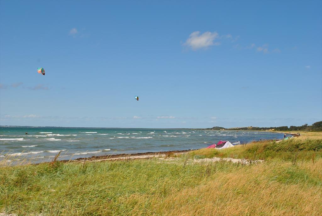 Den store sandkasse, stranden, er lige nedenfor sommerhuset, her kan børnene lege og de voksne nyde solen.