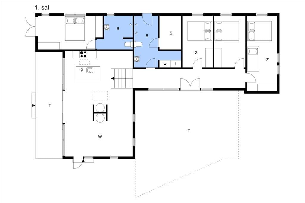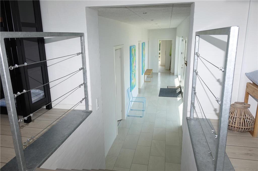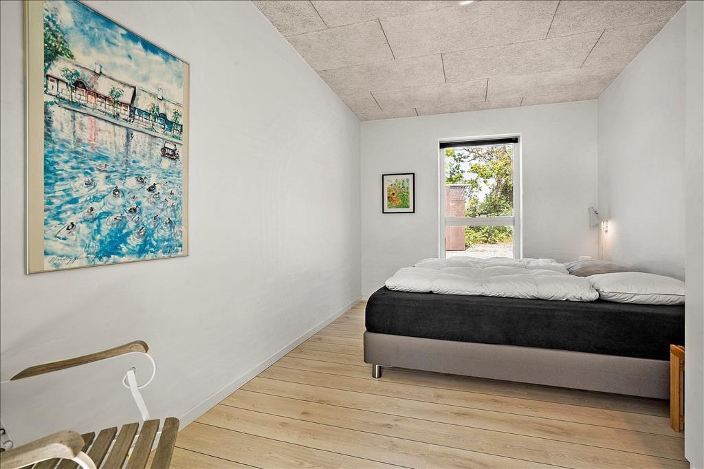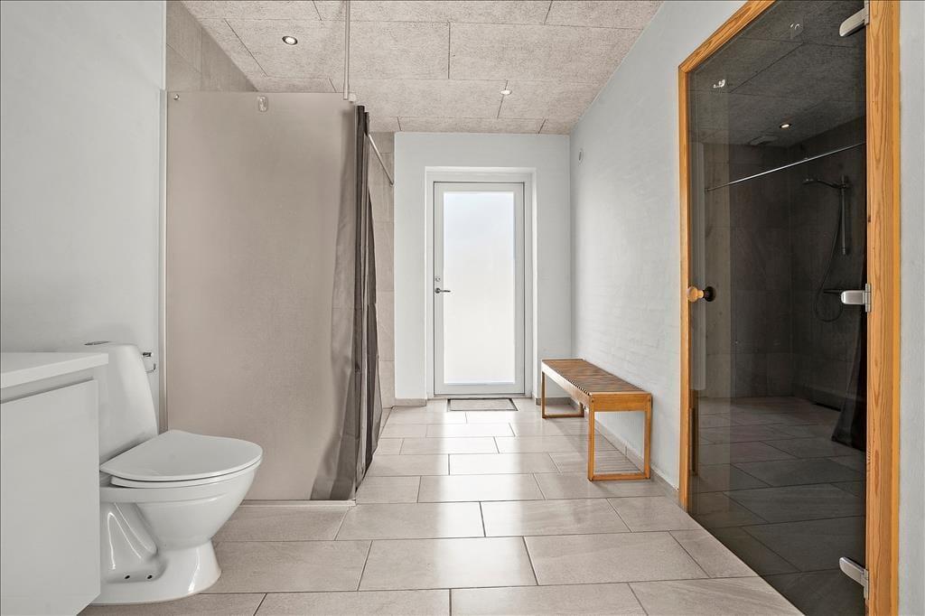 Resten af huset ligger i indgangsniveau – 7 trin ned fra alrum – med gang, bad og tre soverum. Badeværelset er herlig stort med to brusere i brusehjørnet, niche med vaskemaskine og tørretumbler samt sauna, og der er dør direkte ud til udendørs bruser. I alle husets soverum er der dobbelt boksmadras og skabe; i det største soverum desuden et ekstra tv.