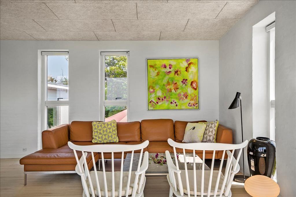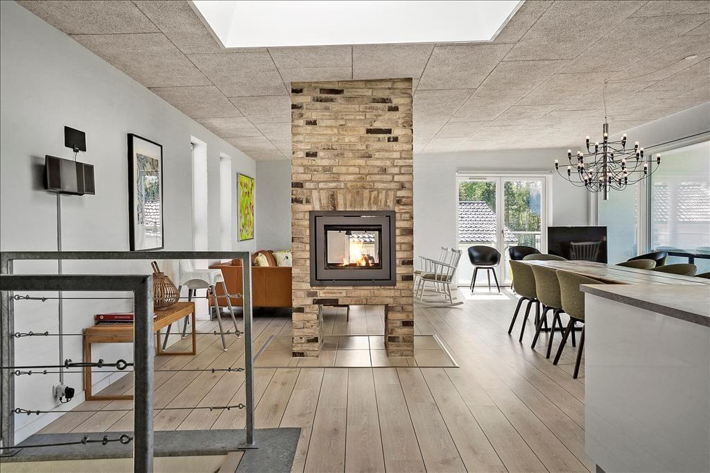 Alrummet har i hele langsiden mod vandet glasparti med skydedør til overdækket altan; lyddæmpende plader i loftet. I den flotte, murede skorsten midt i rummet er der glas både mod stue med lædersofa og mod spisebord med komfortable stole. Funktionel, veludstyret køkkendel med tagvindue over arbejdsøen. I dette plan desuden soverum samt bad med bruseniche.