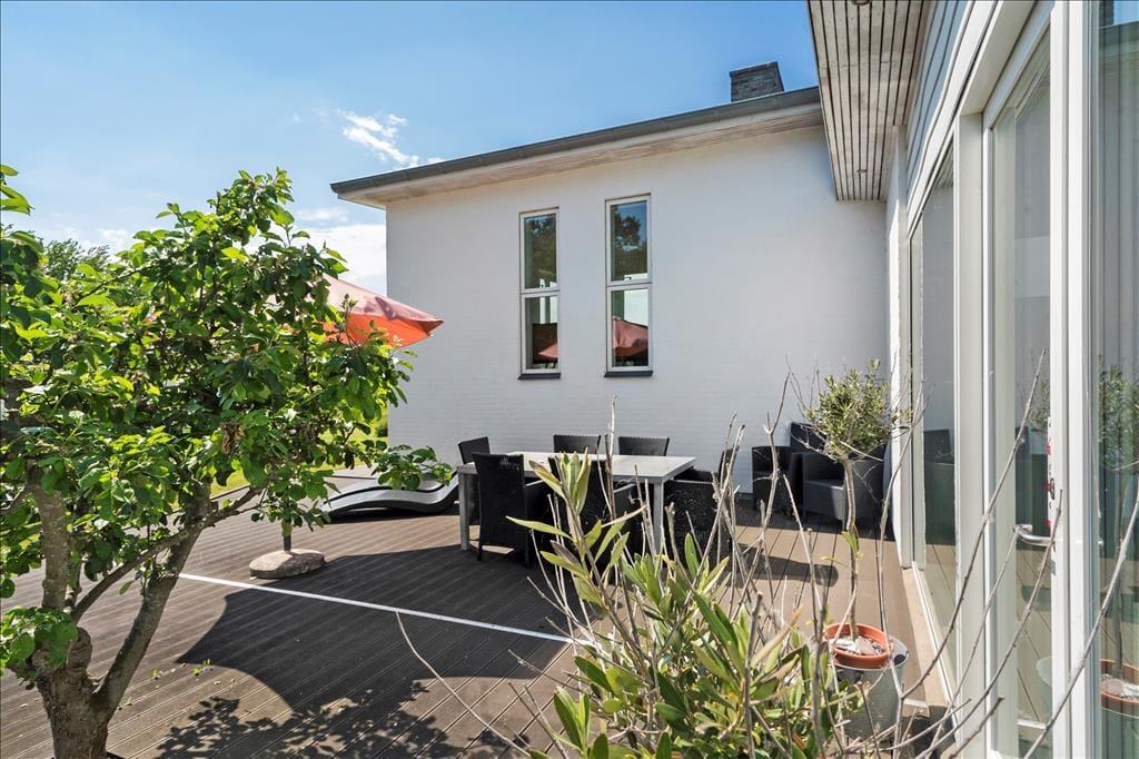 Stor terrasse ved indgangen fra syd med gode havemøbler inkl. to liggestole, en mindre terrasse på nord-siden og flisearealer hele vejen rundt om huset, så man altid kan finde en krog med sol, læ eller skygge.