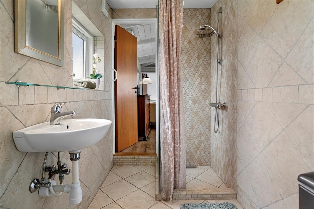 Badeværelset er indrettet med lyse fliser, og her er en god bruseniche samt vaskemaskine, så alle praktikaliteter er på plads til en god ferie i dette dejlige lyse og charmerende sommerhus.