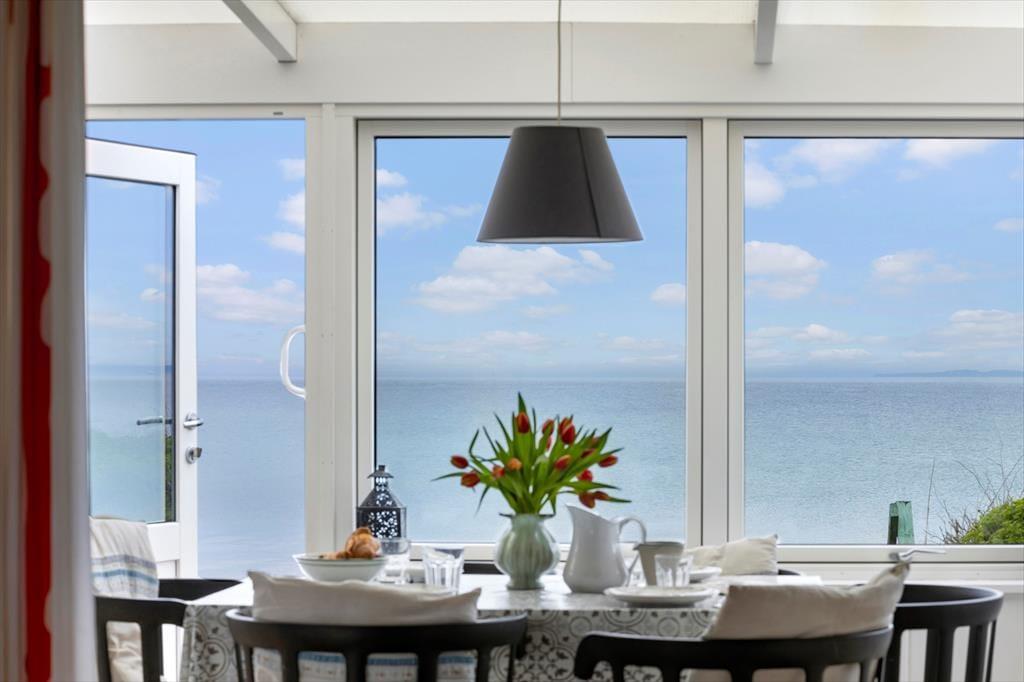 Køkkenet er rummeligt og med plads til at tilberede feriens måltider, og samtidig kan I nyde den fantastiske udsigt, når I står ved køkkenbordet. Et par trin op går man fra køkkenet og ind i stuen, der er husets hjerte og samlingsrum. I udestuen er der panoramavinduer, der giver den fulde udsigt over havet, og det er svært ikke at bruge mange timer på at nyde denne udsigt. I udestuen er spisebordet med plads til jer alle, så det giver mulighed for, at uanset hvordan vejret er, kan jeres måltider nydes med denne udsigt som baggrund. Ved siden af spisebordet er også et lille sofahjørne og en lænestol, hvor det er oplagt at slappe af med en god bog eller drikke en kop eftermiddagskaffe. Her kan I tilbringe mange timer sammen og nyde solnedgangen og den smukke udsigt til havet.