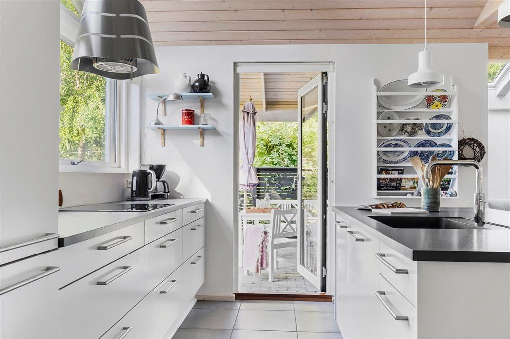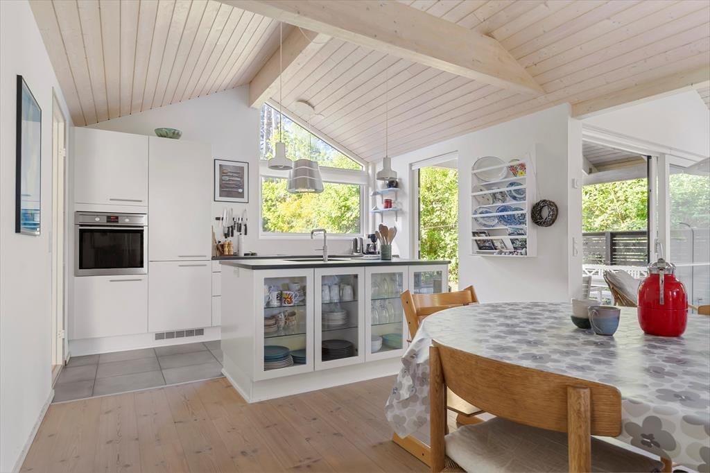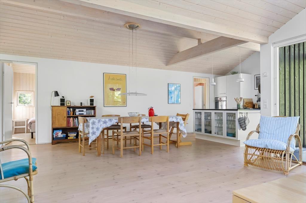 Med plads til op til 8 personer er der rig mulighed for at samle både familie og venner i dette hyggelige sommerhus på Samsø. Husets naturlige samlingspunkt er den kombinerede stue og køkken. Det åbne køkken gør det nemt at forberede måltider, mens I taler om dagens oplevelser med dem, der hygger sig i stuen. Køkkenet er både funktionelt og veludstyret med alle nødvendige faciliteter – og har en skøn udsigt til den store have. Spisebordet ligger i forlængelse af køkkenet og inviterer til fælles måltider eller brætspil. Fra spiseområdet kan I træde ud på den sydvendte terrasse gennem havedøren og nyde maden under åben himmel eller på den overdækkede terrasse med udsigt til haven og naturen. I stuen kan I slappe af med en god bog eller en film – det perfekte sted at lade roen sænke sig.