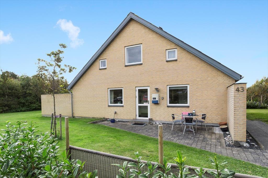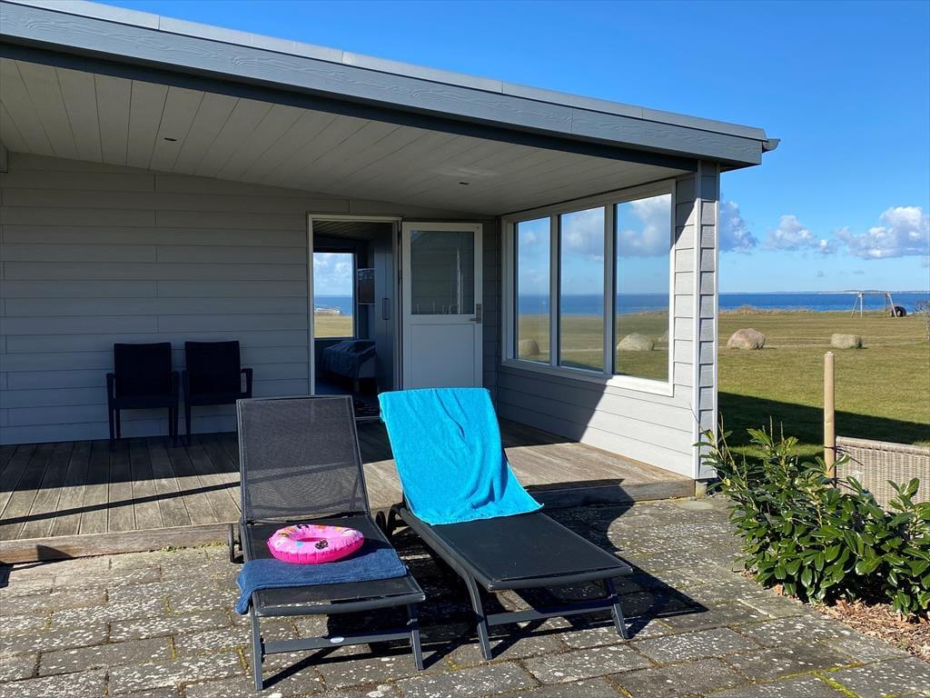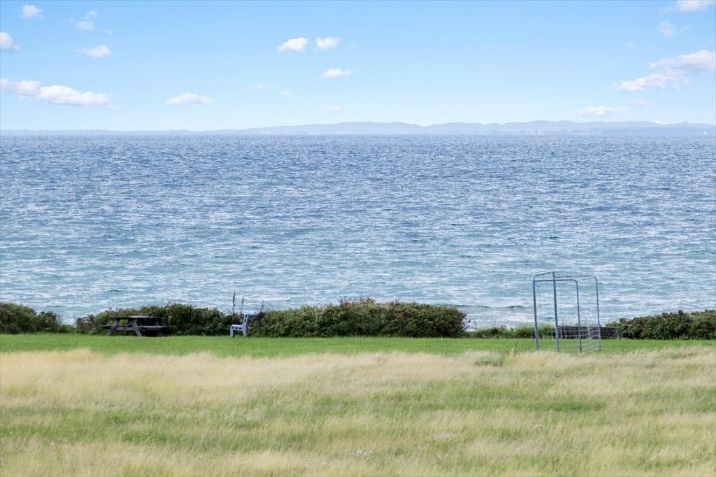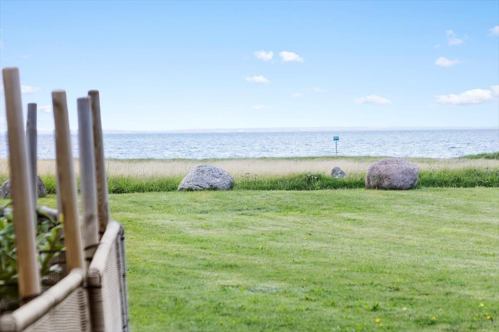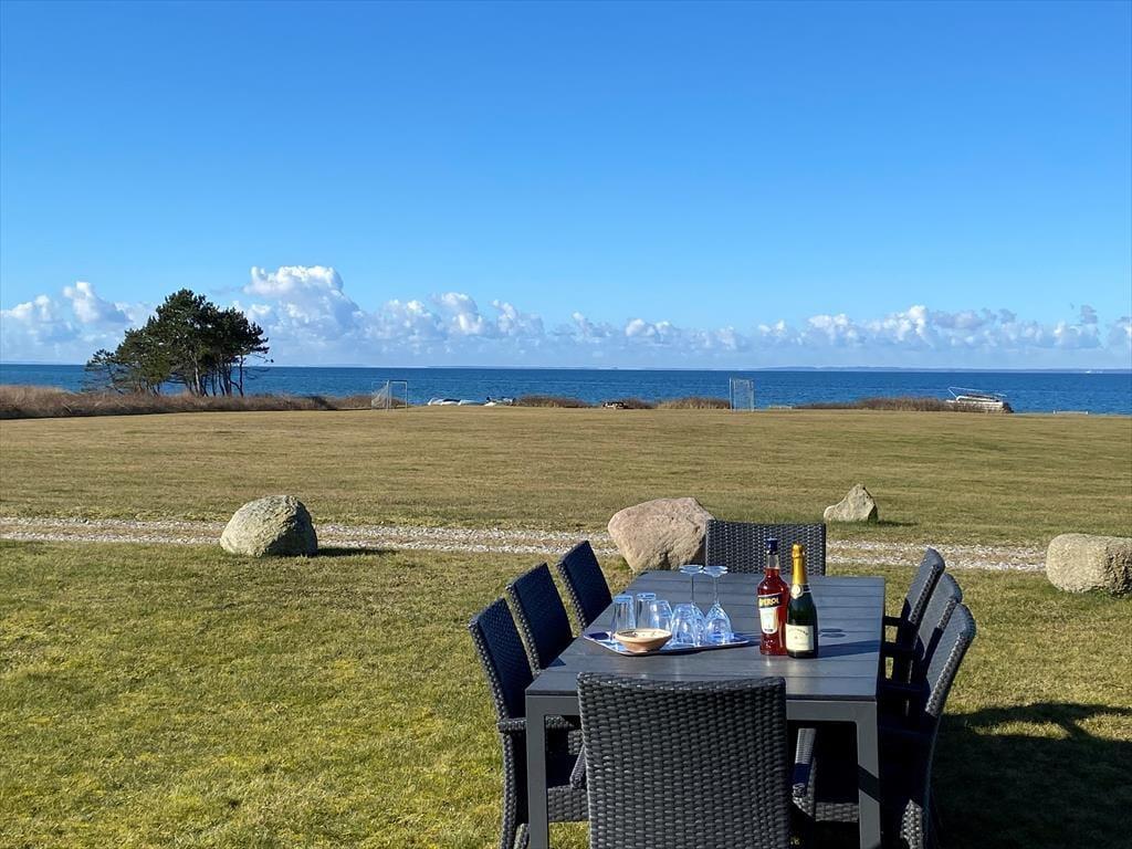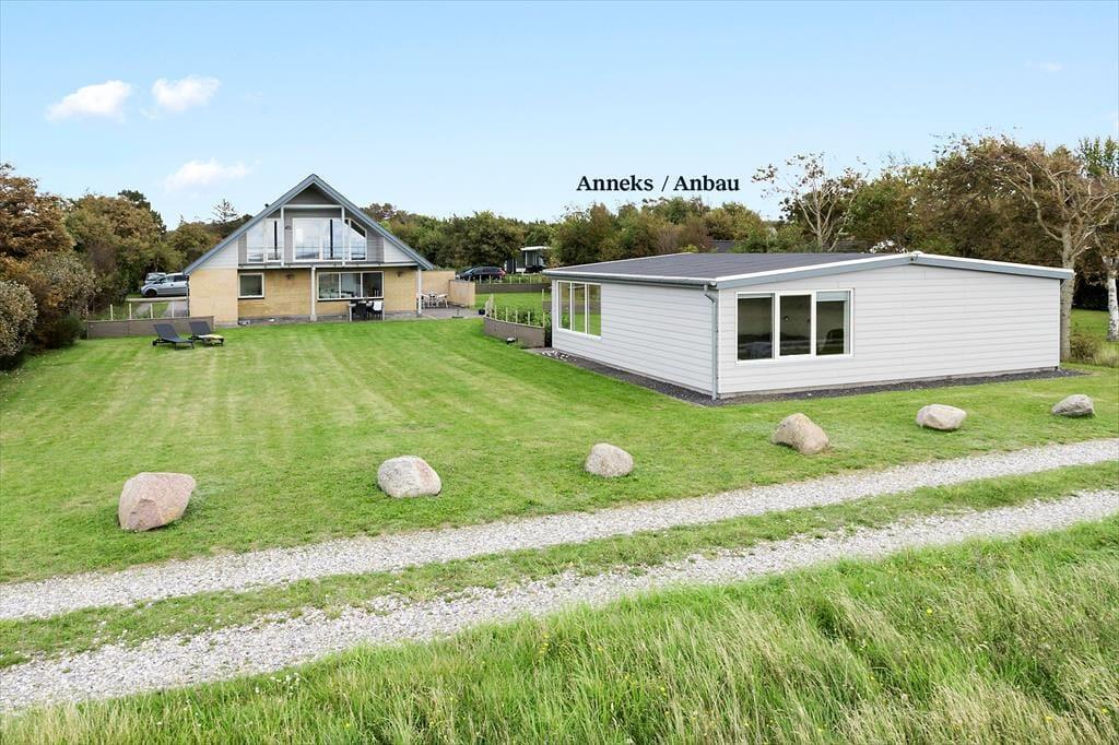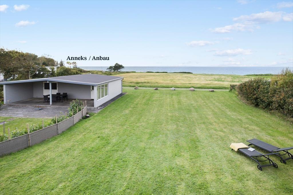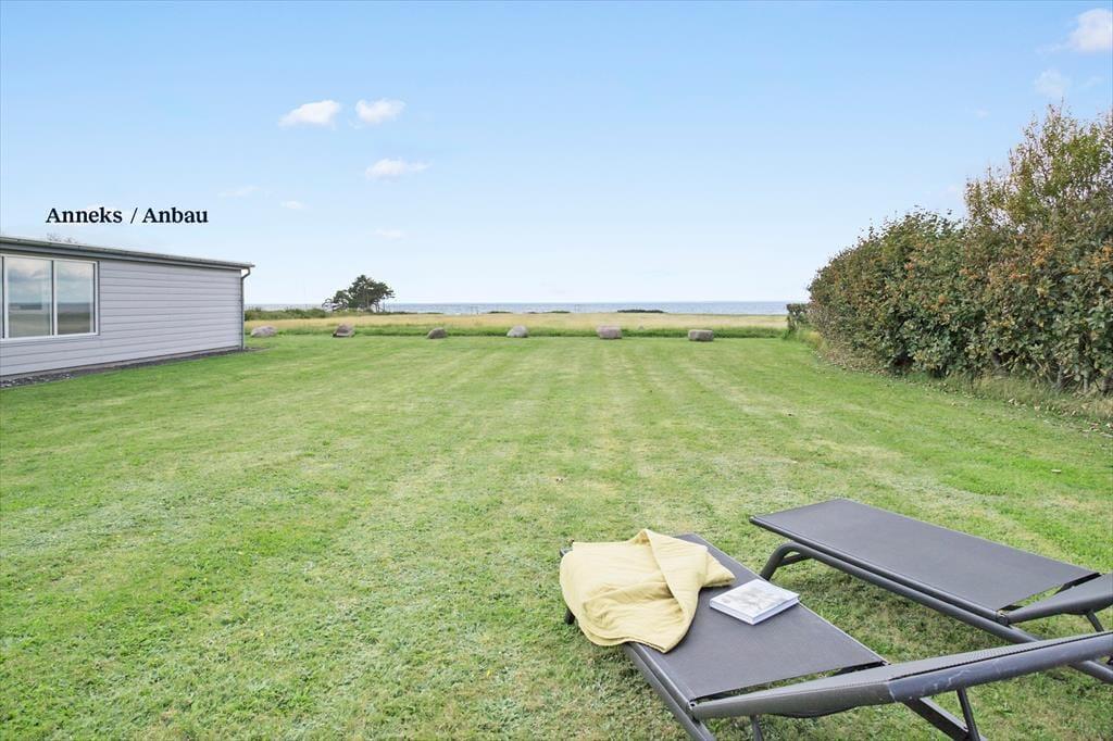 Foran annekset er en stor terrasse, der er fint indhegnet af stakit, hvilket skaber et hyggeligt miljø på den åbne grund. Mellem grunden og havet er en lille grusvej og et fælles areal, hvor det er muligt at spille fodbold.