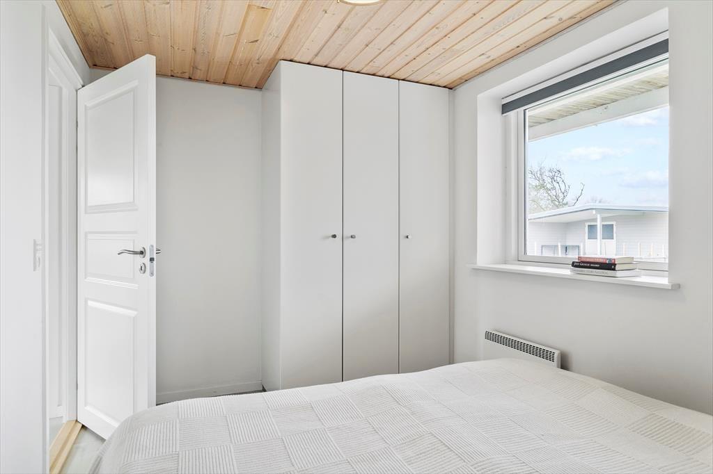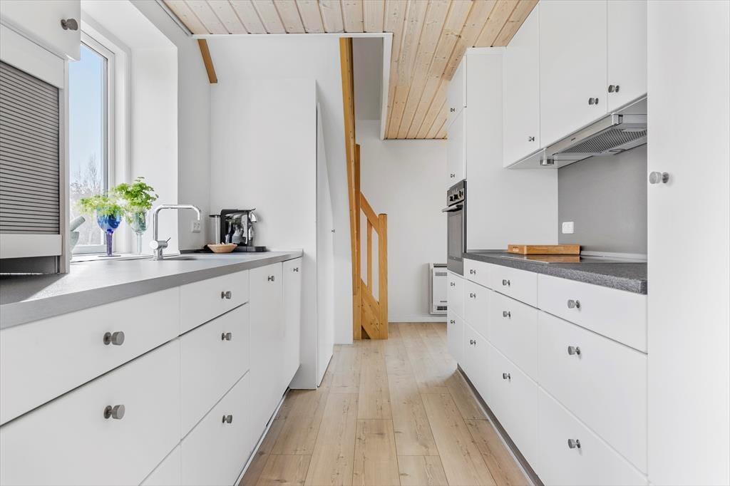 Køkkenet er dejligt lyst og velholdt med hvide skabselementer. Her er alt, man har brug for på sommerhusferien bl.a. opvaskemaskine, køleskab med frys samt ovn og kogeplader. Her er god bordplads og opbevaringsplads og godt lysindfald fra vinduet mod øst.