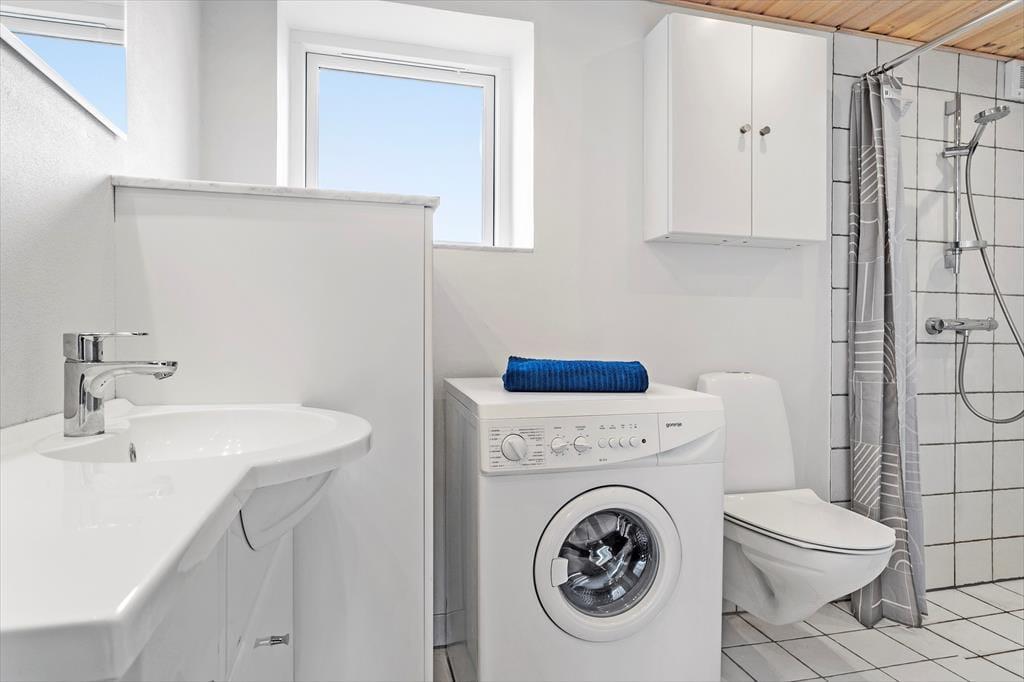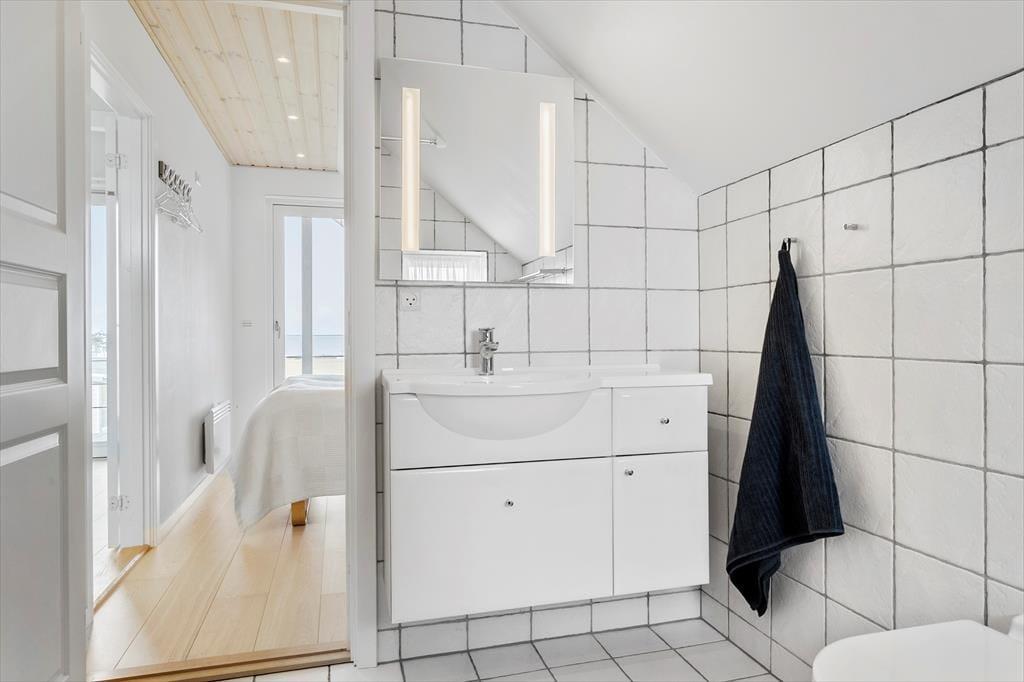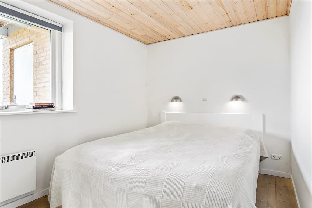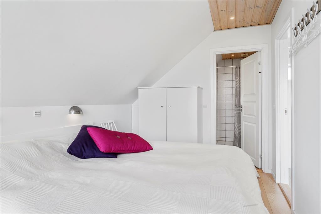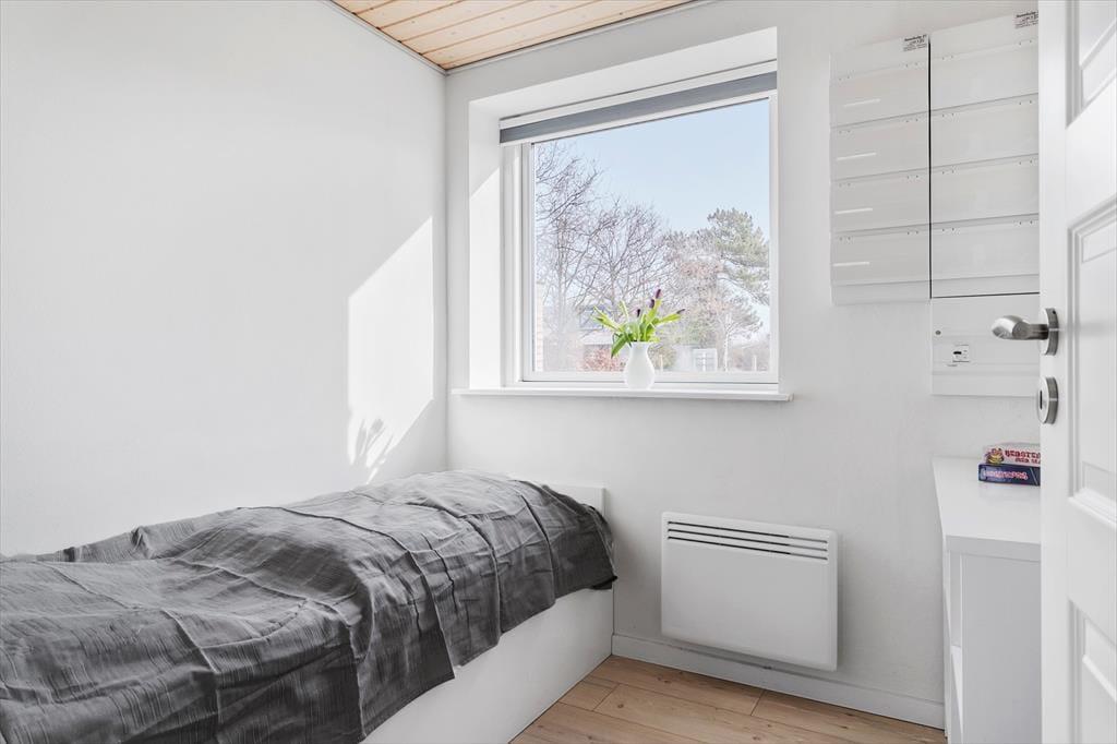 Fra Køkkenalrummet er en lille fordelingsgang, hvor der er adgang til to soveværelser og badeværelset. Det ene værelse har en komfortabel dobbeltseng, skabsplads og sengelamper, mens det andet soveværelse har en enkeltseng og et skrivebord. Badeværelset i stueetagen er lyst med hvide klinker, og udover en brusekabine er her også en vaskemaskine.