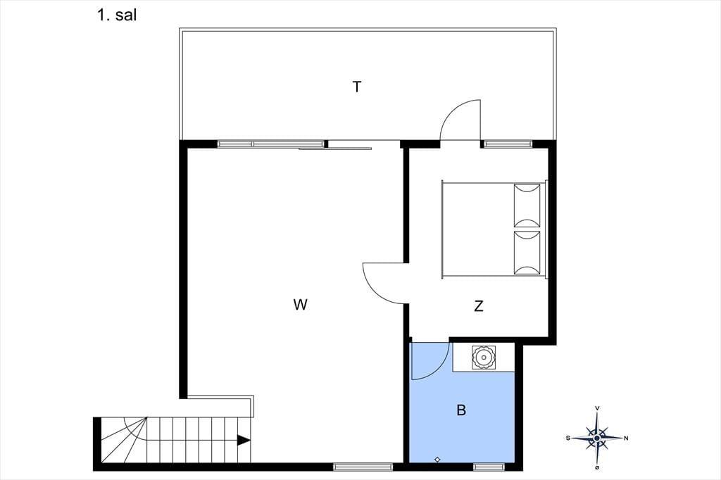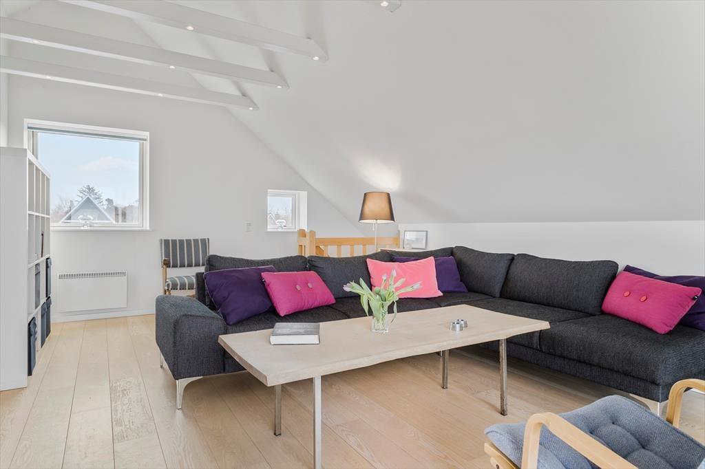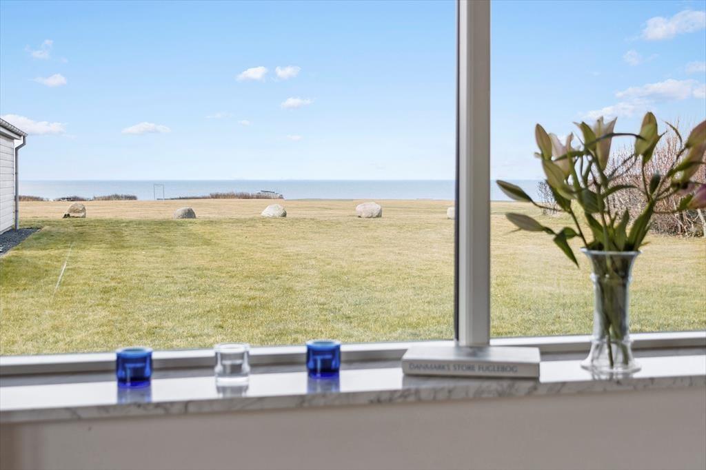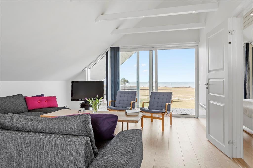På 1. sal er der endnu et dejligt opholdsrum med en komfortabel sofa, der indbyder til hygge og afslapning. Det er perfekt at sidde her og nyde udsigten fra de store vinduer ud mod havet. Vil man have afveksling fra den flotte udsigt, kan man tænde for TV´et, der har parabol med bl.a. danske, tyske og svenske tv-kanaler. Derudover er der WiFi i huset til fri afbenyttelse. Fra stuen er der udgang til en balkon, der giver den bedste udsigt over den åbne grund og Samsøs vestkyst, der er kun 150 meter fra huset. Her er der garanti for smukke solnedgange og mindeværdige øjeblikke.