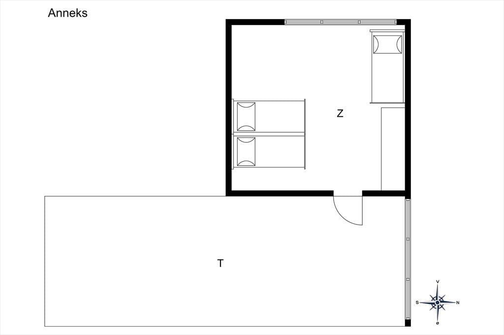 Foran stuehuset er et anneks med sovepladser til 3 personer. Annekset er forbundet med stuehuset via en sti med fliser, og det ligger i 1. række til havet. Her er en god dobbeltseng samt en enkeltmandsseng og opbevaringsplads. Annekset har store vinduer, hvor man kan nyde udsigten helt i ro og fred - Man kan dog også tænde for det væghængte TV.