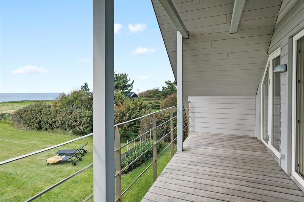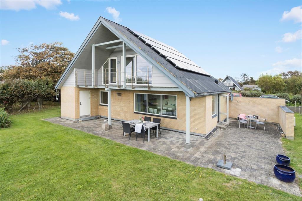 Sommerhuset ligger på en stor, åben grund med græsplæne, der gør det muligt at nyde udsigten i fulde drag. Der er gode parkeringsmuligheder, og rundt om huset er der stakit og buske. De store terrasser er perfekte til at nyde sine måltider eller et glas vin på. Man kan dog også lægge sig til rette i liggestolene, når vejret tillader det. Terrassen mod syd er afskærmet af en halvmur, som både giver læ, og gør det uforstyrret at opholde sig her. Mod vandet er der endnu en stor overdækket terrasse, hvor mange aftener kan bruges på at nyde udsigten og den smukke solnedgang.