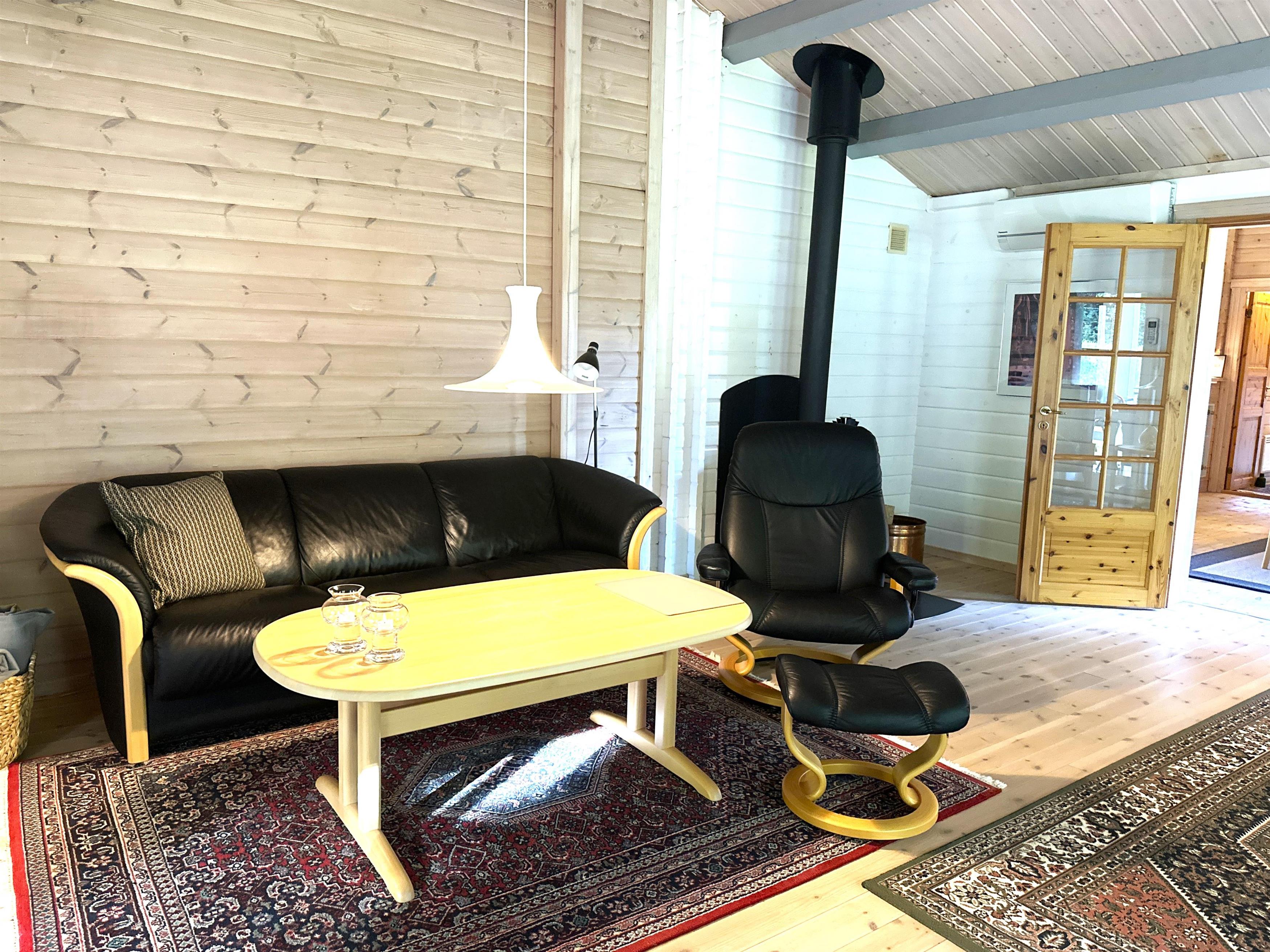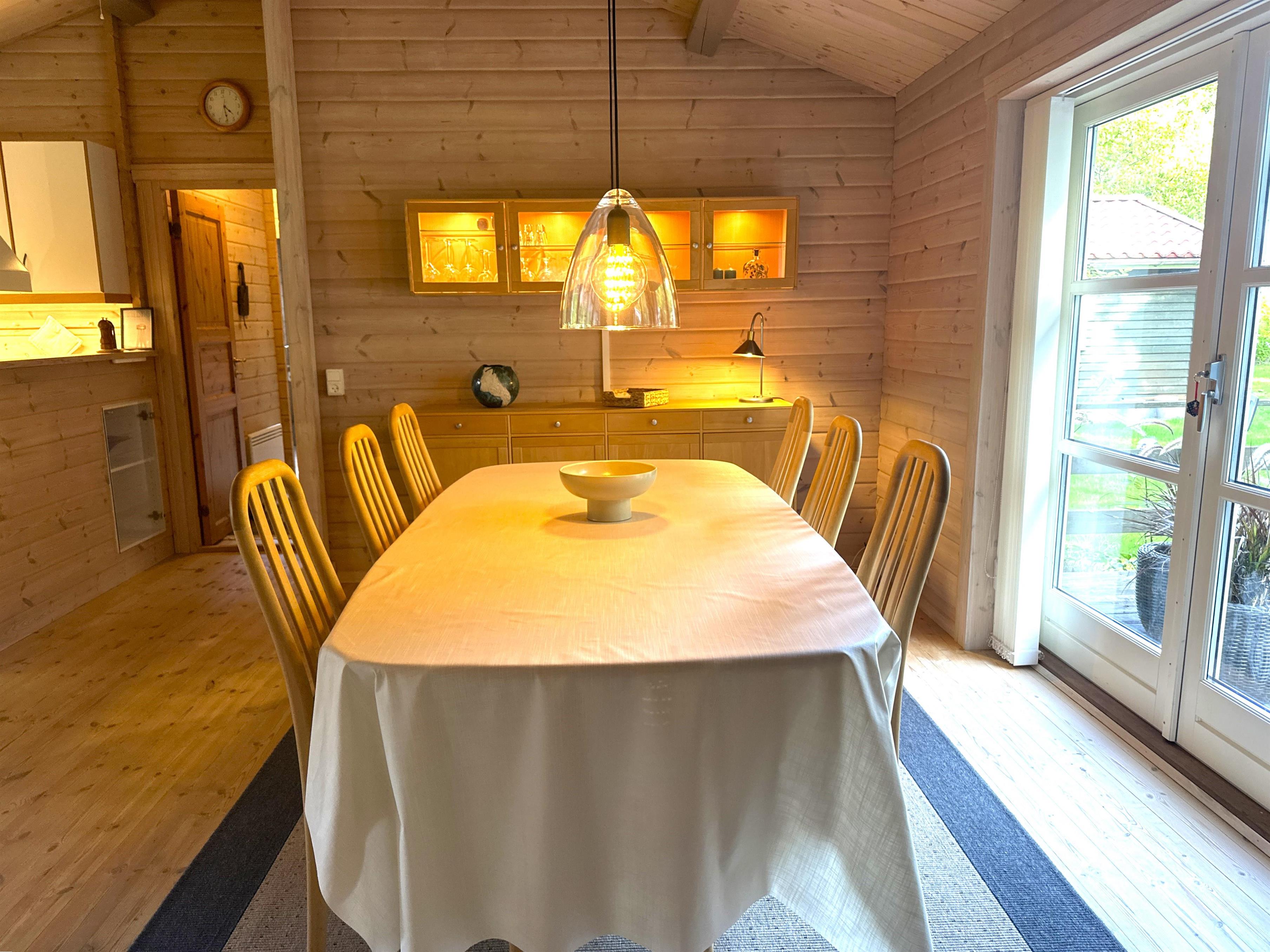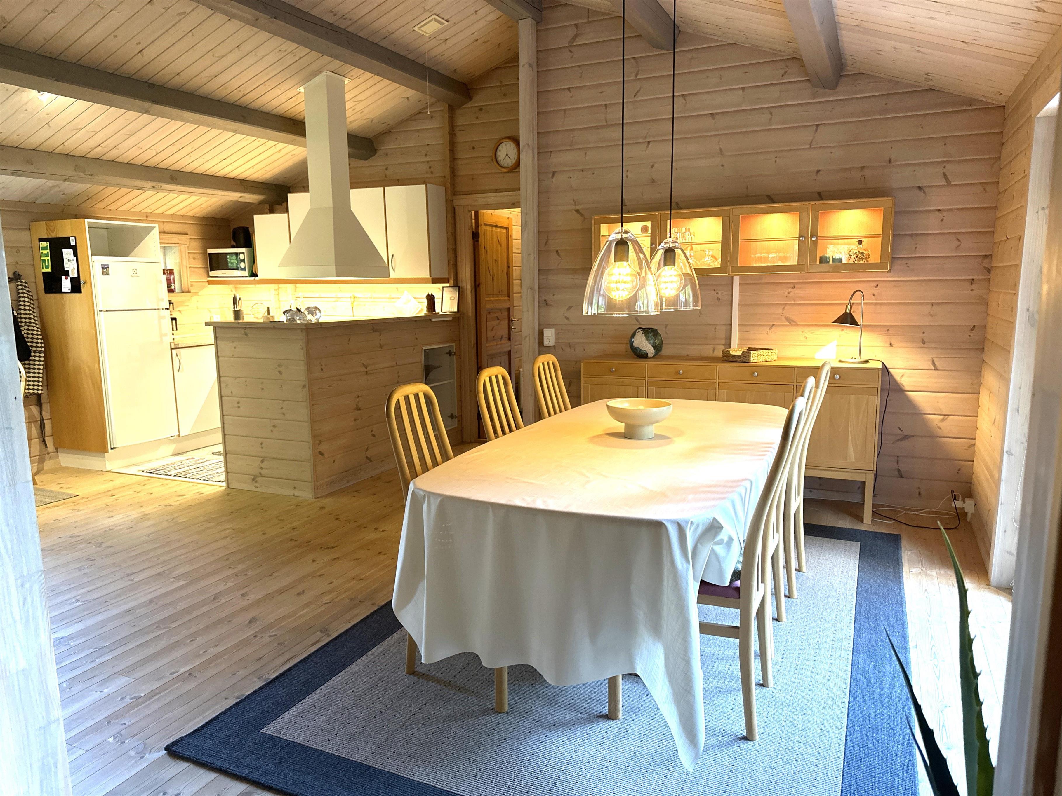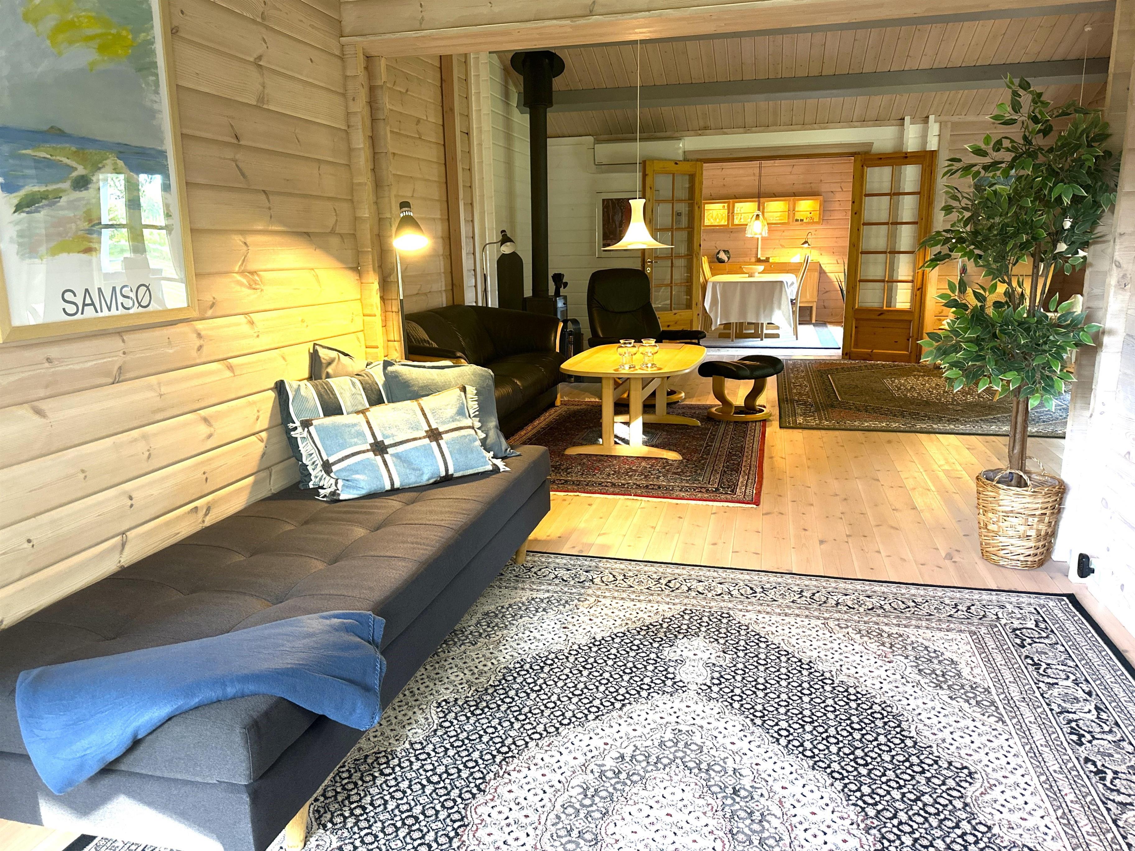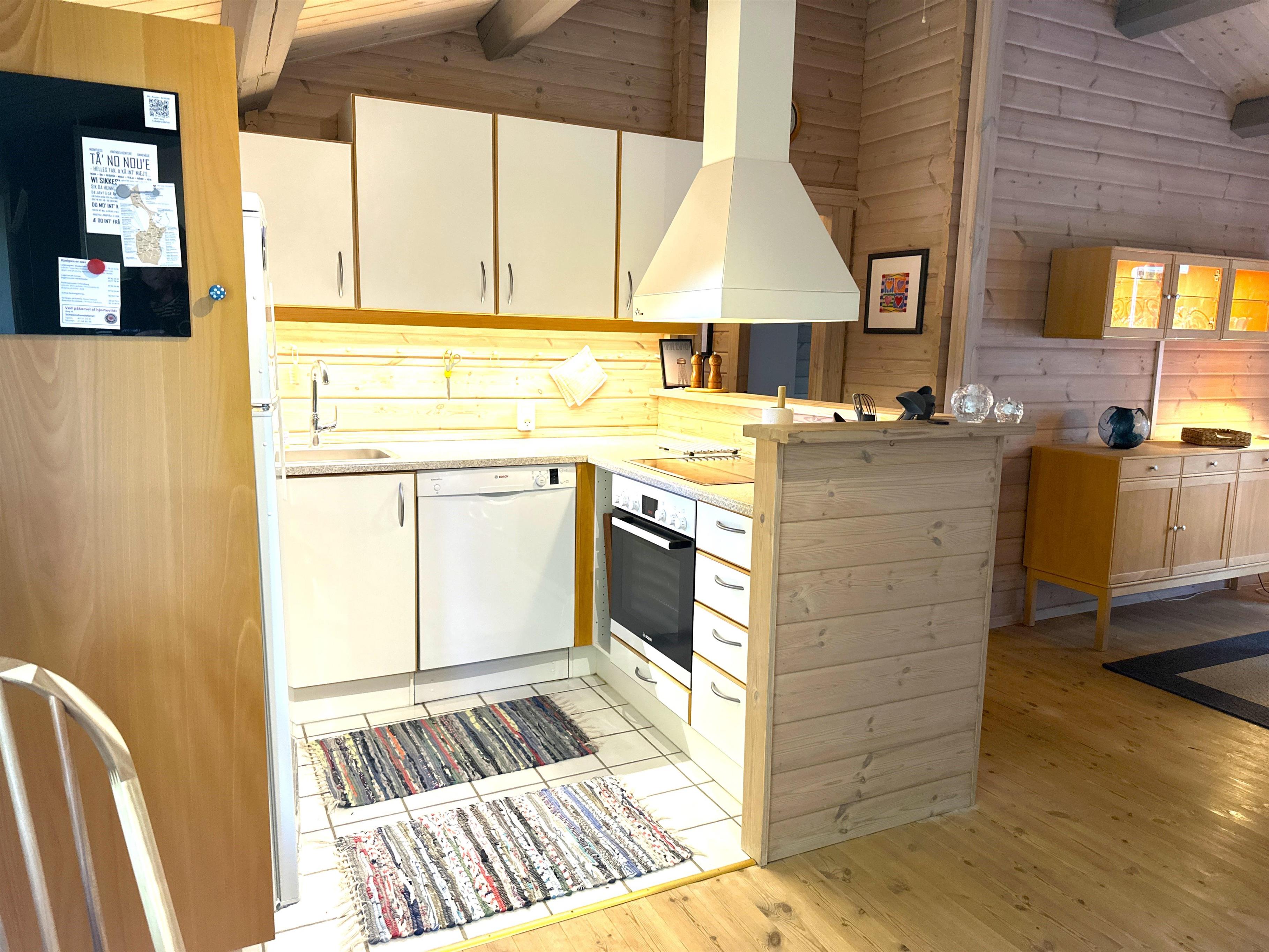 Når du træder ind i sommerhuset, bliver du mødt af et lyst og indbydende køkken-alrum med stor spiseplads, hvor familien kan samles til hyggelige måltider. Køkkenet er fuldt udstyret med alt, hvad du har brug for til madlavning – herunder opvaskemaskine, ovn, komfur, kaffemaskine og rigeligt med service. Alrummet ligger i åben forbindelse med en stor, velindrettet stue med bløde sofaer, brændeovn og fladskærms-TV. De mange vinduer og terrassedøre lukker masser af naturligt lys ind og giver en følelse af at være tæt på haven – selv når du opholder dig indenfor.