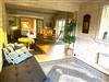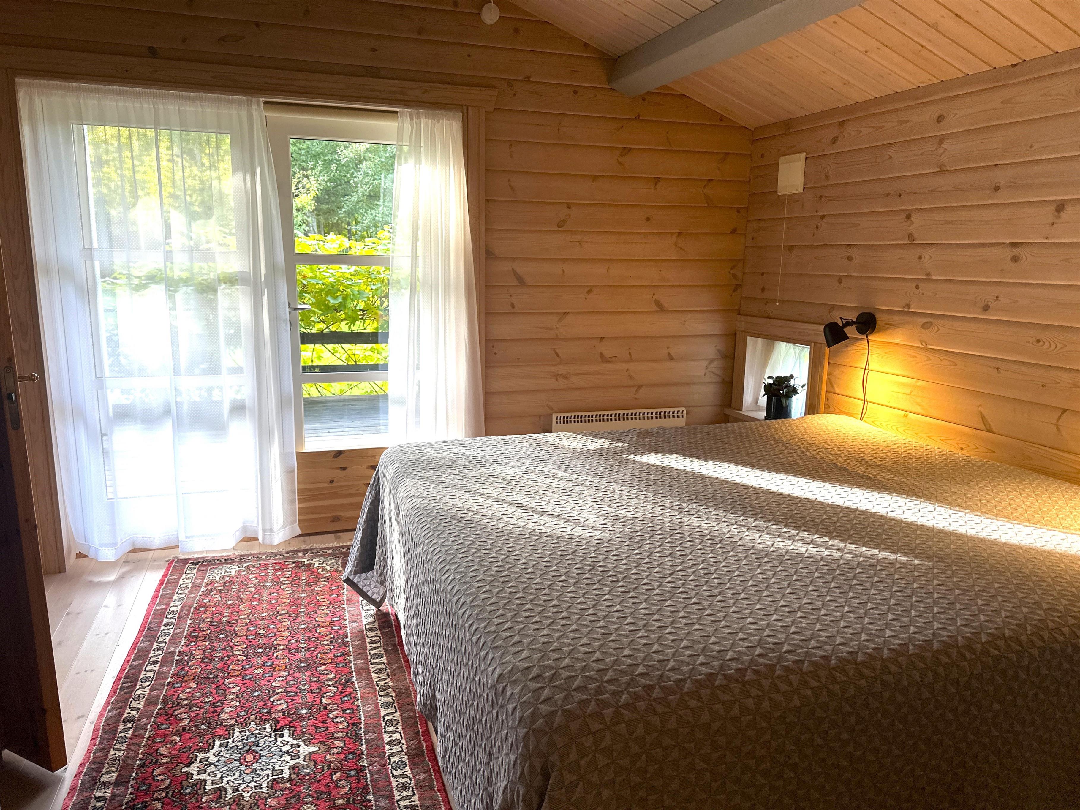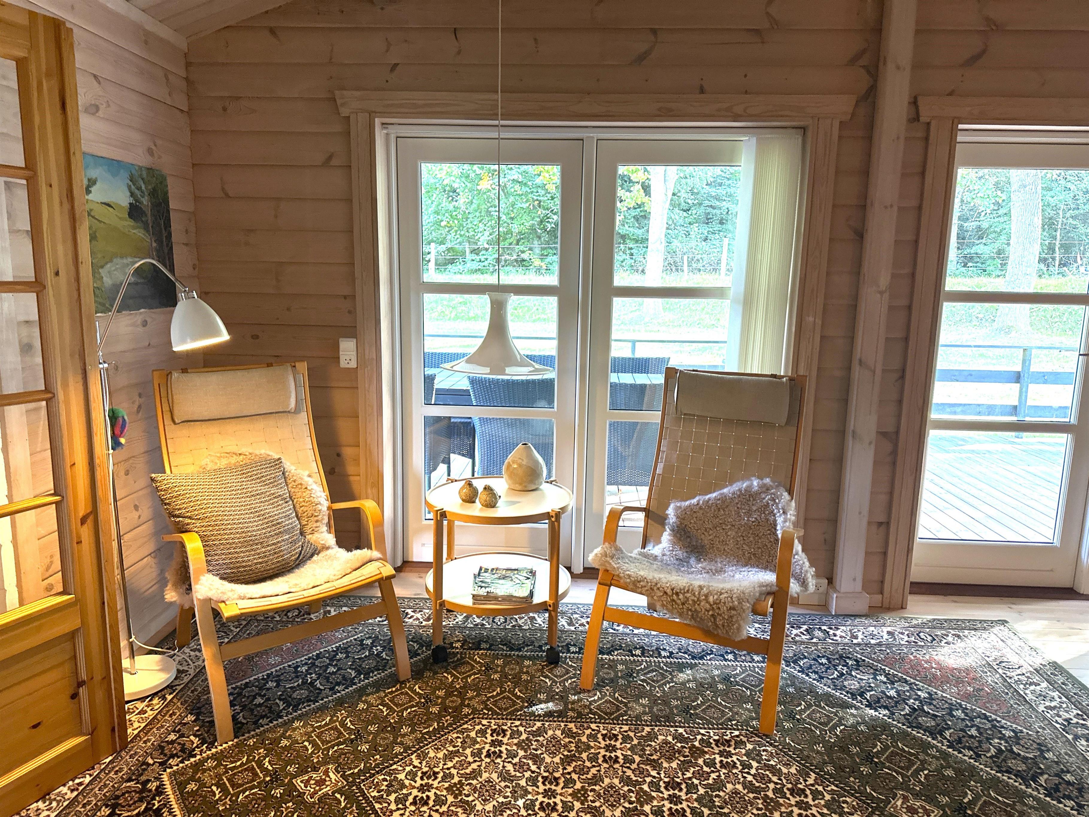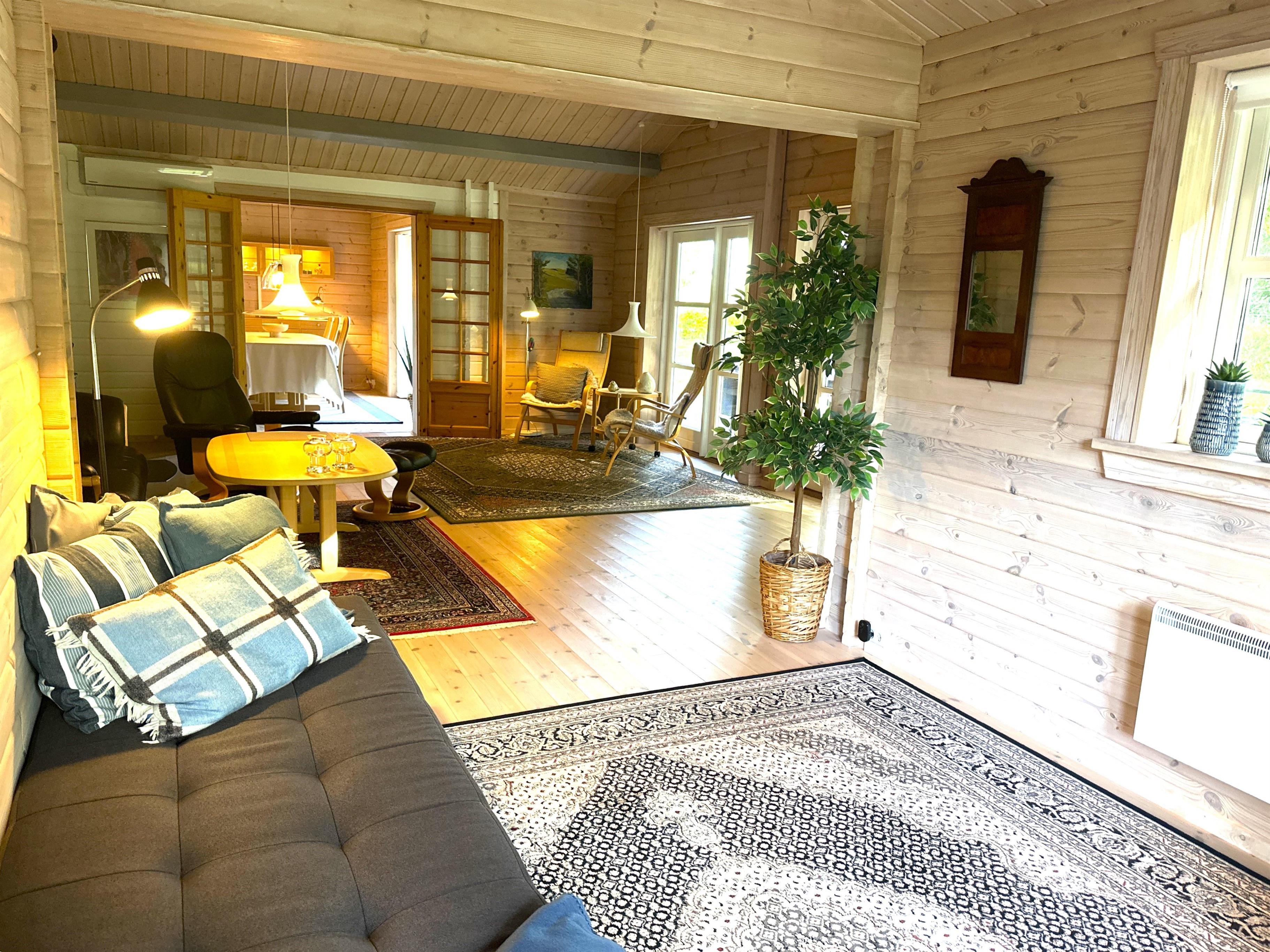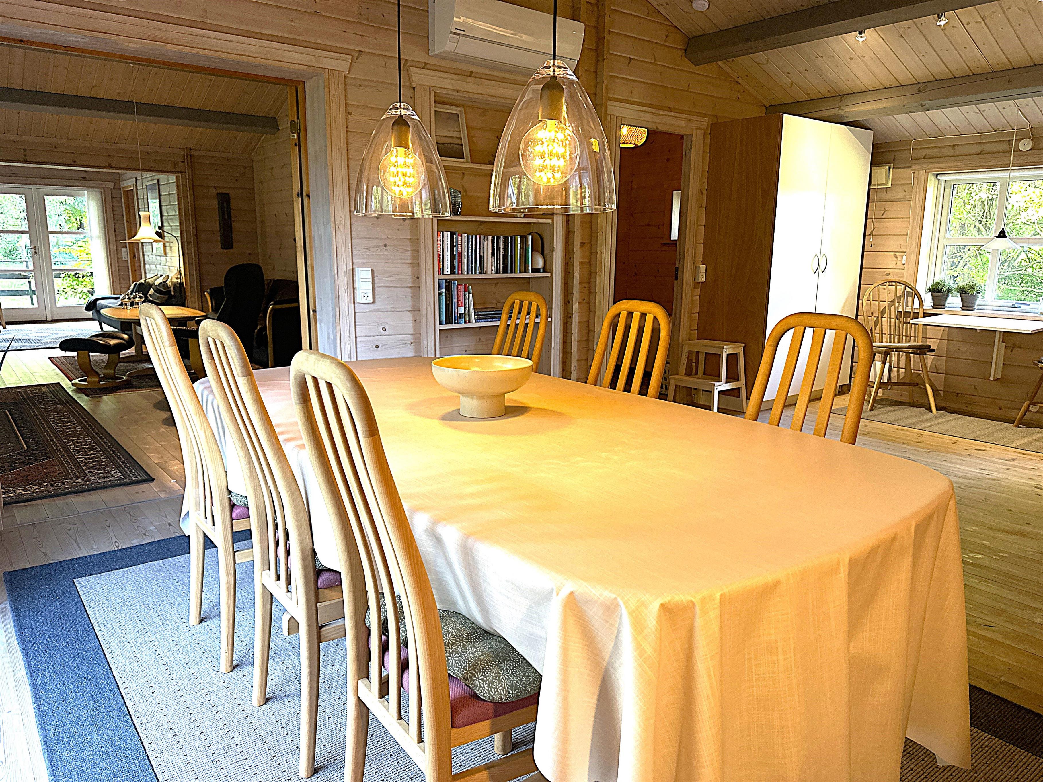 Når du træder ind i sommerhuset, bliver du mødt af et lyst og indbydende køkken-alrum med stor spiseplads, hvor familien kan samles til hyggelige måltider. Køkkenet er fuldt udstyret med alt, hvad du har brug for til madlavning – herunder opvaskemaskine, ovn, komfur, kaffemaskine og rigeligt med service. Alrummet ligger i åben forbindelse med en stor, velindrettet stue med bløde sofaer, brændeovn og fladskærms-TV. De mange vinduer og terrassedøre lukker masser af naturligt lys ind og giver en følelse af at være tæt på haven – selv når du opholder dig indenfor.