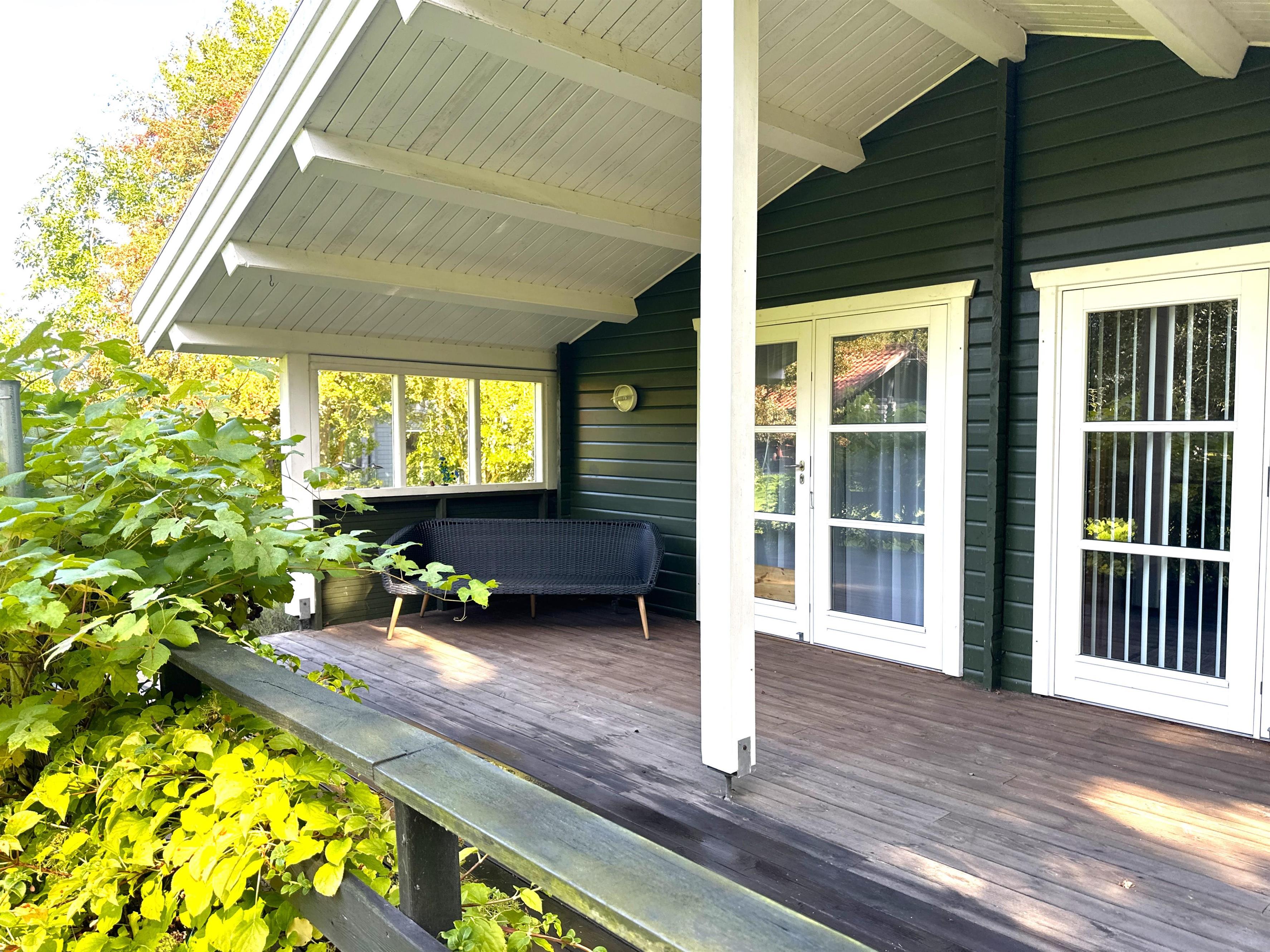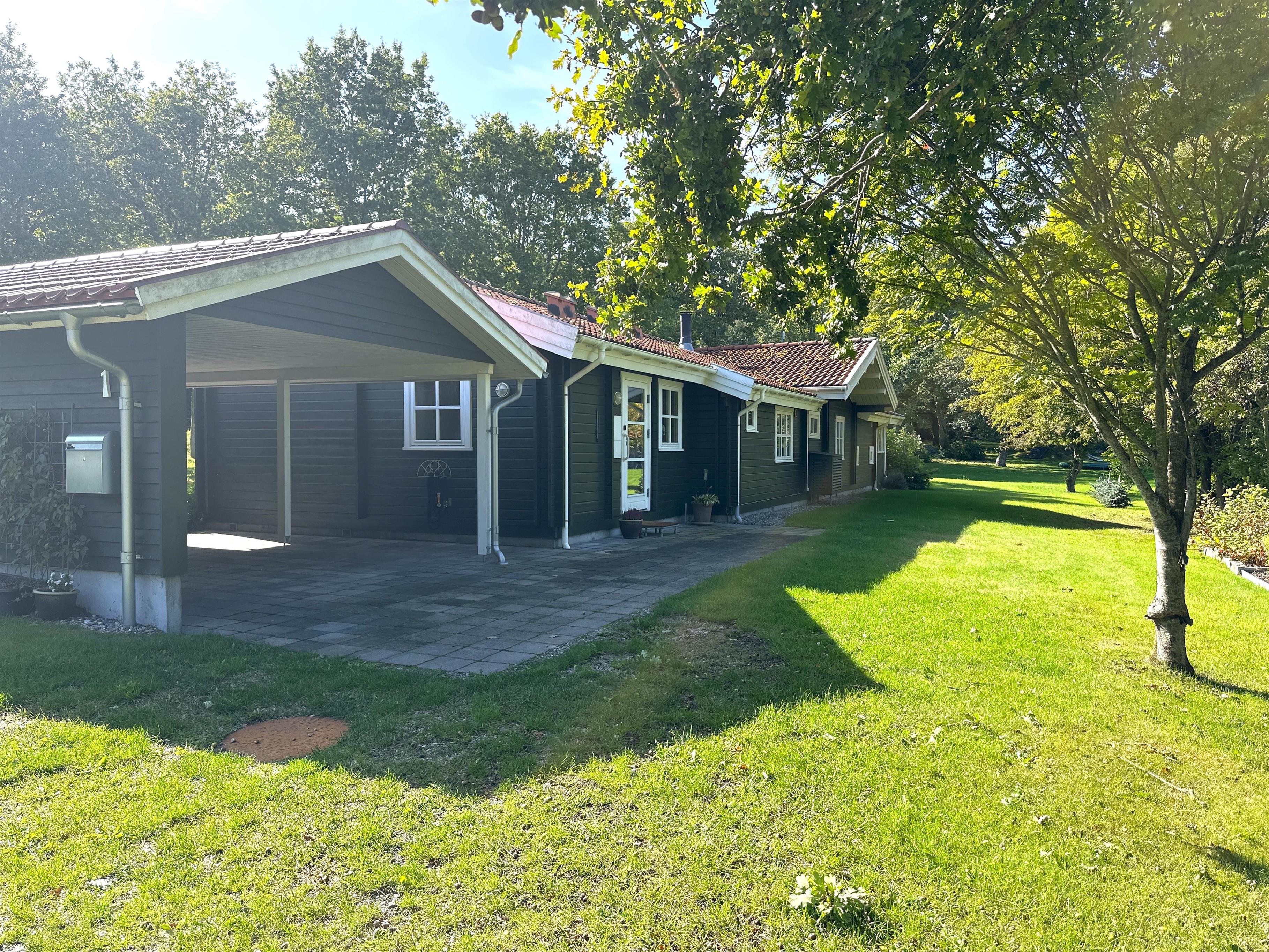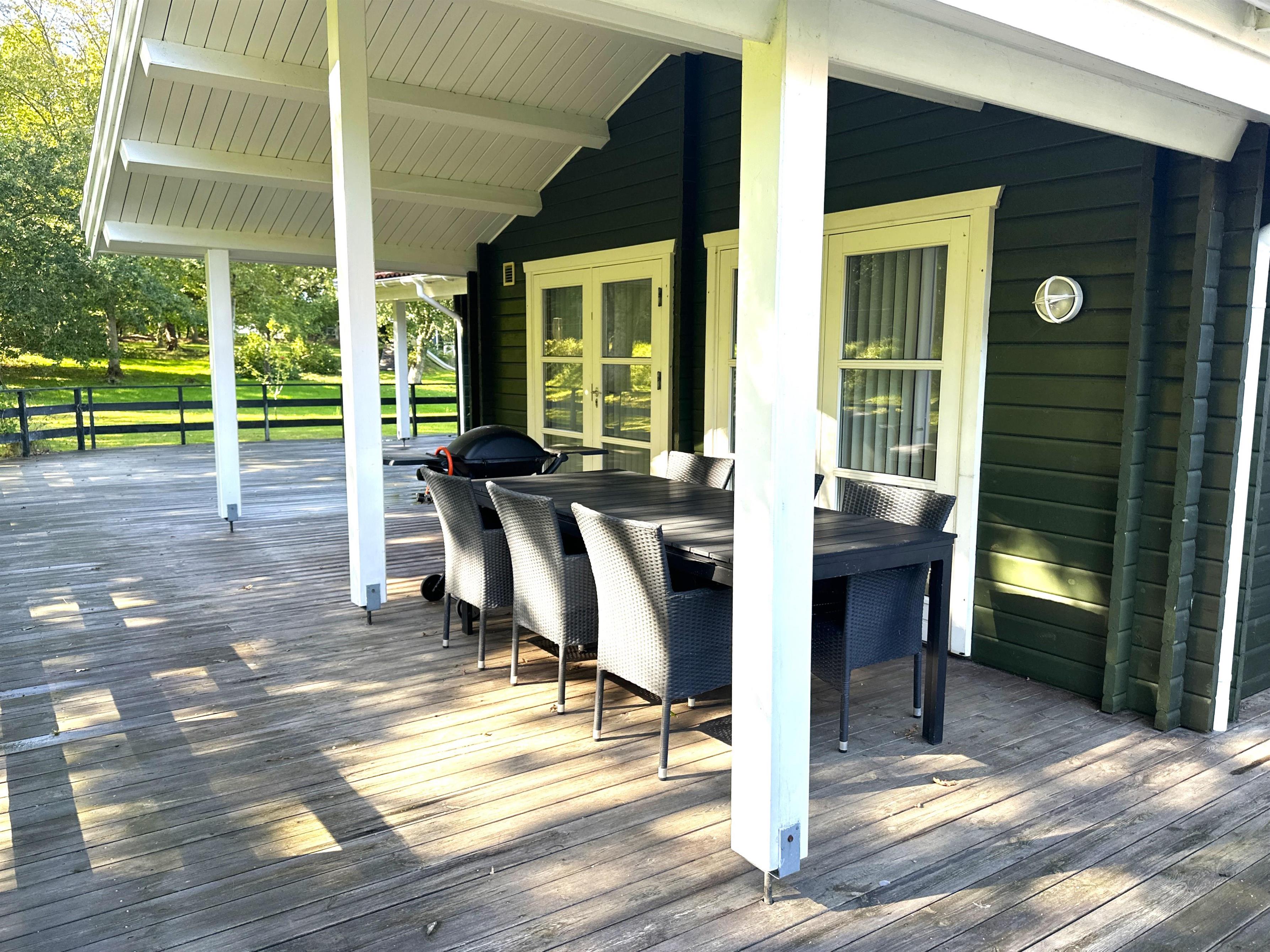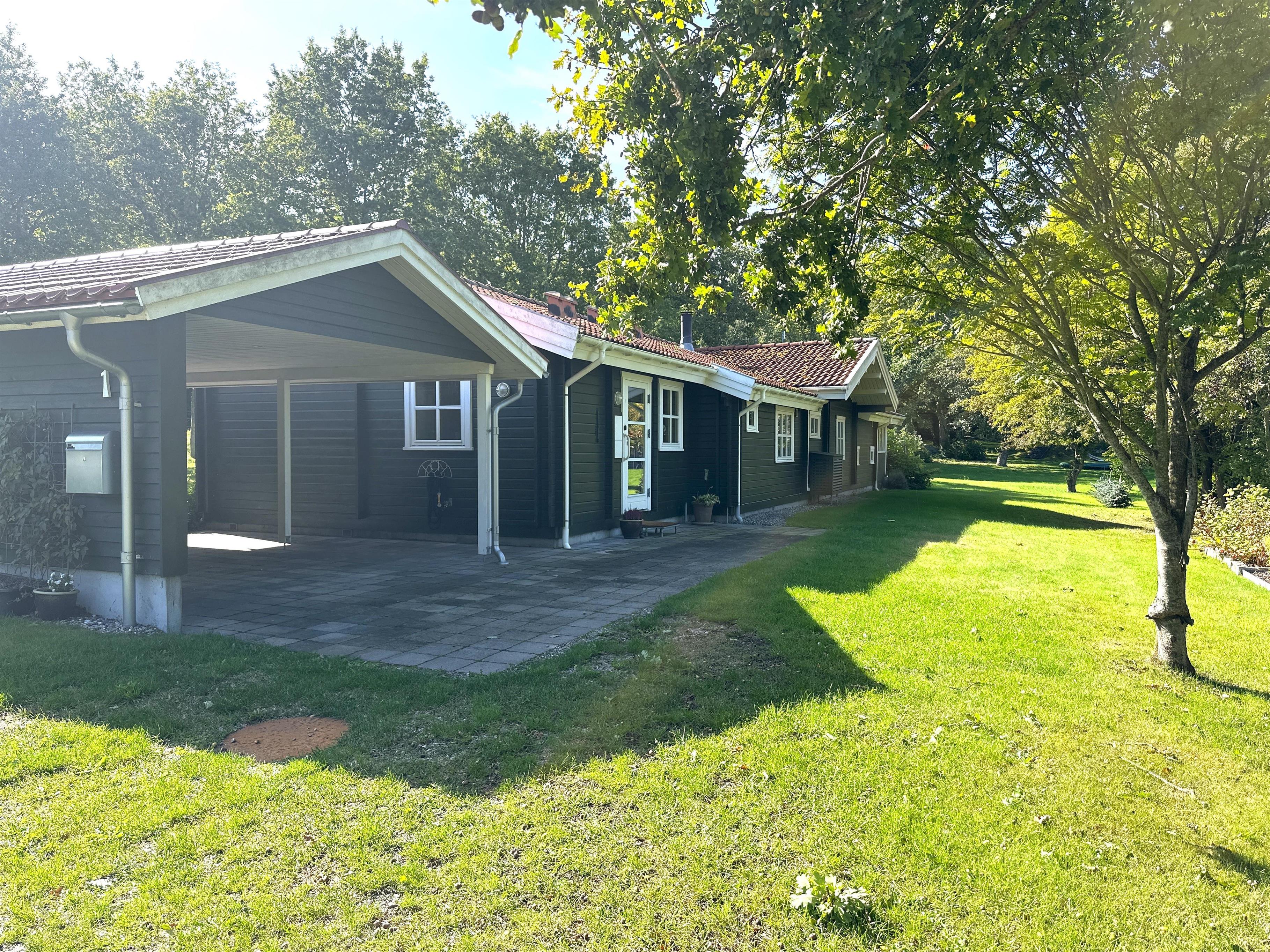 Fra stuen er der direkte adgang til en stor, delvist overdækket træterrasse, hvor du kan nyde både morgenkaffen og de lange sommeraftener. Terrassen er udstyret med havemøbler, grill og god plads til afslapning. Den store, grønne have inviterer til leg, boldspil og afslapning for både børn og voksne – og din hund vil også elske at være her.