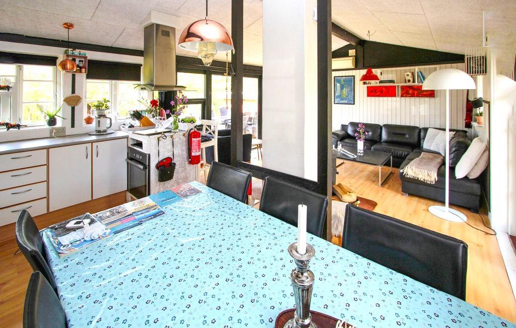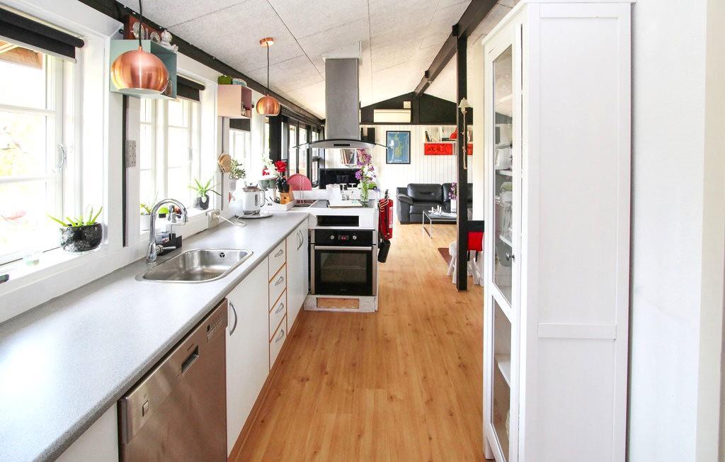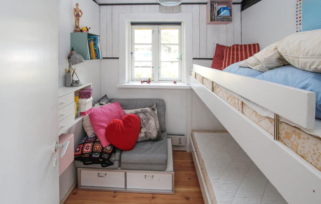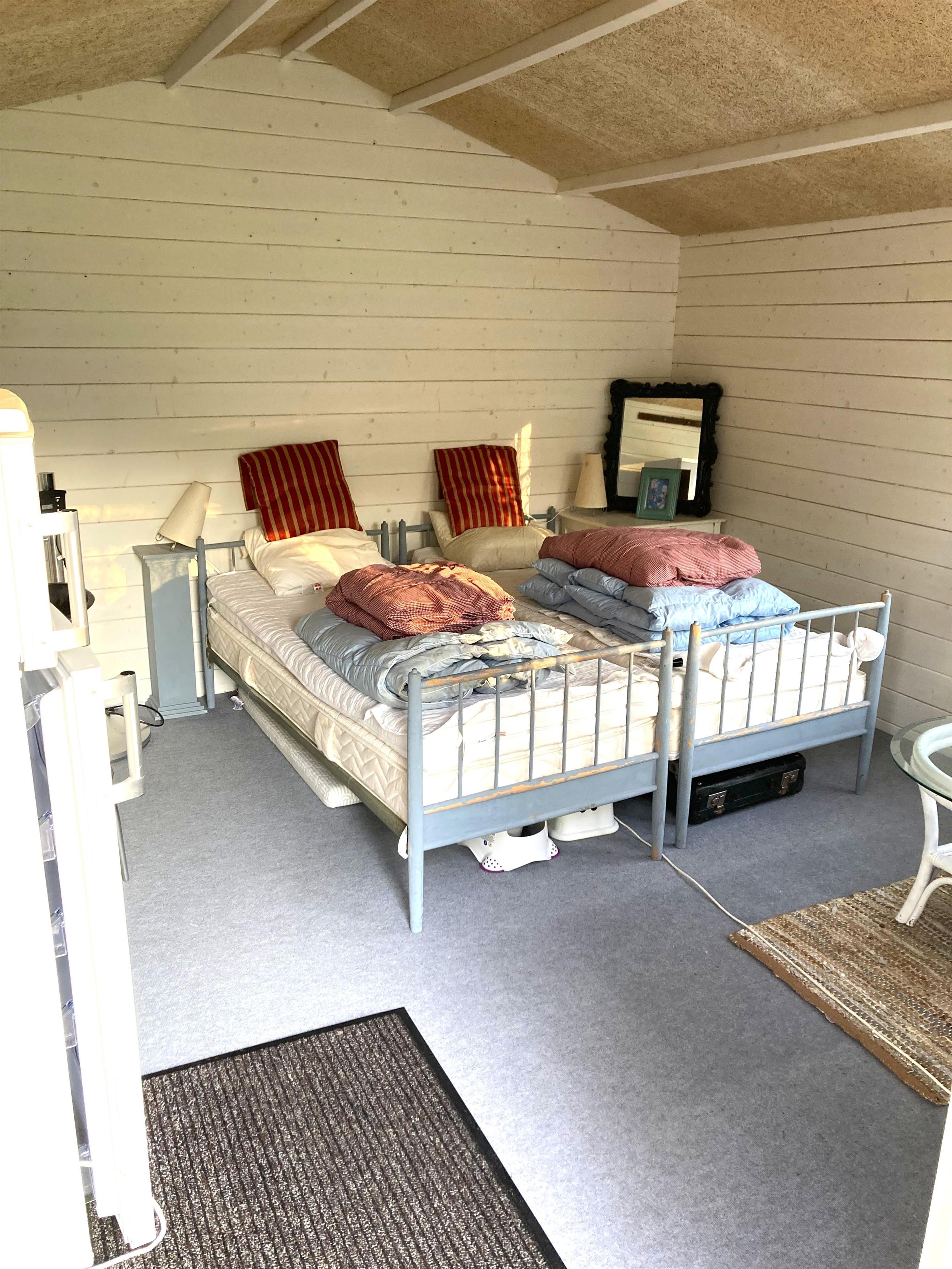 Sommerhuset byder på et lyst og hyggeligt køkken-alrum med god spiseplads, sofahjørne og en brændeovn, der skaber ekstra stemning på de kølige aftener. Der er et badeværelse med brusekabine, samt to soveværelser i hovedhuset – et med dobbeltseng og et med køjeseng. I det tilhørende anneks finder du yderligere to sovepladser, ideelt til gæster eller større børn.