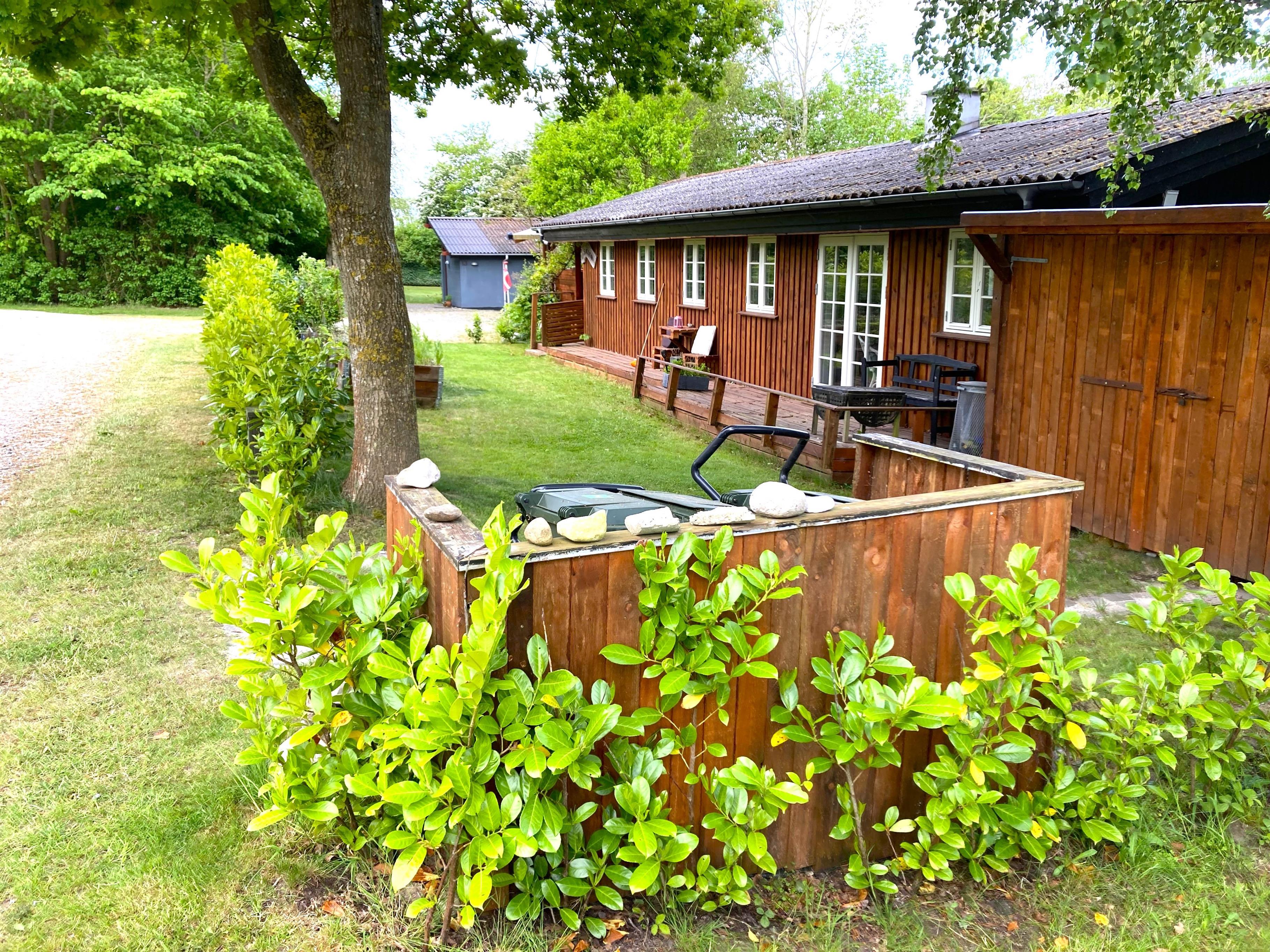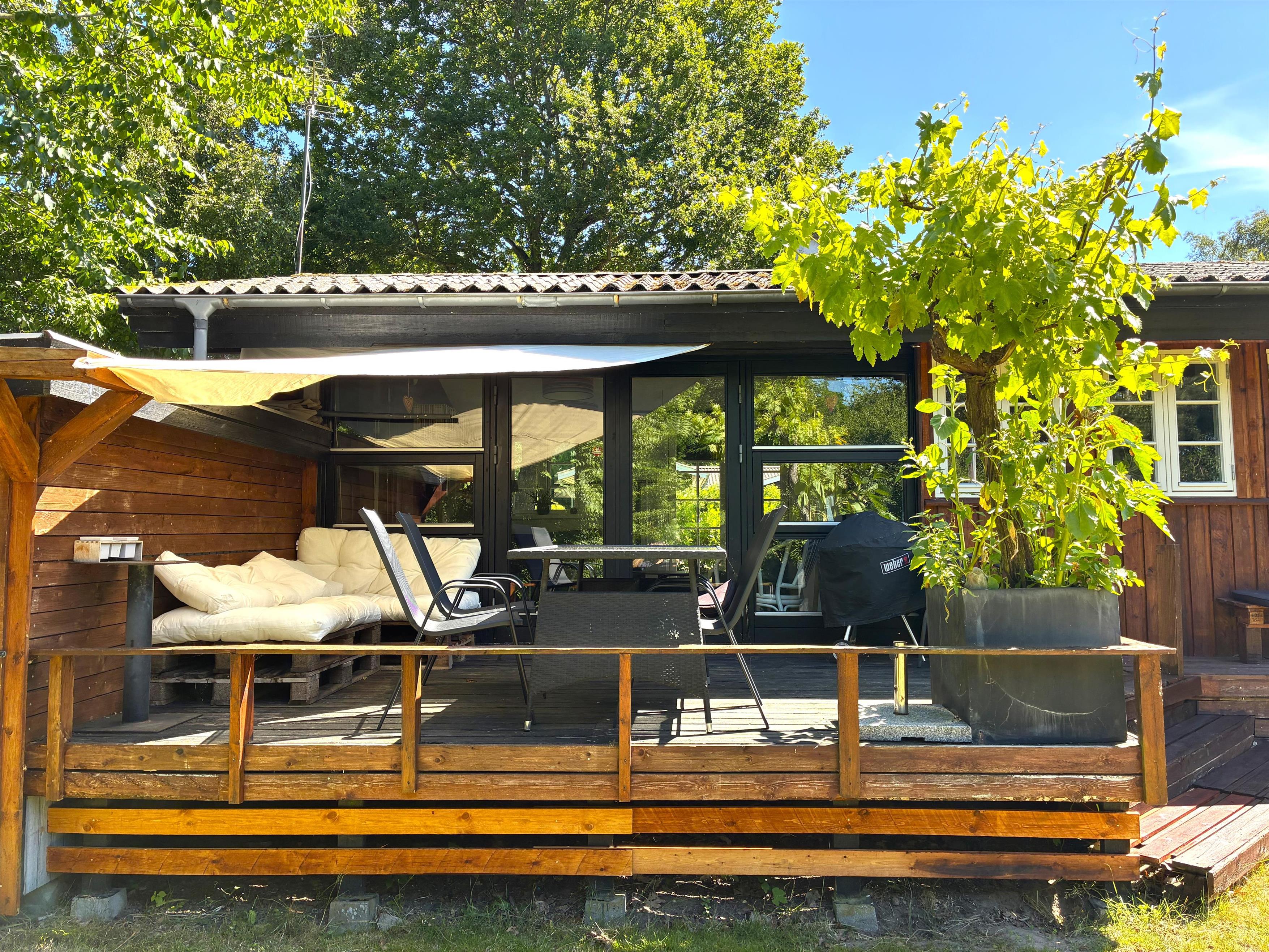 Træd ud på den skønne terrasse, hvor små kroge og hyggelige opholdspladser indbyder til afslapning i sommervejret. Her finder du både havemøbler, bålplads, vildmarksbad og hængekøjer – perfekte rammer for både ro og familietid. Haven giver rig mulighed for leg og udendørs spil. Stranden ligger blot få hundrede meter fra huset, så en frisk dukkert er aldrig langt væk.
