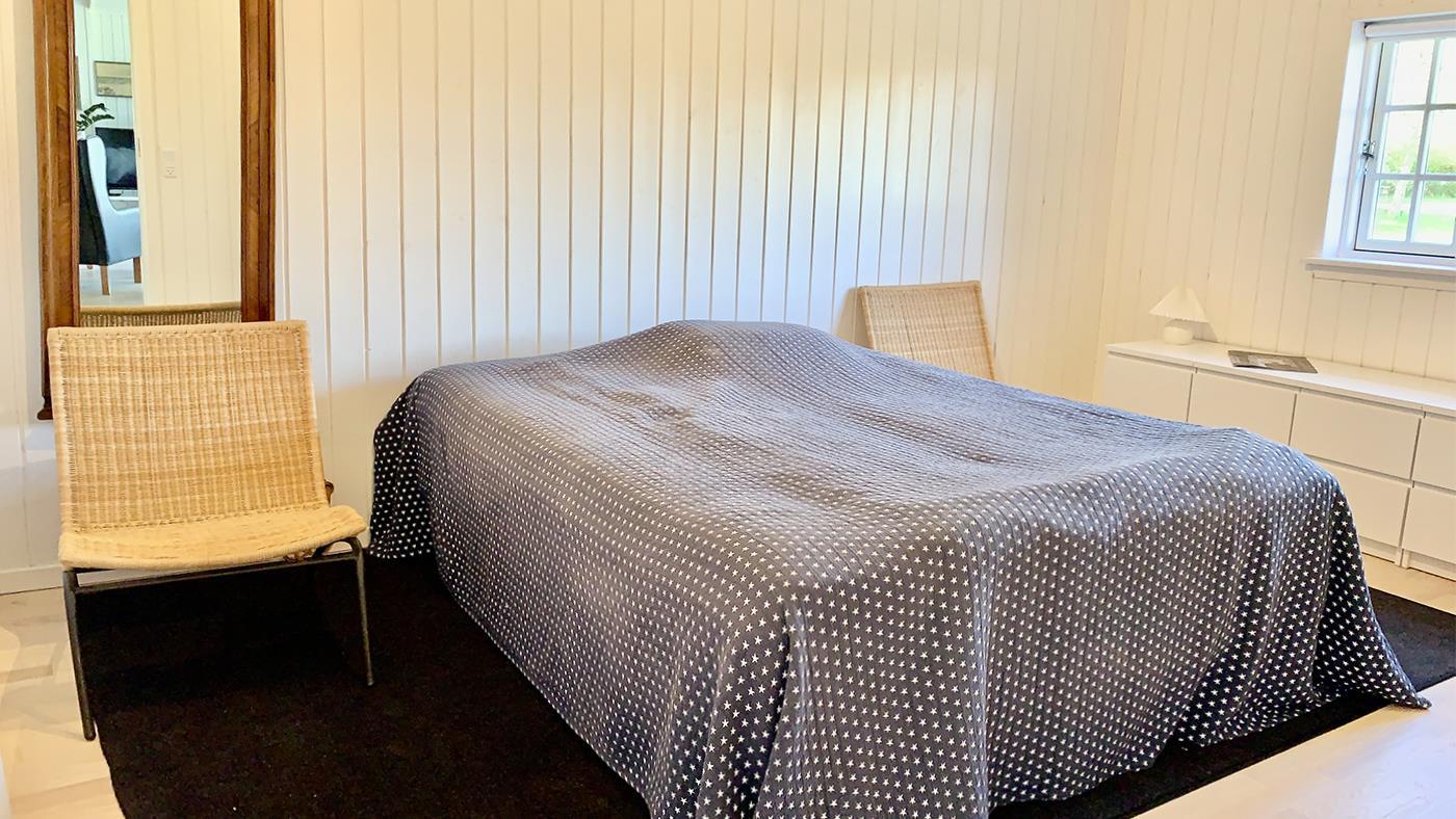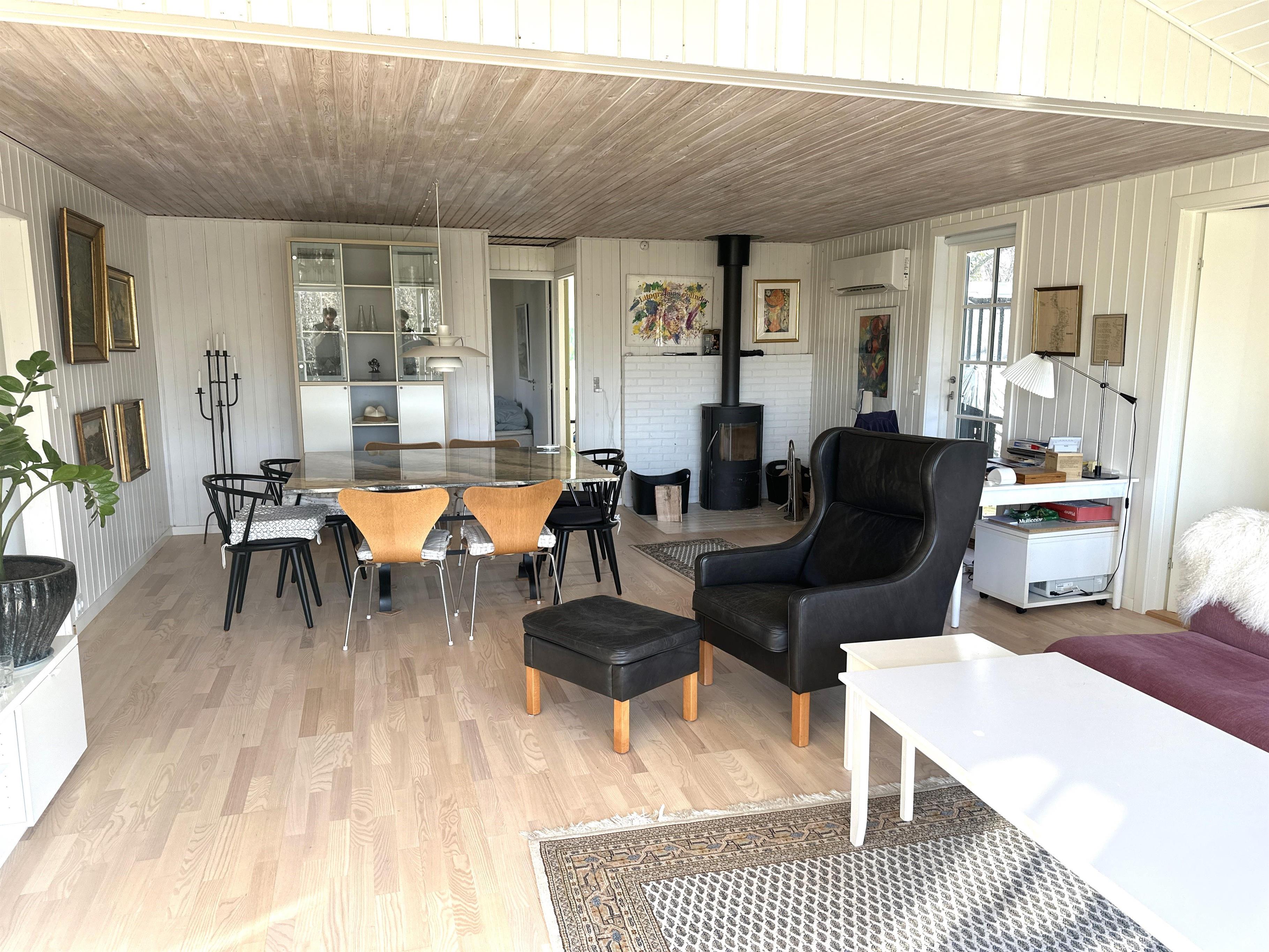 Fra køkkenet er der adgang til den rummelige stue med stor spiseplads og en hyggelig sofa, hvor du kan slappe af og nyde det naturlige lys, der strømmer ind gennem de store vinduer. Her er det let at samles med familie eller venner og skabe mindeværdige stunder.Sommerhuset har tre lyse og indbydende soveværelser med komfortable senge, der sikrer dig en god nats søvn – klar til endnu en dag med spændende oplevelser. Badeværelset er moderne og funktionelt med brusekabine, perfekt til at friske sig op efter en dag ude i naturen.