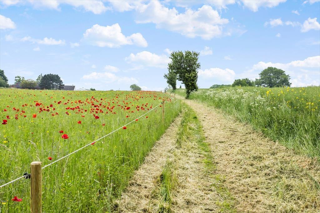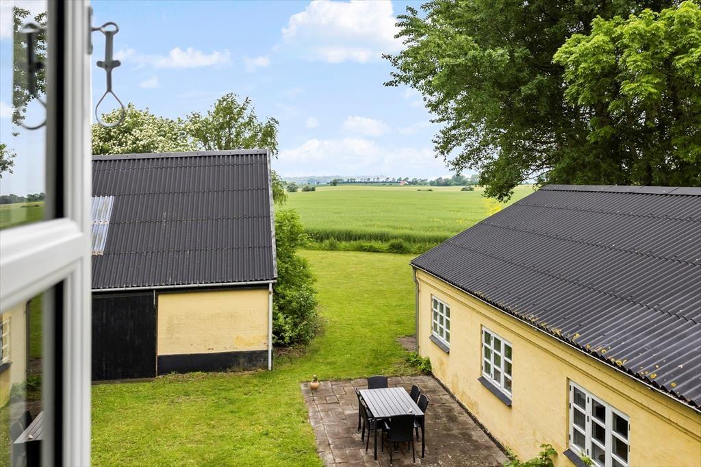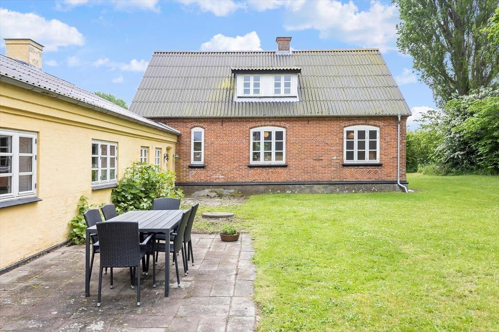 Den sydvendte gårdhave er et oplagt sted at nyde solen og den friske luft. Her kan du sætte dig med en kop kaffe og nyde den rolige udsigt over de omkringliggende marker. Gårdspladsen deles med den anden feriebolig på grunden og har en stor garage, som er tilgængelig for begge huse. Her er der mulighed for at parkere din bil eller opbevare cykler, så du nemt kan tage på eventyr i det naturskønne område. Grillen på terrassen inviterer til hyggelige grillmiddage under åben himmel, mens børnene leger i haven.