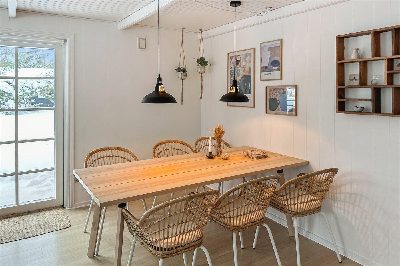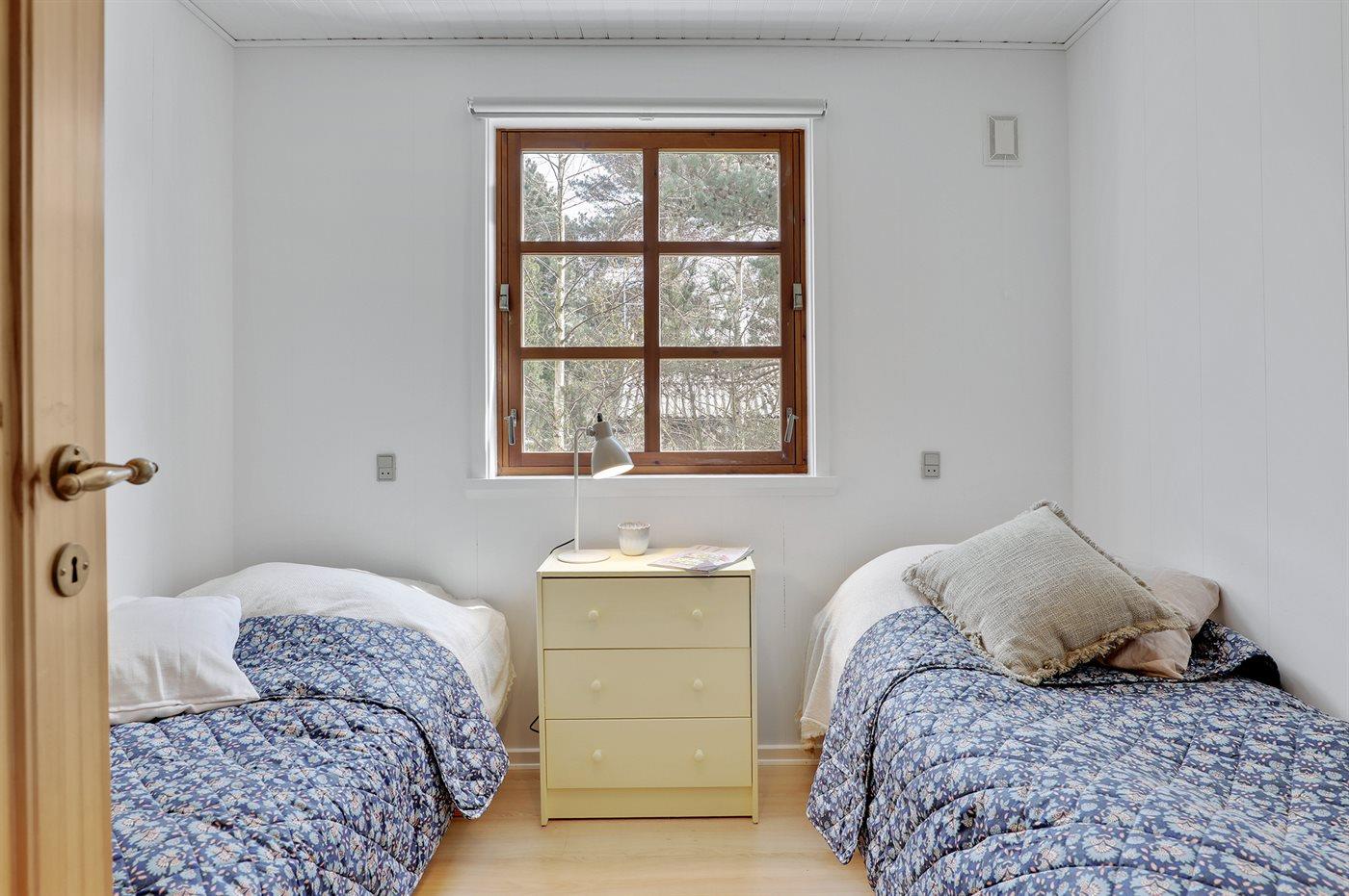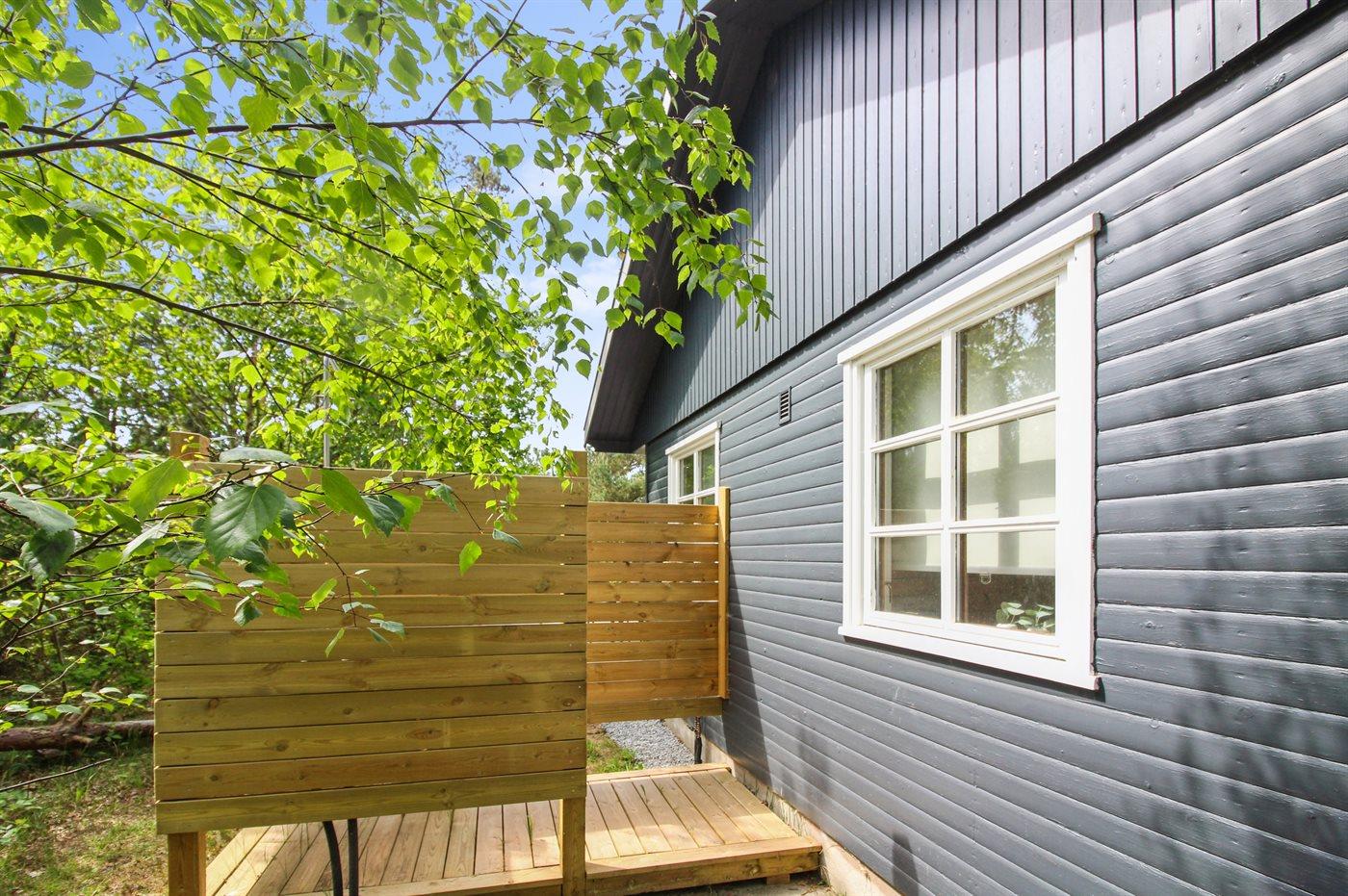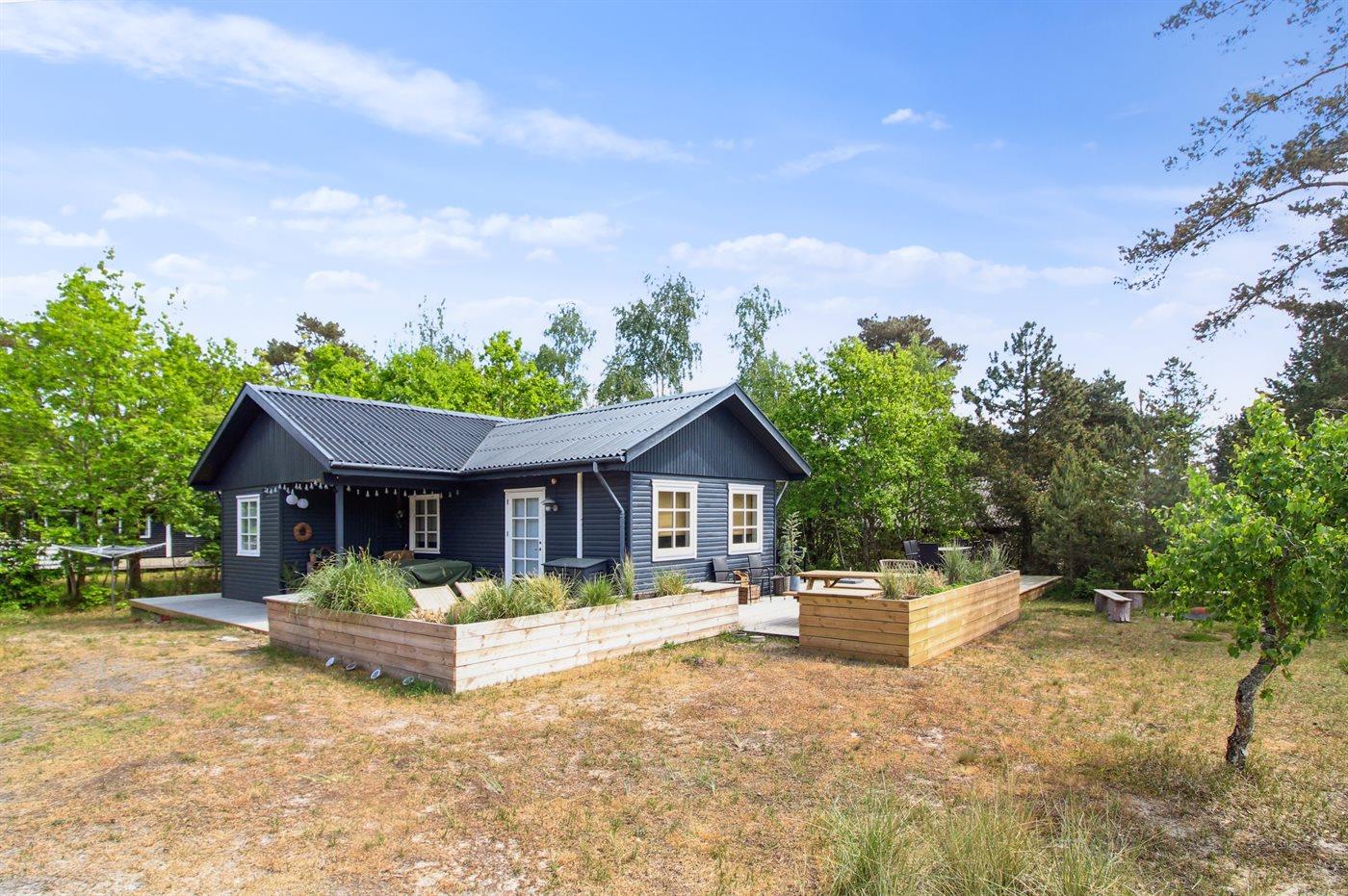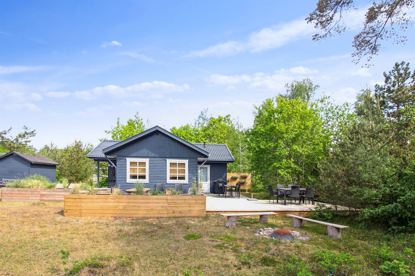 Dejligt og velholdt sommerhus i træ beliggende på en naturgrund med sand, lyng og fyrretræer samt bålsted. Stor og delvist overdækket terrasse med diverse havemøbler og kuglegrill (til kul). Huset er bygget i 1984 og senest moderniseret i 2021 med malede lofter og vægge samt delvis ny møblering. Således fremstår huset moderne og pænt. Huset er smagfuldt og hyggeligt indrettet. Den separate køkkenafdeling er udstyret med bl.a. opvaskemaskine. Opholdsstuen har direkte udgang til terrassen og indeholder bl.a. Smart-TV (Yousee app + 4 tyske kanaler), Sonos bluetooth-højtaler og stereoanlæg. Sovepladserne er fordelt på 3 lyse soveværelser; 1 med dobbeltseng og 2 med hver 2 enkeltsenge - alle senge er i god bokskvalitet. Dejligt badeværelse med bruseniche og gulvvarme. Dobbelt parkeringsplads på grunden. Der findes desuden udendørs bruser. Stort fællesareal med havudsigt ved Holsterodde med bl.a. gynger. Bemærk: Adgang til børneværelse gennem soveværelse eller fra terrassen.