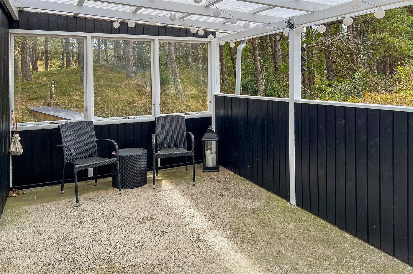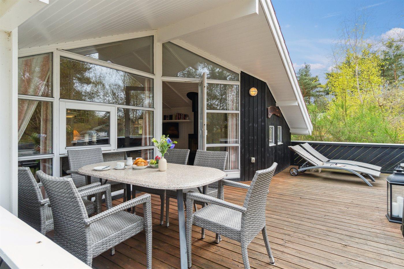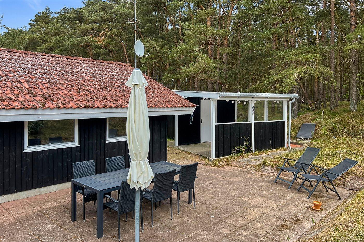 Strandnært velindrettet sommerhus med fin beliggenhed i hyggeligt sommerhusområde. Huset ligger op til fredet skovareal, så man finder en ugenert terrasse bag ved huset, hvor solen kan nydes i fulde drag. Eftermiddagsterrassen er delvis overdækket på den anden side af huset og godt møbleret med passende havemøbler.