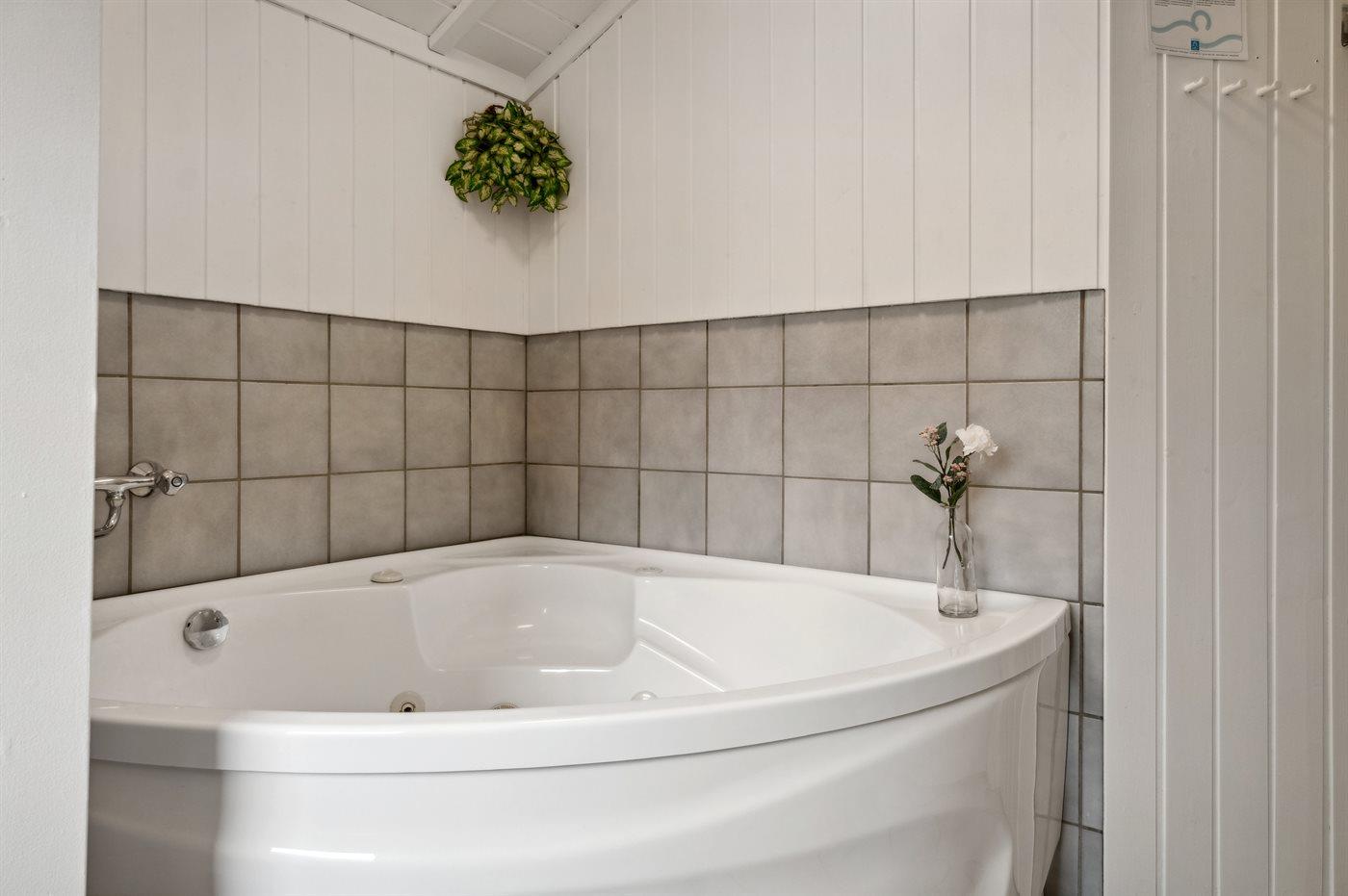 Indvendig er vægge, lofter og gulve holdt i fine lyse farver, så man får en god fornemmelse af ferie, sol og velvære. I husets badeværelse finder du en 2 personers spa, som nok kan give mulighed for at nyde ferien og hellige sig wellness.