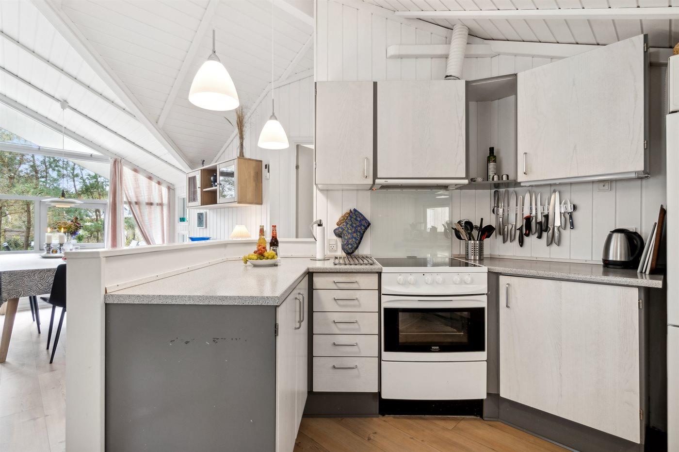 Køkkenet er udstyret med 1 køleskab. Der er 4 keramiske kogeplader, varmluftovn, mikrobølgeovn samt opvaskemaskine.