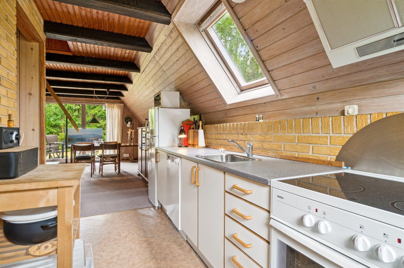 Køkkenet er udstyret med 1 køleskab. Der er 4 elkogeplader, varmluftovn, mikrobølgeovn samt opvaskemaskine.