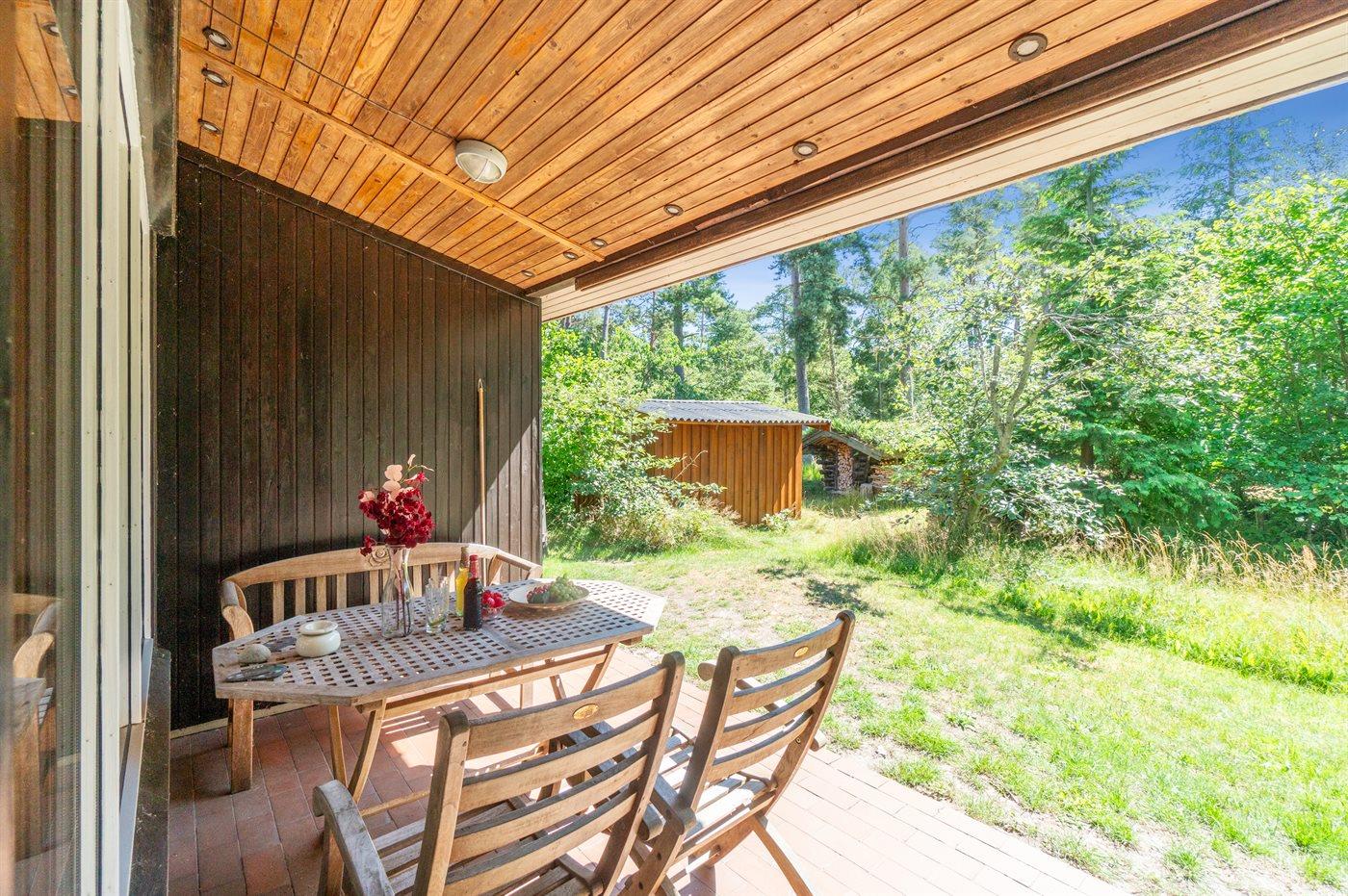 Huset omgives af flere terrasser, delvis overdækkede, så det altid er muligt at finde læ. Den store naturgrund er delvis bevokset af forskellige træer, men der også gode legemuligheder - endda plads til boldspil, så man kan få lidt adspredelse under ferien.