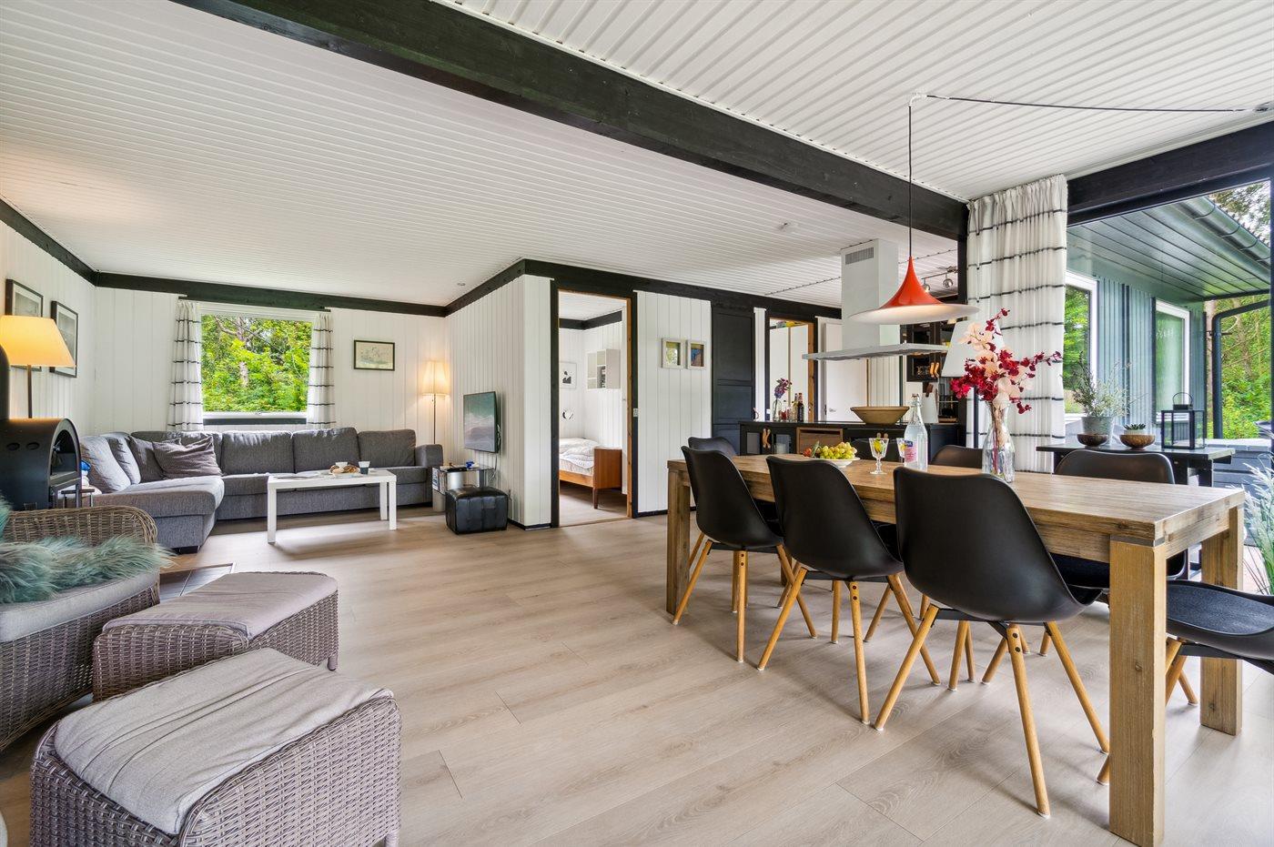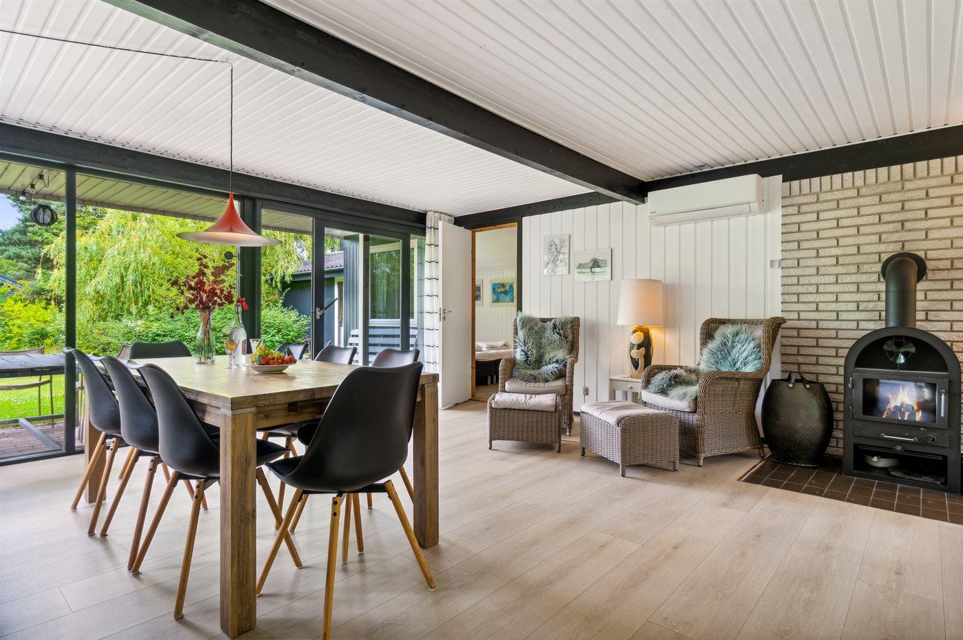 Den store opholdsstue med åben køkkenafdeling og udgang til en skøn overdækket terrasse er istandsat i 2020 og virkelig godt indrettet, så der er plads til alle. Badeværelset er ikke stort, men er funktionelt og velindrettet. Der er fire hyggelige soveværelser i huset.