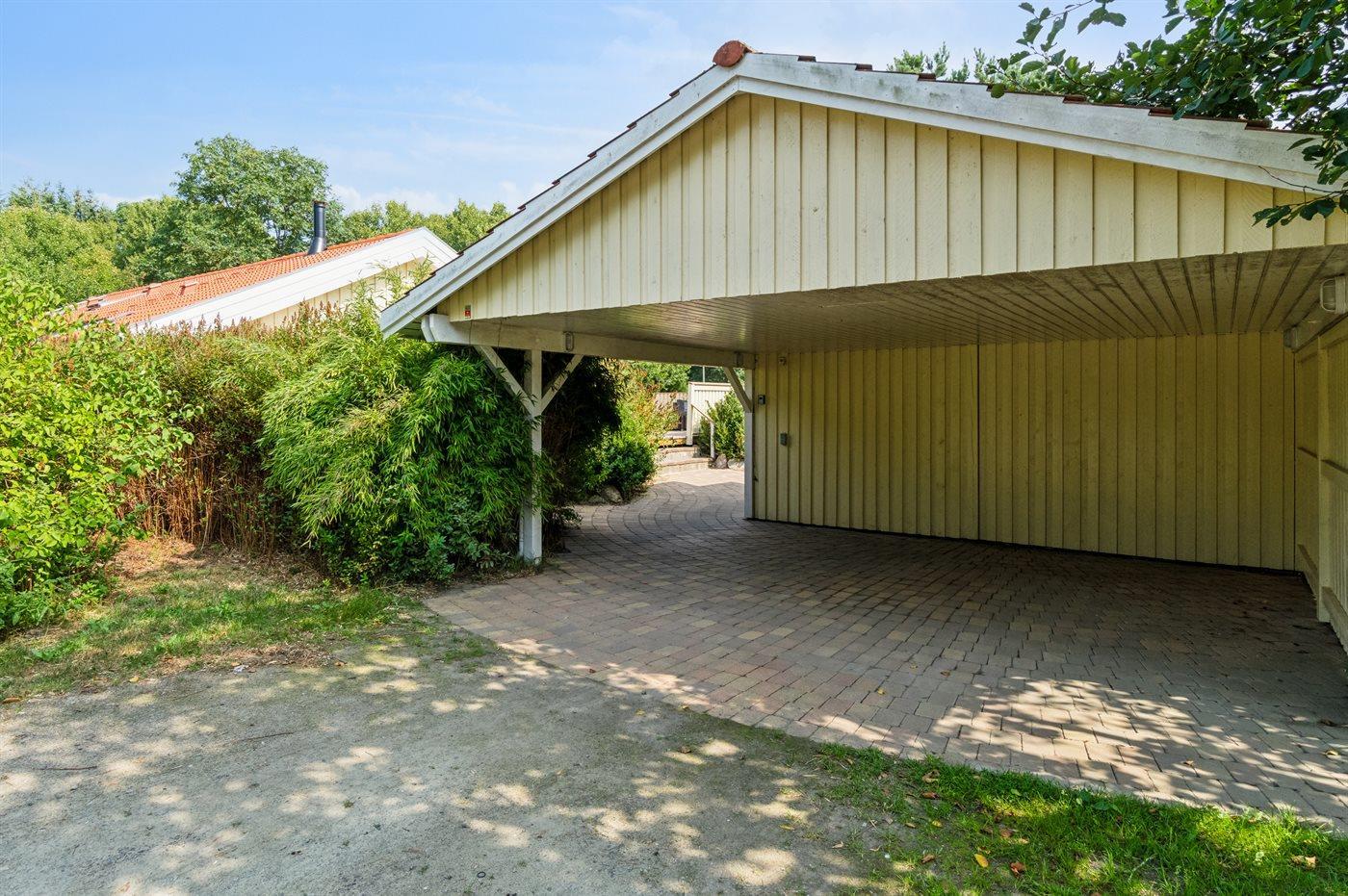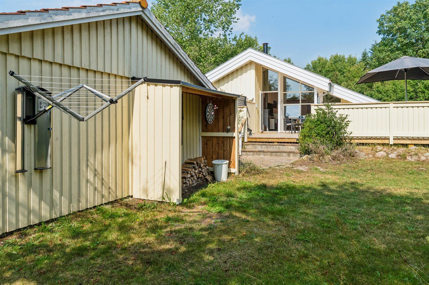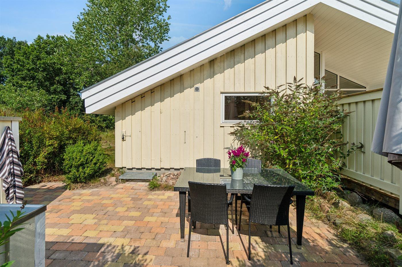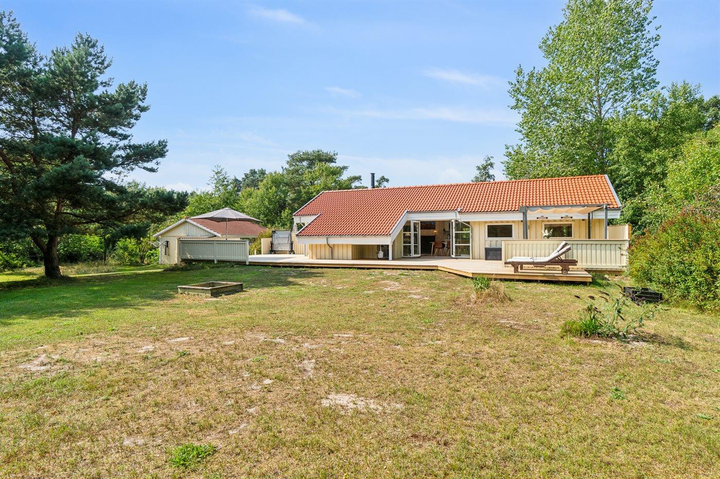 Ferieboligen er beliggende på en 2000 m² stor naturgrund. Der er 300 m til havet. Nærmeste forretning er beliggende i en afstand af 3000 m. Til ferieboligen hører åbent terrasseareal. Desuden er der overdækket terrasse. Der er redskabsrum. Gynge. Sandkasse. Udendørs bruser. Der er mulighed for at tilberede maden udendørs i udekøkkenet. Grill til rådighed. Der er carport til rådighed. Der er installeret stik til opladning af elbil. Parkering ved ferieboligen.