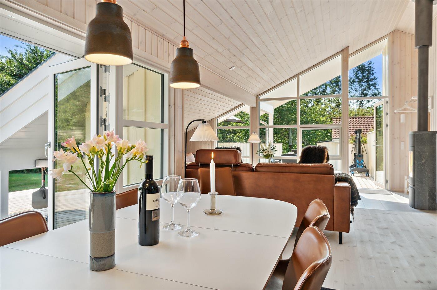 Huset er bl.a. indrettet med en stor og lys stue med flot lysindfald fra vinduespartierne - kvalitetsbevidst og afstemt møbleret og en rummelig køkkenafdeling, hvor det er let at bevare overblikket og betjene de moderne køkkenredskaber med blandt andet vinkøler. Her er er plads til alle og man kan være fælles om at tilberede lækre måltider.