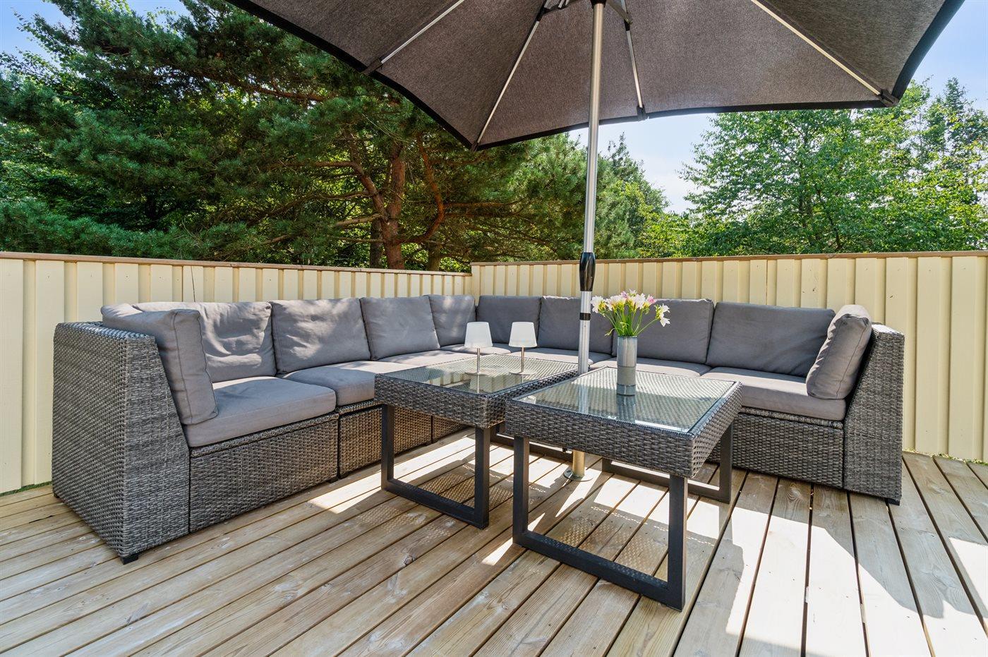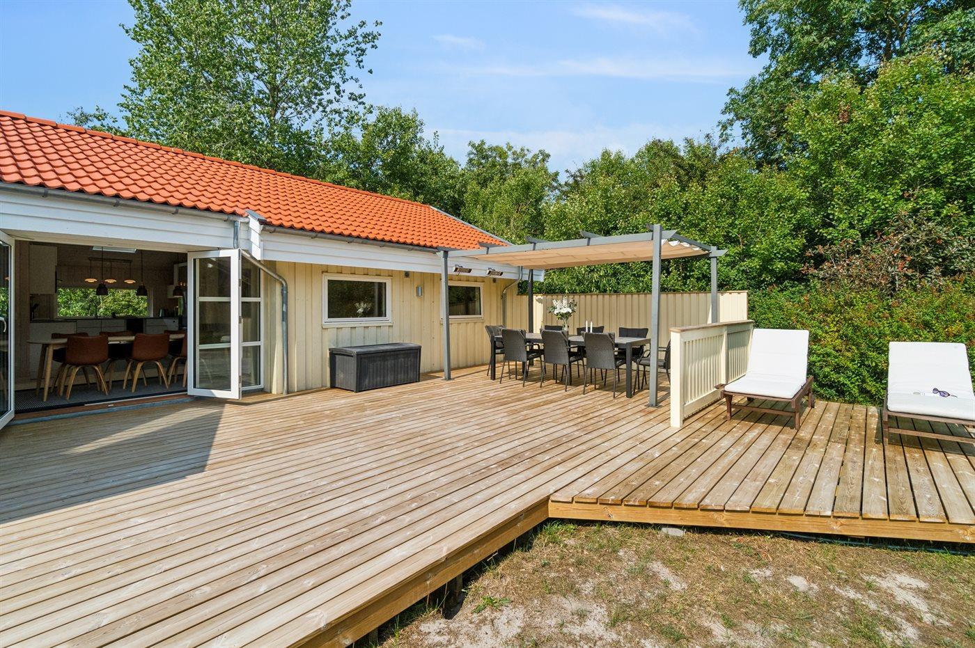 Meget store træterrasser, hvoraf en del er og kan overdækkes omgiver en stor del af huset og er delt op i afdelinger, men hvor hovedterrassen ligger ud mod det åbne areal, der giver en god fornemmelse af naturen og de rolige omgivelser i det fredelige sommerhusområde - nær de gode sandstrande.