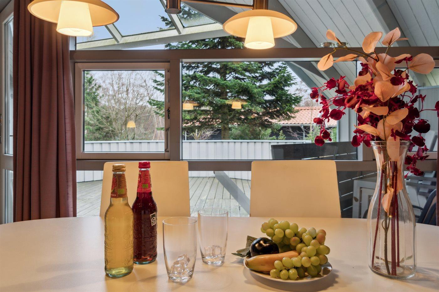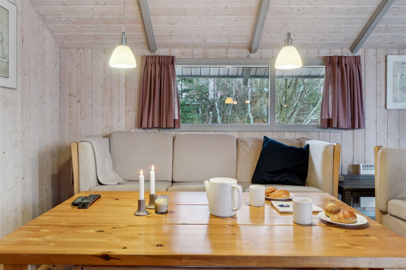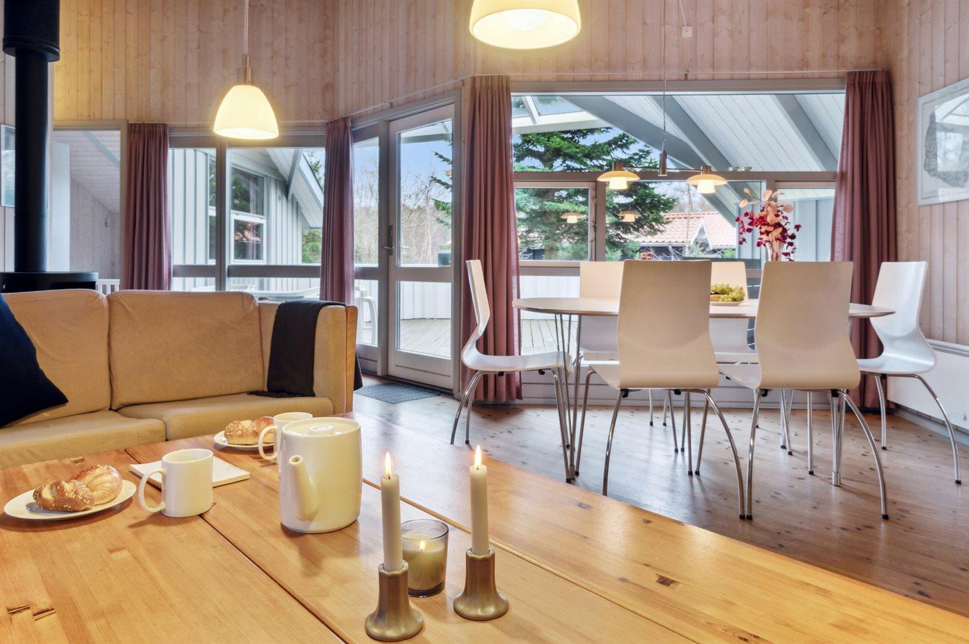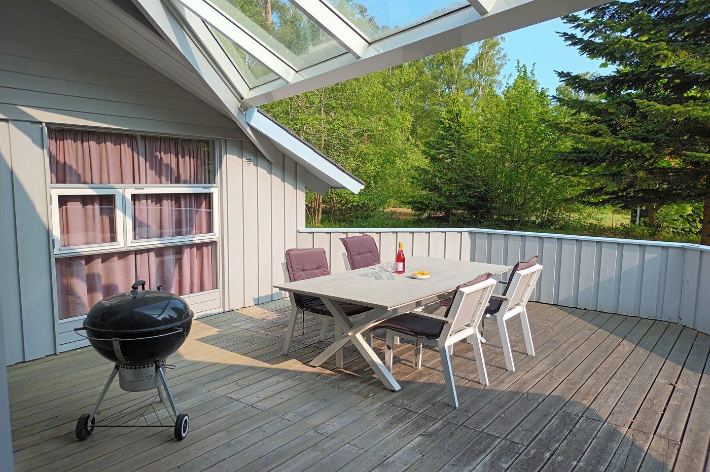 Feriehuset er omgivet af en grund med plæne omkranset af træbevoksning, så man ugeneret kan nyde den delvis overdækkede træterrasse, der er lettere afskærmet. I bryggers/entré er der både vaskemaskine og tørretumbler, og man træder derefter ind i et velfungerende køkken, der er indrettet, så man kan udføre sine sysler, mens familien kan nyde opholdet i den store stue, hvorfra der er direkte udgang til terrassen.
