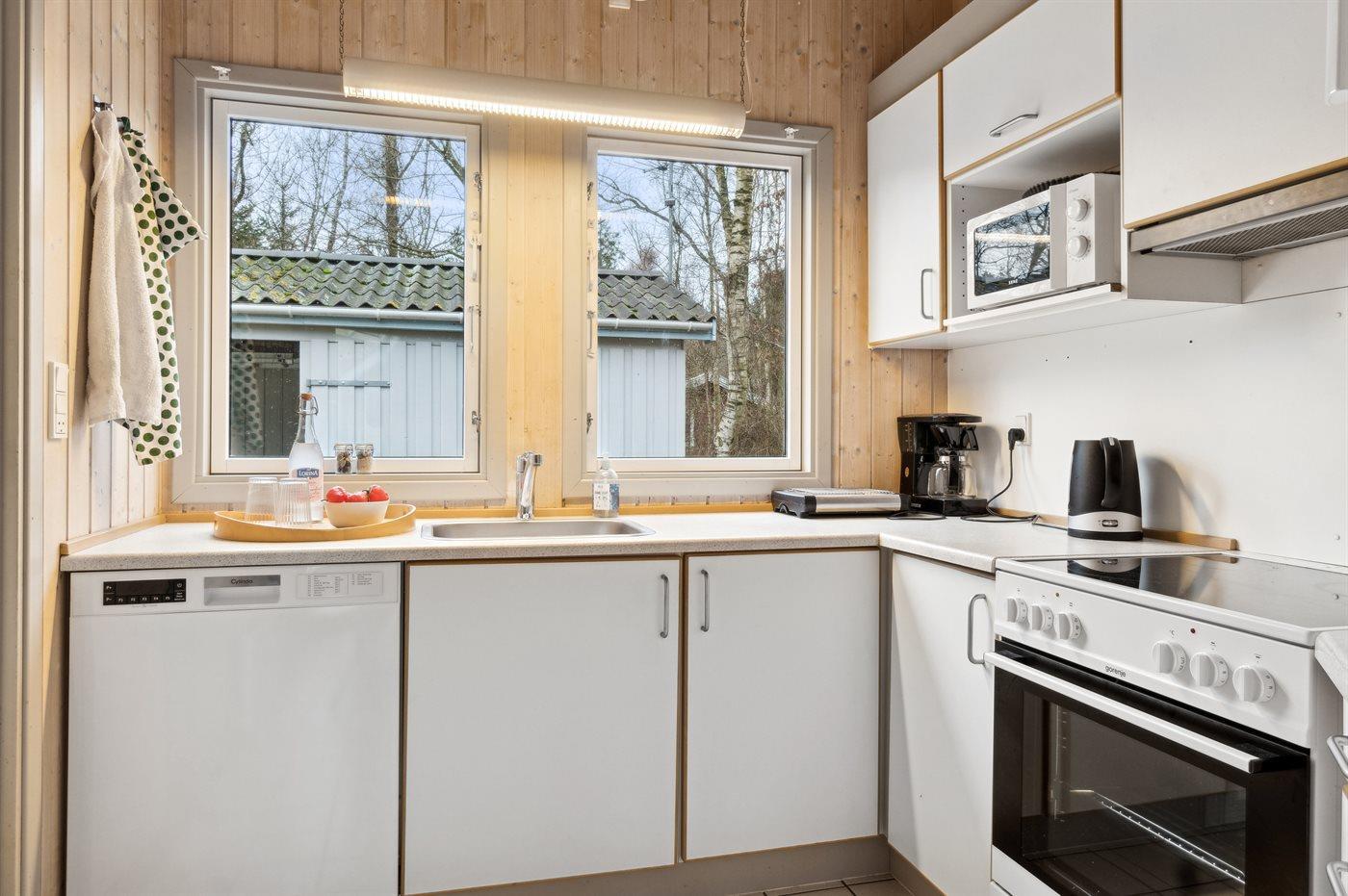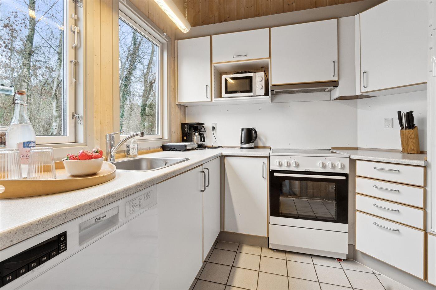 Køkkenet er udstyret med 1 køleskab. Der er 4 keramiske kogeplader, varmluftovn, mikrobølgeovn samt opvaskemaskine.