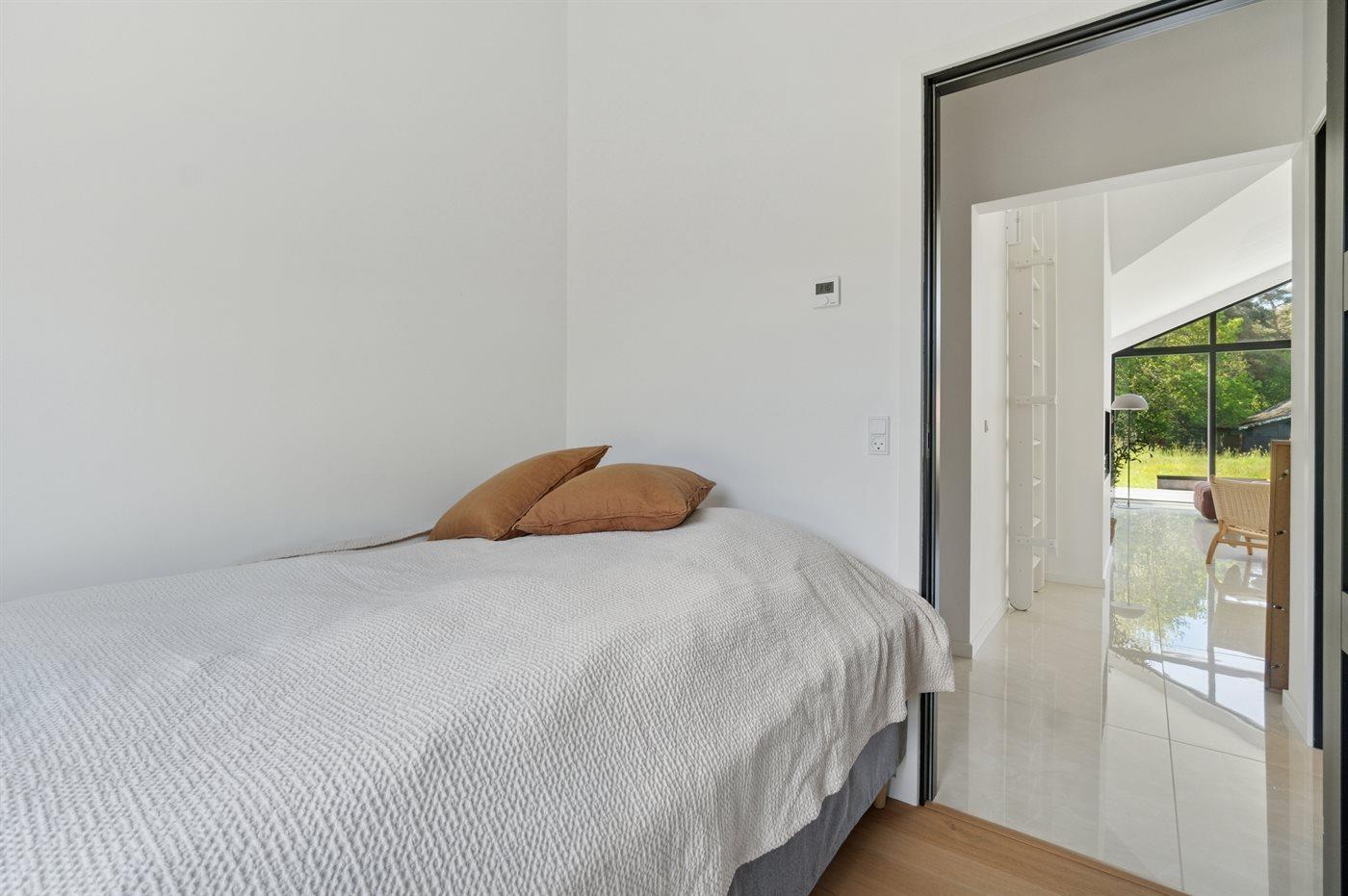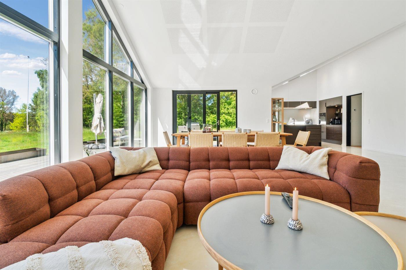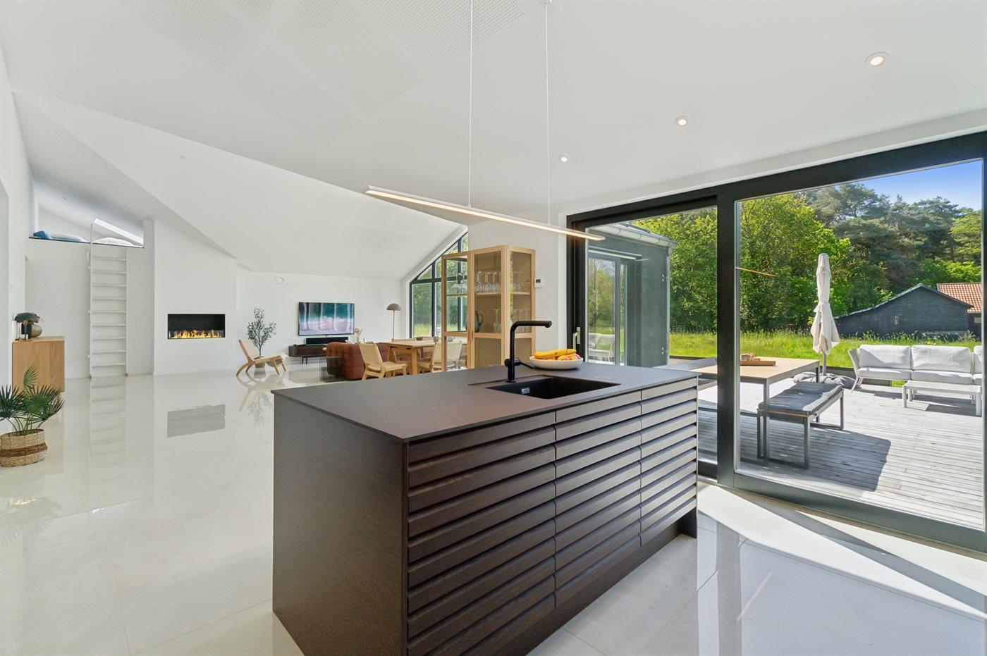 Dette dejlige sommerhus er indrettet med en overdådig opholdsstue med det fineste marmorgulv i lys nuance, der i kombination med de hvidpigmenterede vægge og lofter til kip og store panoramavinduer ud mod den store træterrasse, byder på et moderne sommerhusdesign, hvor gæstens velvære står i centrum.