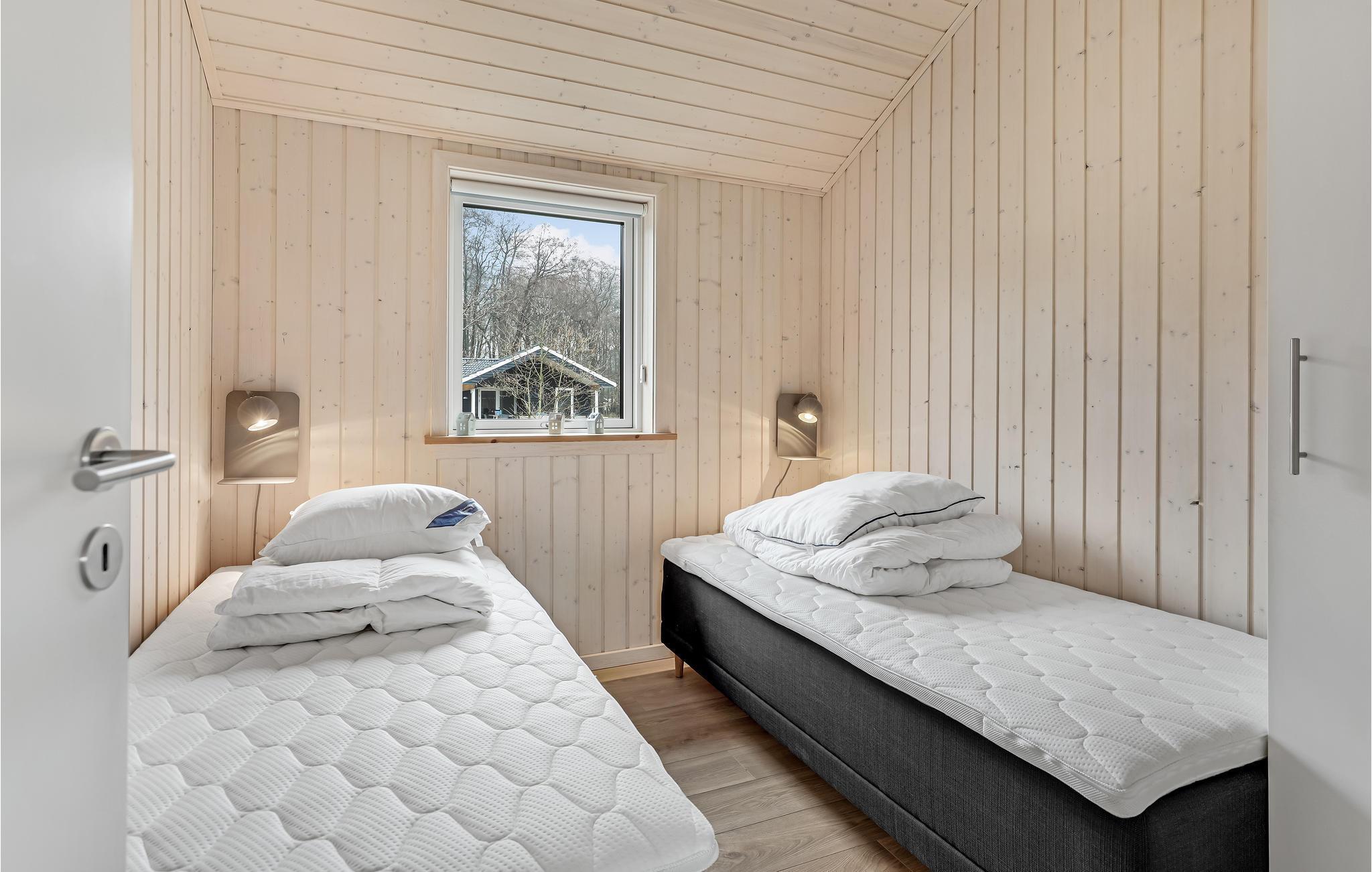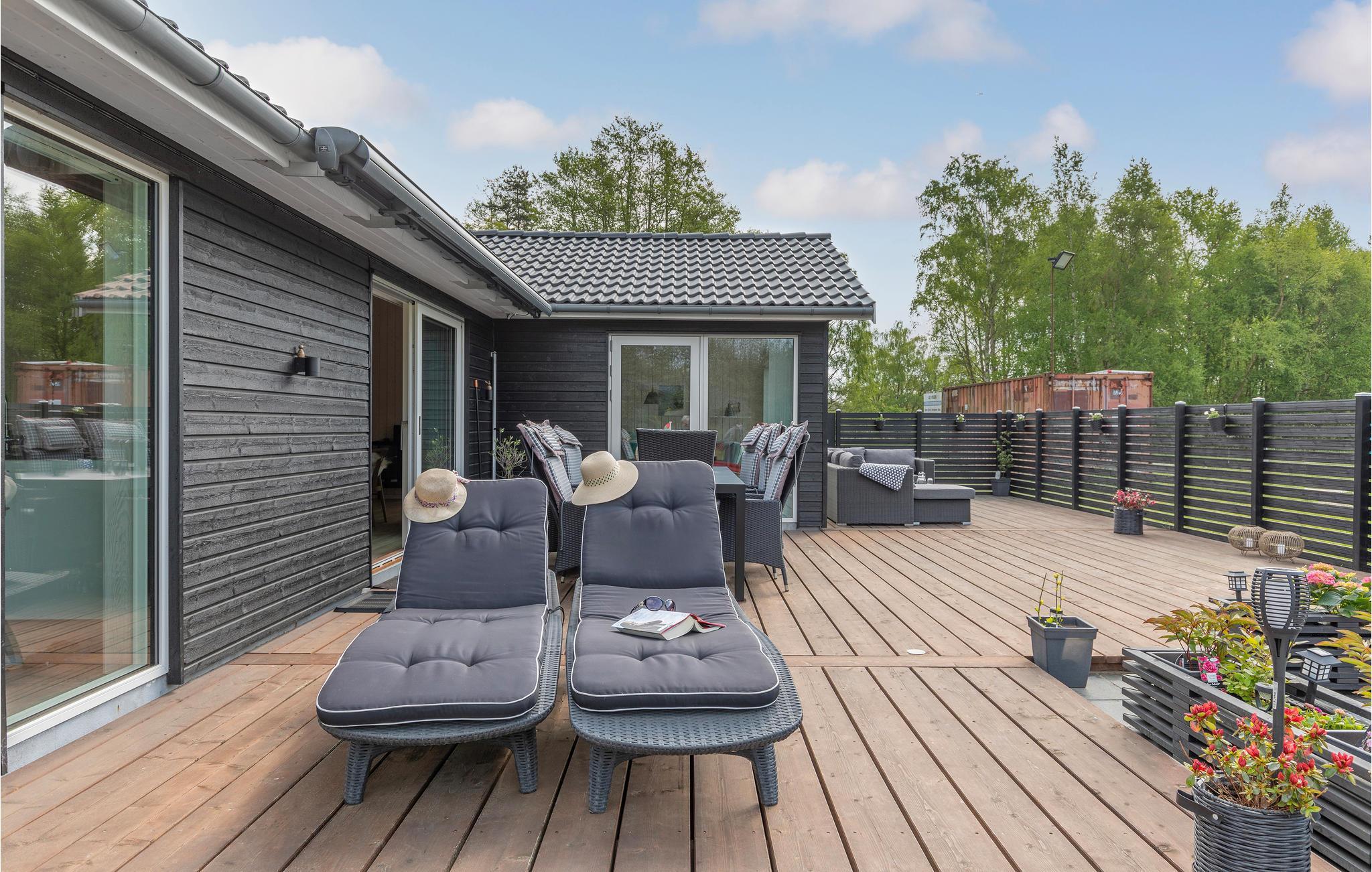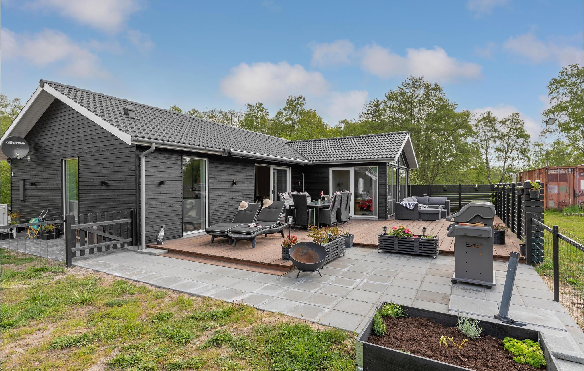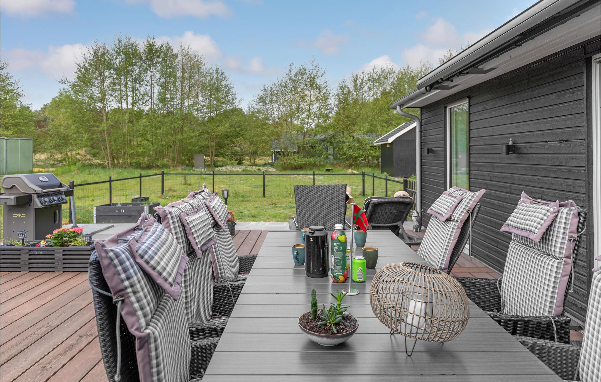 Der er fred og idyl på denne skønne feriegrund, som ligger omkranset af træer og har kort afstand til stranden. Boligen er lys og moderne med enkle stilvalg, så her er der gode rammer til at slappe af for hele familien. De store vinduespartier lukker det naturlige lys ind i boligen og giver jer adgang til den behagelige udsigt overalt i huset. Nyd dagens måltider, mens I kigger ud på de grønne omgivelser. Når I vender hjem efter en lang dag med udflugter og strandliv, kan I læne jer tilbage i stuen og fylde tiden med brætspil, bøger og gode snakke.