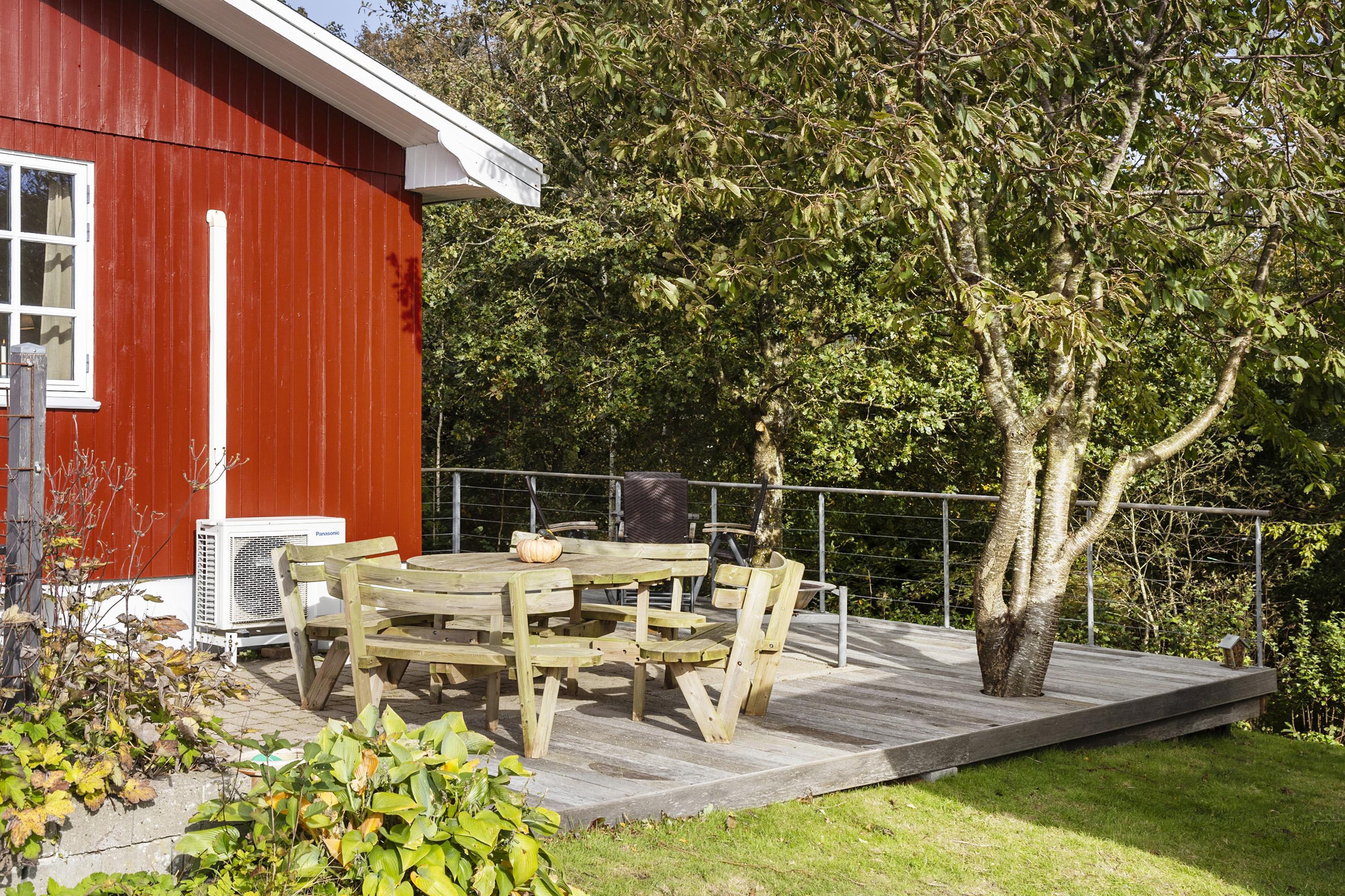 Huset er omgivet af terrasser med morgensol, middagssol og aftensol. Der er et udekøkken og grill. Ved bålstedet i den lille skovhave kan man lave fx skumfiduser, popcorn eller snobrød. For de aktive er der en trampolin i haven, og går man ned til stranden, er der en sansegynge og fodboldbål.
