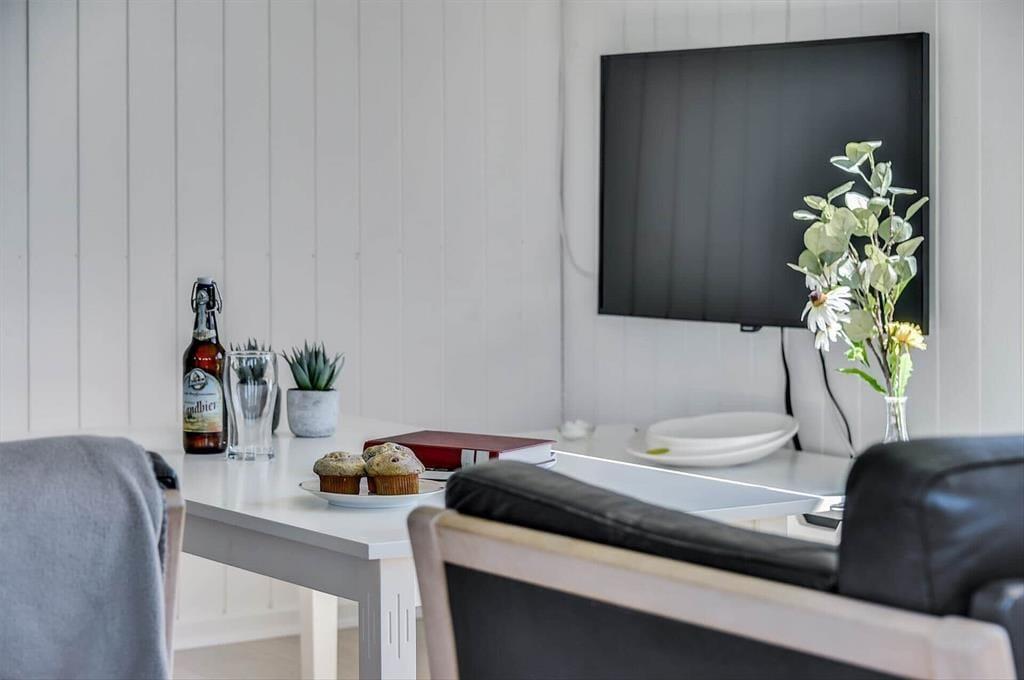 Indenfor mødes du af en varm og indbydende atmosfære, hvor hyggen straks melder sin ankomst. Sommerhuset er indrettet i en enkel og charmerende stil, der understøtter følelsen af ferie og nærvær. Her er plads til at trække stikket og nyde hinandens selskab – uanset om I samles omkring spisebordet til lange måltider, eller slapper af i opholdsrummet med en god bog og en kop kaffe. De lyse omgivelser og de velplacerede vinduer lukker dagslyset ind og giver en fin forbindelse mellem inde og ude. Efter en dag fyldt med oplevelser kan du finde ro og lade stilheden sænke sig, mens ferien leves i et tempo, hvor der er tid til det, der betyder noget.