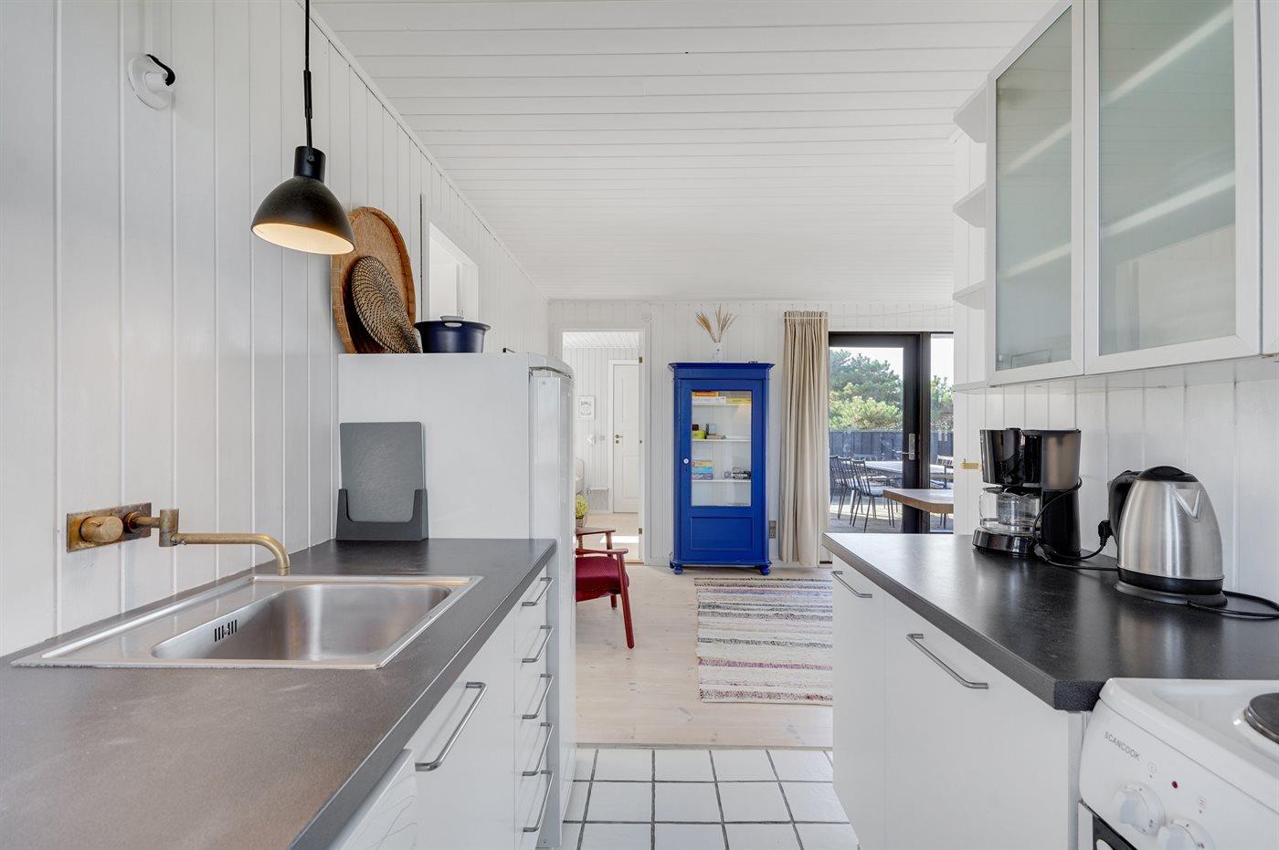 Køkkenet er udstyret med 1 køleskab. Der er 4 elkogeplader, miniovn, bageovn, mikrobølgeovn samt opvaskemaskine.