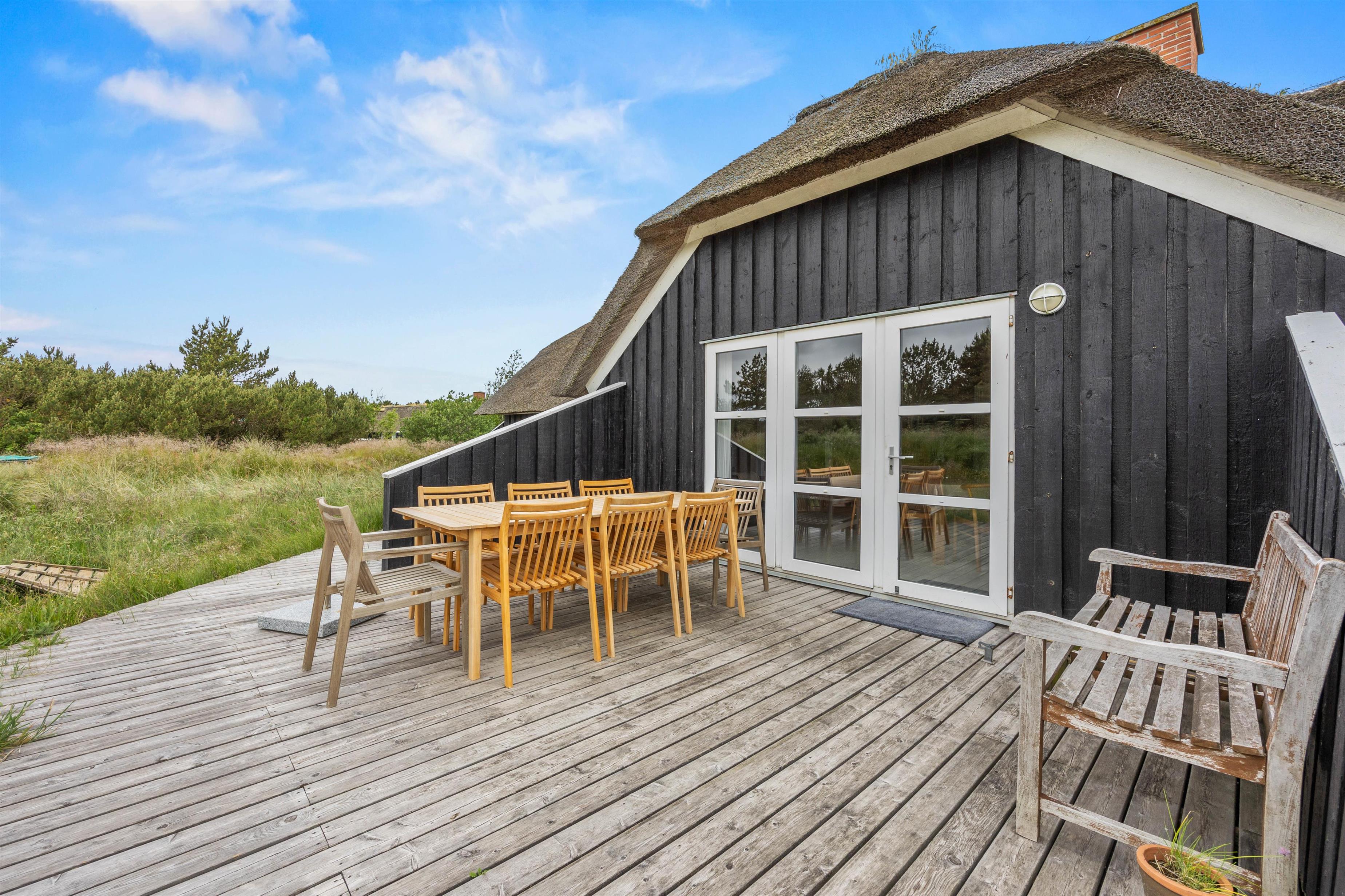 Udendørs finder I en sandkasse og en trampolin, som vil glæde børnene. Træterrassen ved feriehuset i Sønderho indbyder til afslappede timer i det fri. Her kan I hygge med at grille, nyde den friske luft og afslutte dagen med en god bog eller et glas vin. Det er det perfekte sted at opleve naturen tæt på.