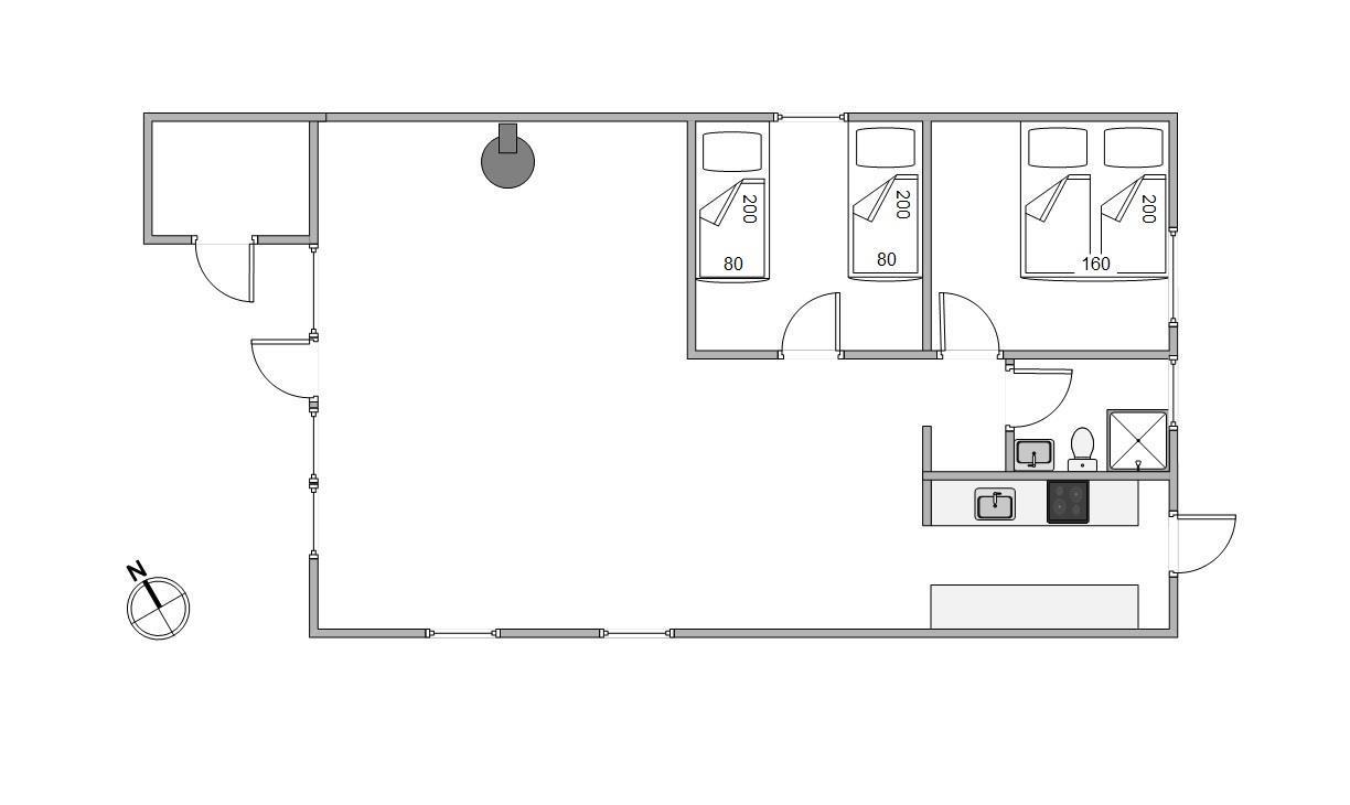 I får her 2 gode soveværelser, hvoraf et er med en ny 160x200cm dobbeltseng fra 2022 og det andet med 2 gange 80x200cm enkeltsenge. Sommerhuset har 1 badeværelse med bruseniche.