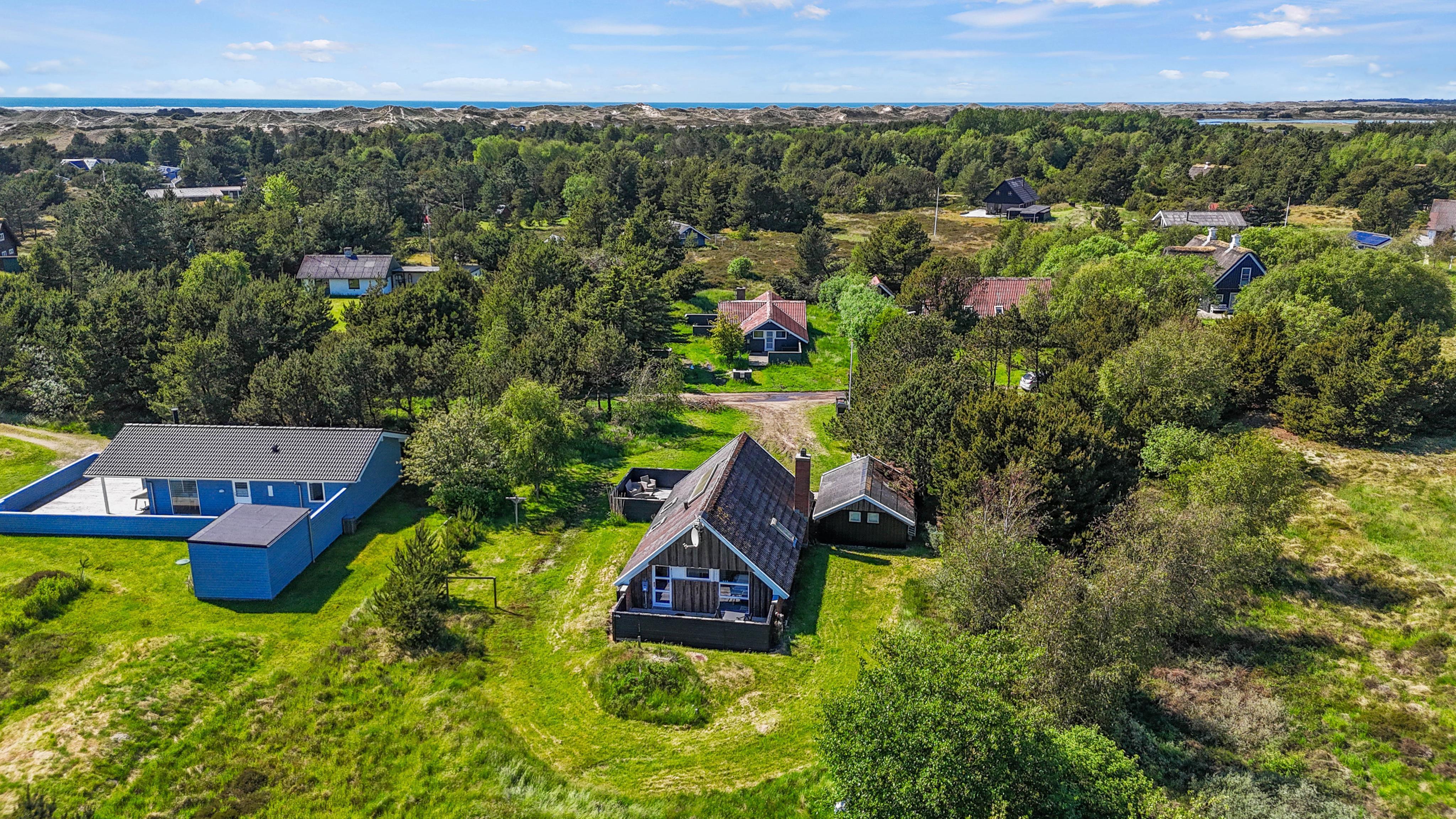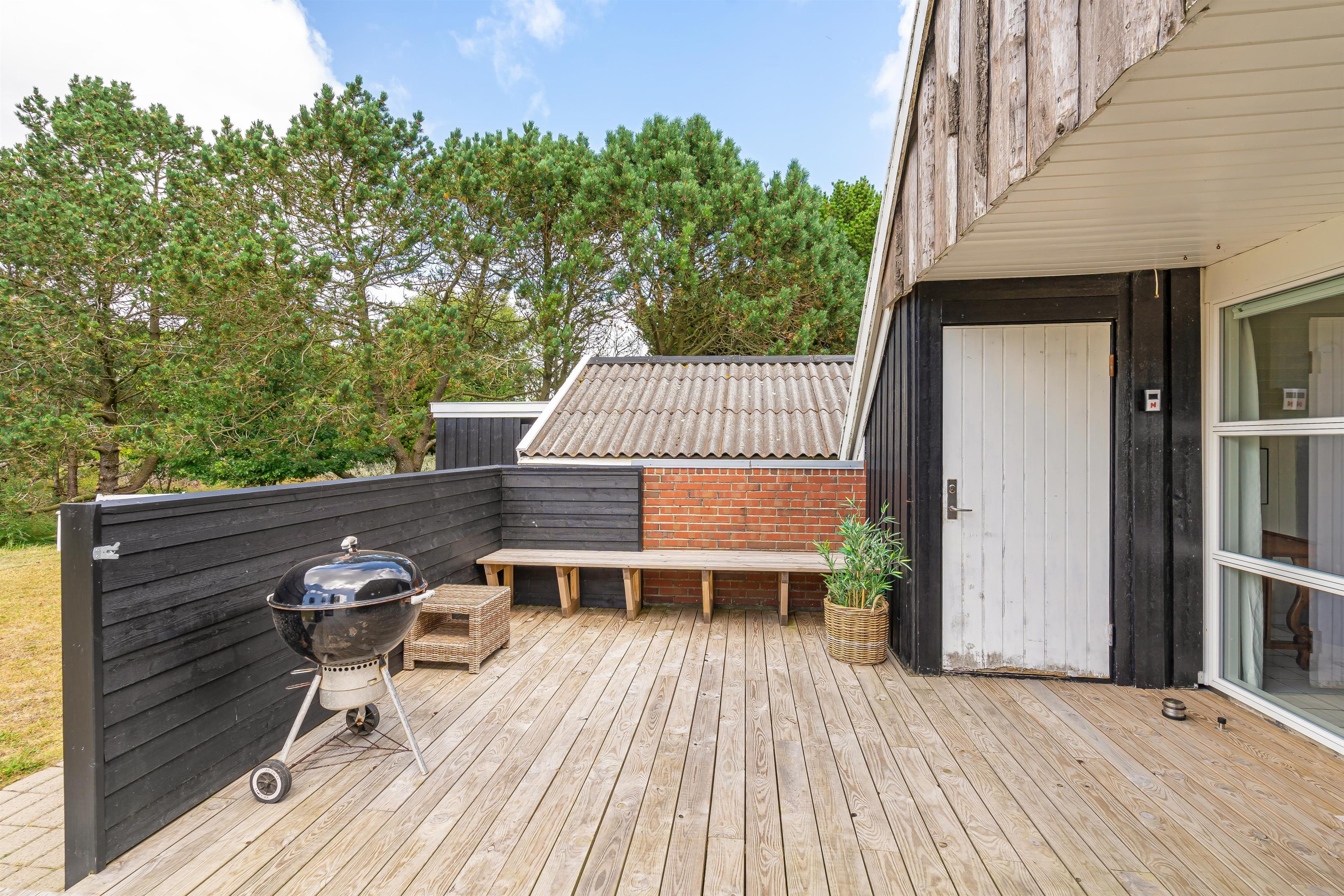 Uderummet ved feriehuset på Vesten Sandene 19 er godt udtænkt og udstyret. Foran huset har I den store delvist overdækkede terrasse, hvorfra I kan nyde solens sidste stråler. Her står både havemøbler, solvogne og grill til rådighed, så når dag bliver til aften, kan I samles her og tænde op i grillen, og nyde aftenen med god mad i hyggeligt selskab.