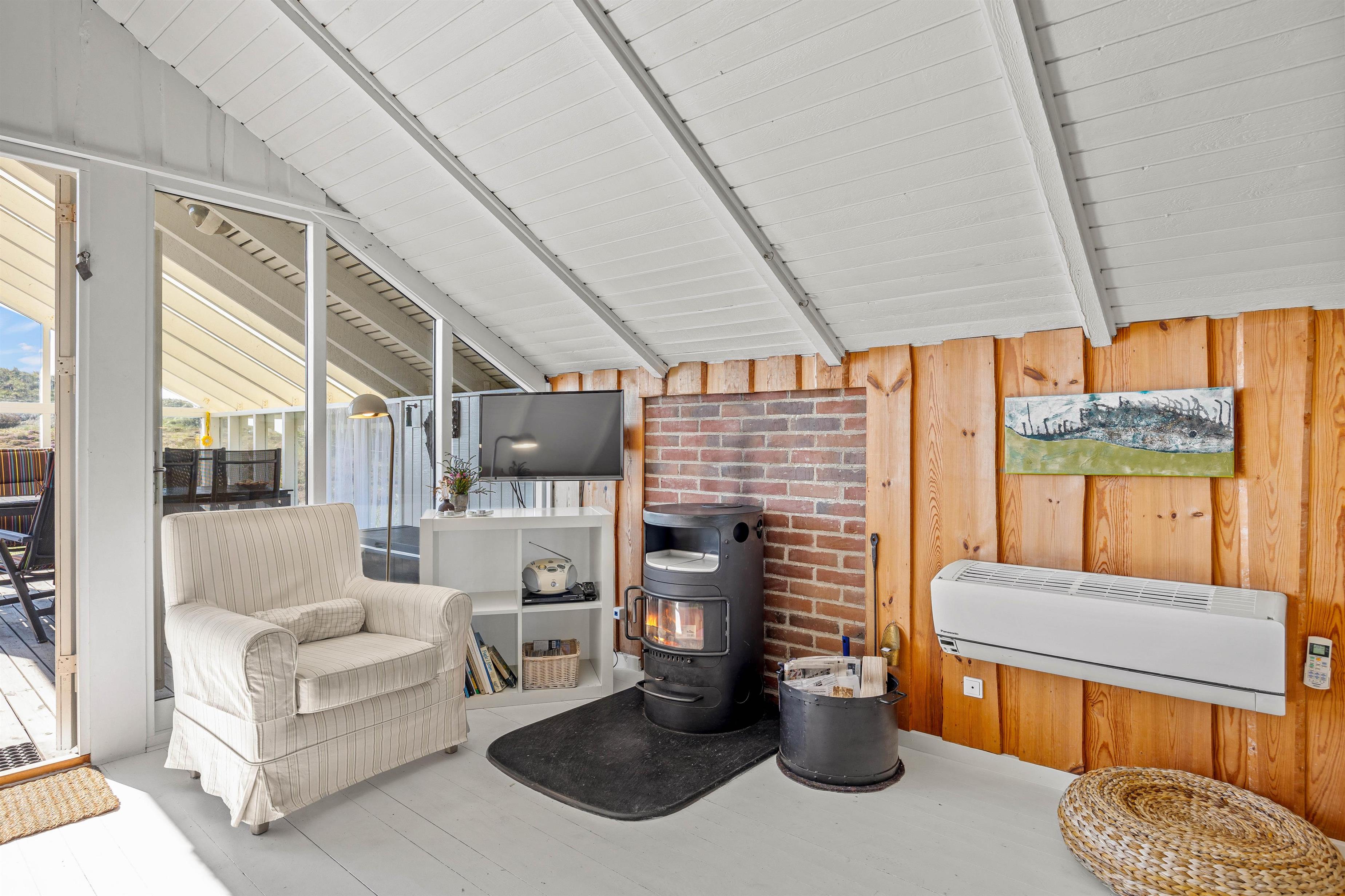 I det rummelige opholdsrum, hvor stue, køkken og spiseplads ligger i åben forbindelse med hinanden, kan I læne jer tilbage i den behagelige sofa og kigge ud af de store panoramavinduer mod den skønne natur omkring jer, alt imens brændeovnen spreder en dejlig varme og den rette hyggeatmosfære. I det veludstyrede køkken, venter jer desuden en opvaskemaskine, der letter oprydningen efter madlavningen. Derudover er der her også en vaskemaskine tilgængelig, så I kan friske tøjet op inden ferien er forbi.