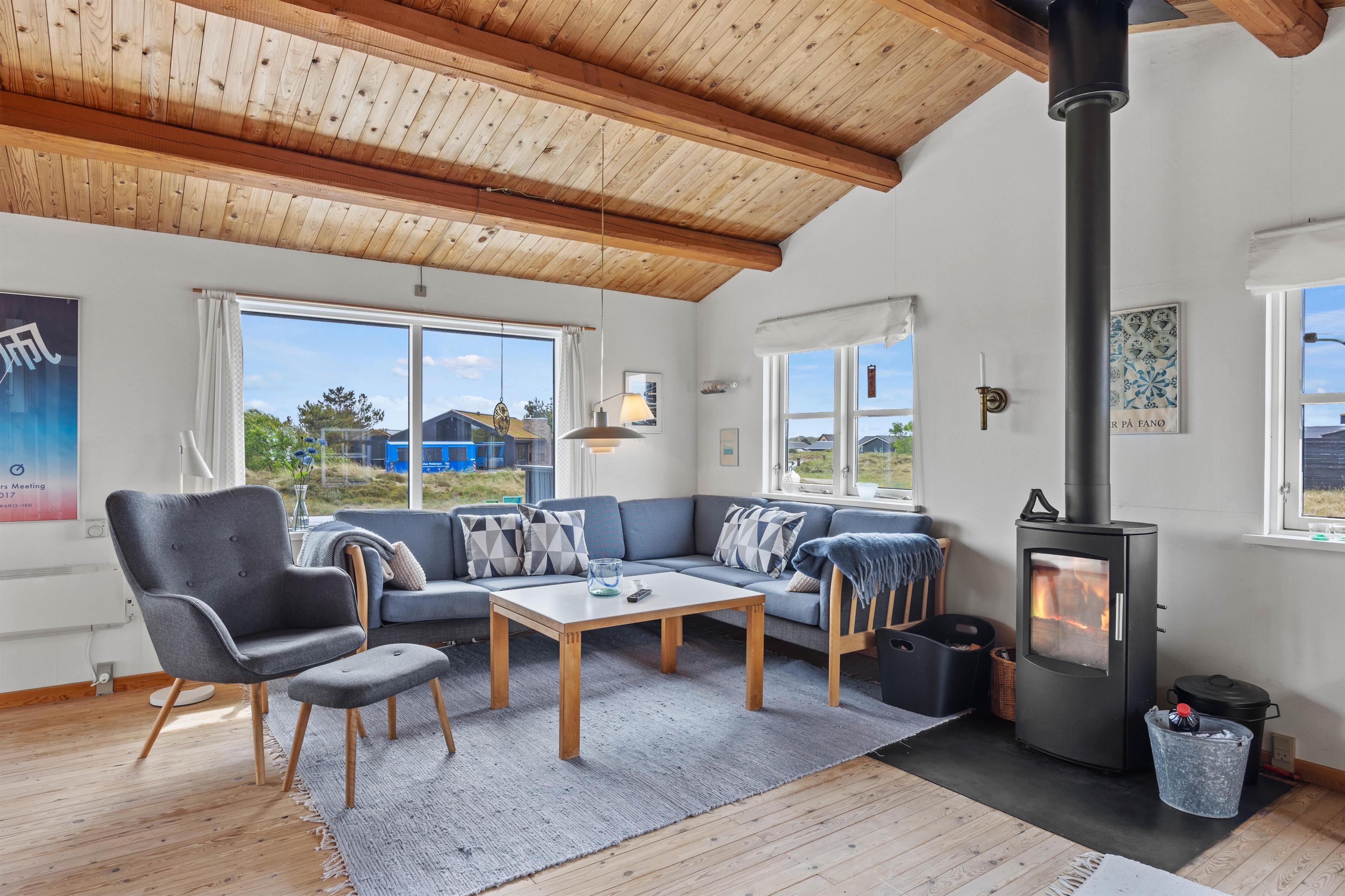 Indenfor byder sommerhuset på en ægte oase af ro og afslapning. Den hyggelige opholdsstue er udstyret med en komfortabel sofa, fjernsyn med danske kanaler og en stemningsfuld brændeovn. Her kan I nyde afslappede aftener med en god bog, en kop varm kakao eller et glas vin, mens flammerne fra brændeovnen knitrer i baggrunden og skaber en dejlig varme. En energivenlig varmepumpe sikrer samtidig, at temperaturen altid er behagelig – uanset om det er en kølig vinterdag eller en varm sommeraften.
