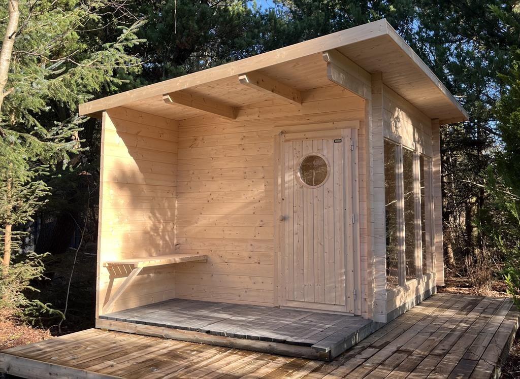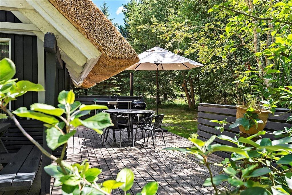 Både syd, vest og øst for sommerhuset er der anlagt fine terrasser, så det er nemt at finde en dejlig solskinsplet på alle tider af dagen. I kan også slå jer ned på græsplænen eller vælge en skyggefuld plads i den ugenerede have – for eksempel i hængekøjen under træerne eller på terrassens overdækkede areal. Udover havemøbler, liggestole og parasol er der en grill til rådighed, og der er sågar installeret et udekøkken, hvis hele aftensmåltidet skal tilberedes ude i det fri.