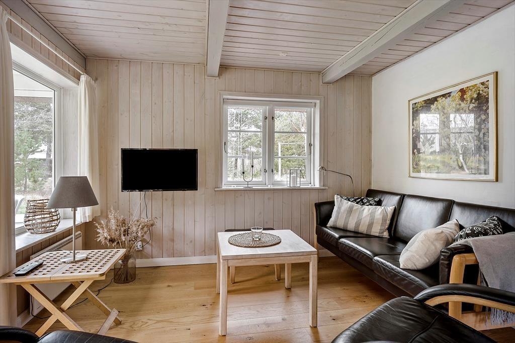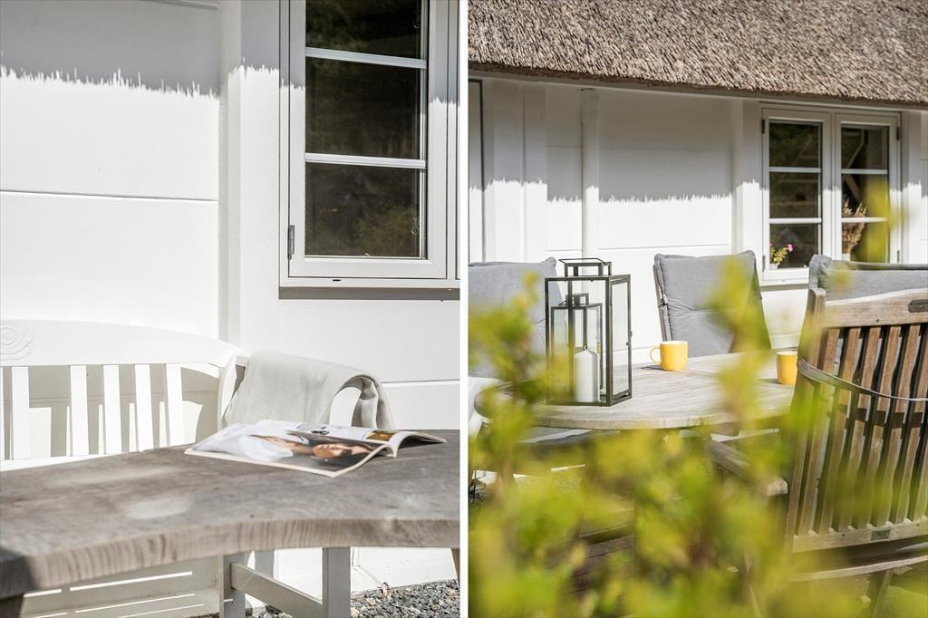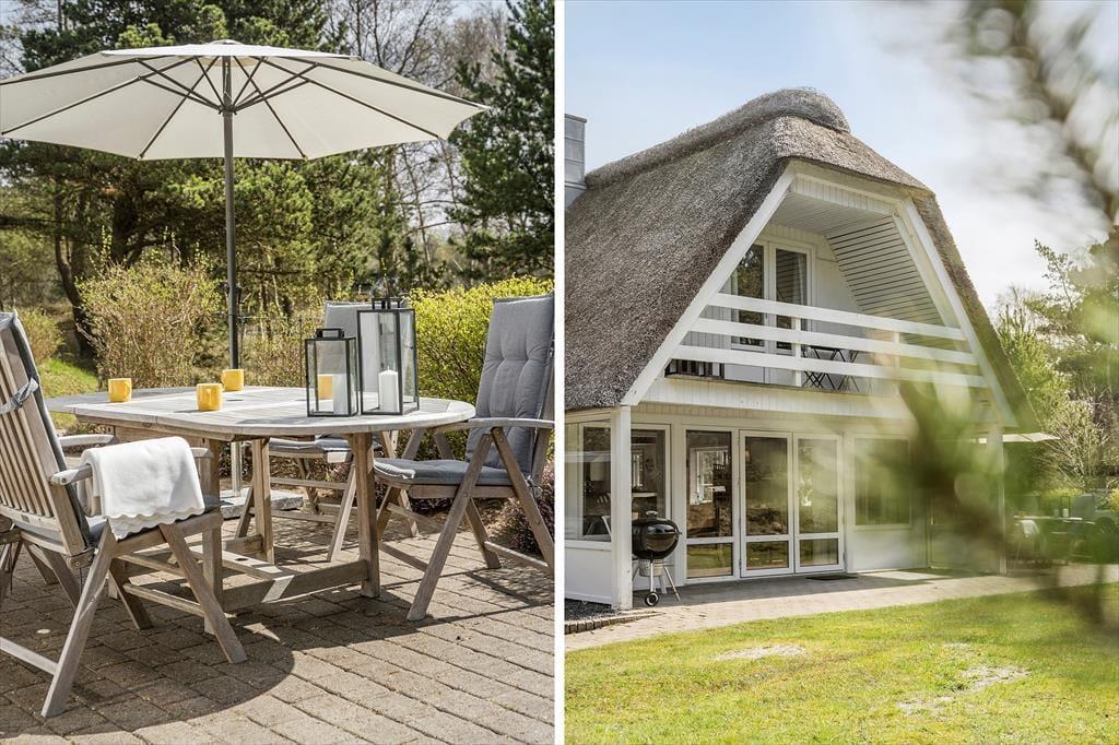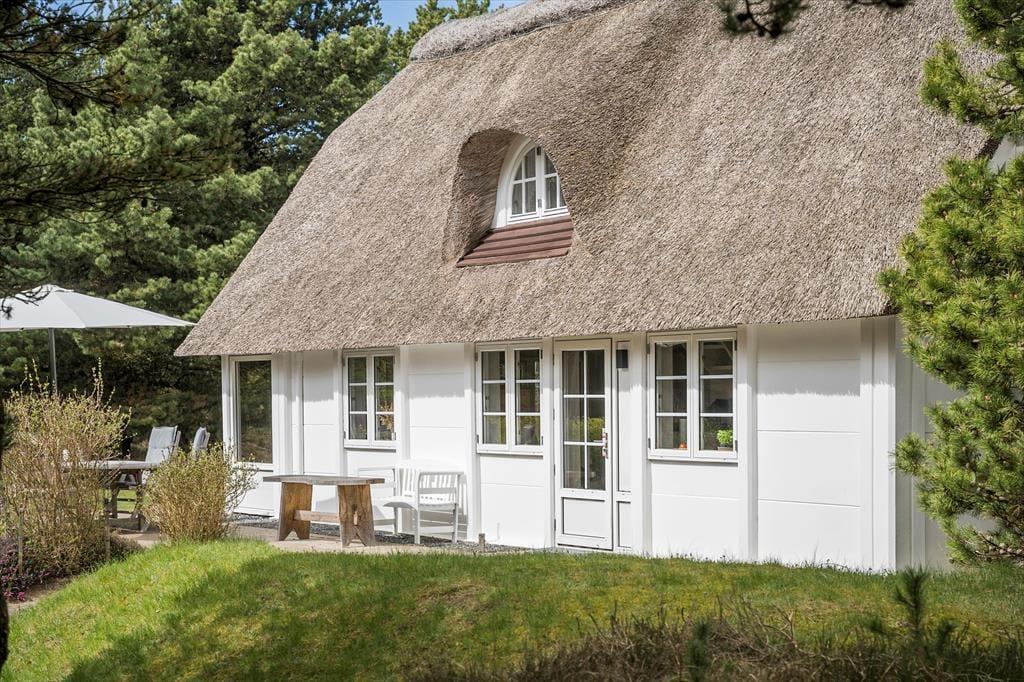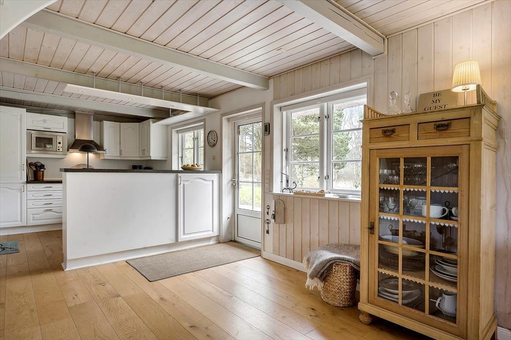 Det stråtækte sommerhus er gennem årene blevet renoveret løbende, og hele vejen igennem har der været øje for at bevare husets sjæl og charme. Derfor er der eksempelvis stadig synlige loftsbjælker i den stemningsfulde stue – samtidig med at rummet er moderniseret med varmepumpe, en veludstyret køkkenafdeling og pænt møblement. Når I slapper af i sofaen nær brændeovnen, kan I nyde udsigten til haven, og måske ser I endda et rådyr eller en fasan, der kommer trippende forbi i det grønne. I stueplan hører et soveværelse og et badeværelse også med til planløsningen, mens førstesalen byder på yderligere to soveværelser og et toilet.