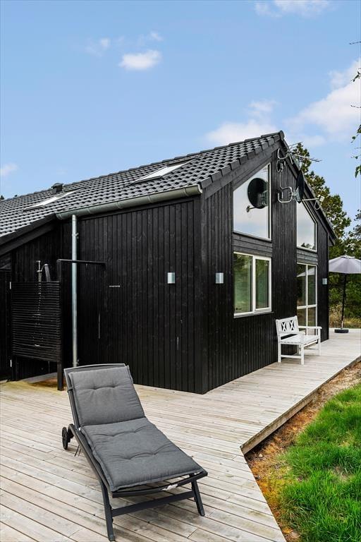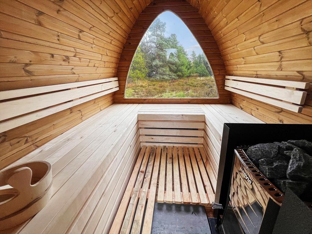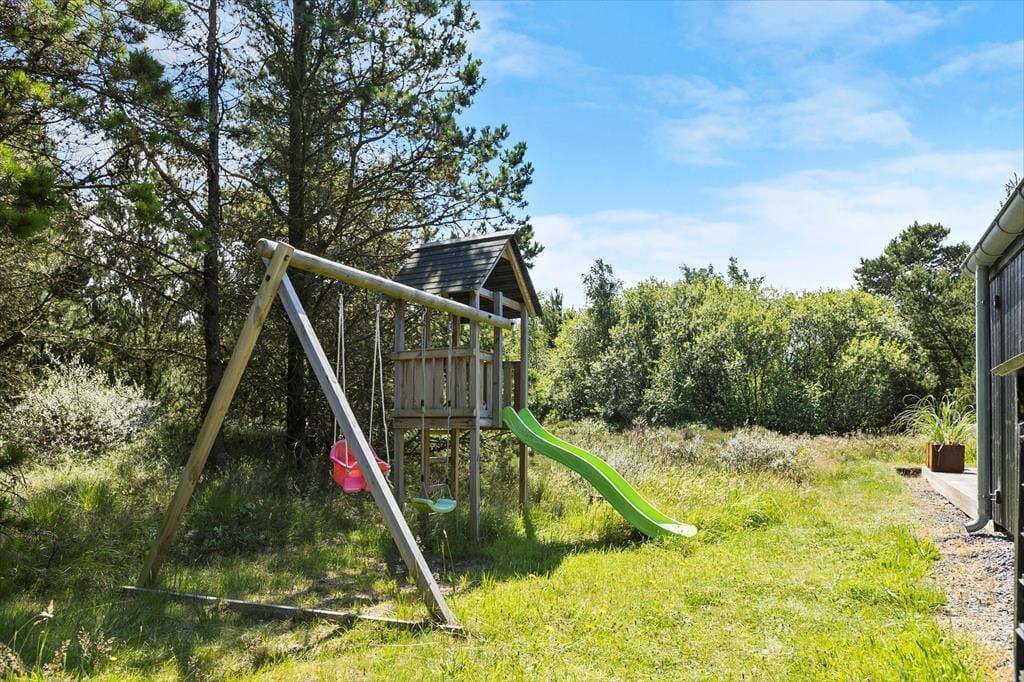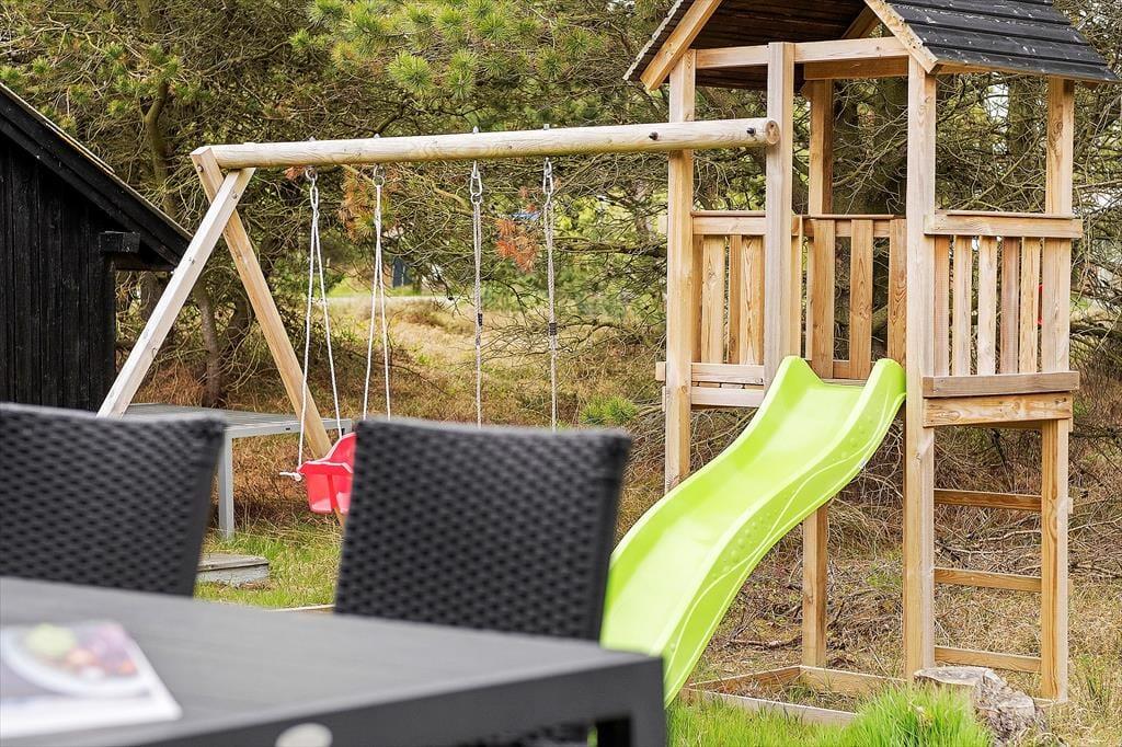 De fornemme ferieforhold fortsætter ude i det fri, hvor et stort terrassemiljø breder sig rundt om sommerhuset. På en sænket del af terrassen står et vildmarksbad, og der er også en afskærmet udendørsbruser, hvis I vil have et skyl under åben himmel. Det fine udendørsområde råder desuden på en dejlig udesauna og et koldtvandskar, som giver mulighed for forfriskende oplevelser og afslapning i naturen. Terrassen byder på både åbne og overdækkede arealer, og uanset hvor I sidder, har I god kontakt til den smukke naturgrund. Til børnene er der legestativ med gynger og rutsjebane, og endelig er der mulighed for at oplade elbilen, hvis I er kørt til Rømø i sådan én.