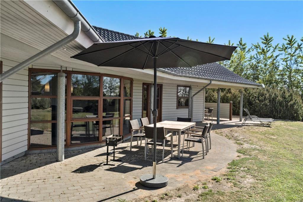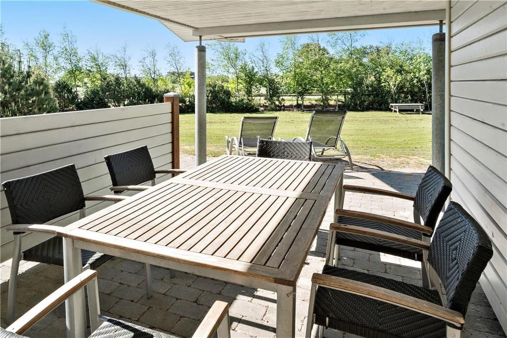 Hele vejen rundt om huset er der flisebelægning, og særligt mod syd udvider det sig til et lækkert terrassemiljø. Har du brug for skygge eller læ, kan du sætte dig på de overdækkede terrasseområder – og ellers er det herligt at slå sig ned i en liggestol og nyde solen, feriefreden og de naturskønne omgivelser. Grundens store græsplæne er perfekt, hvis du trænger til at røre dig, og der er endda to små fodboldmål, gynge og sandkasse til familiens legebørn.